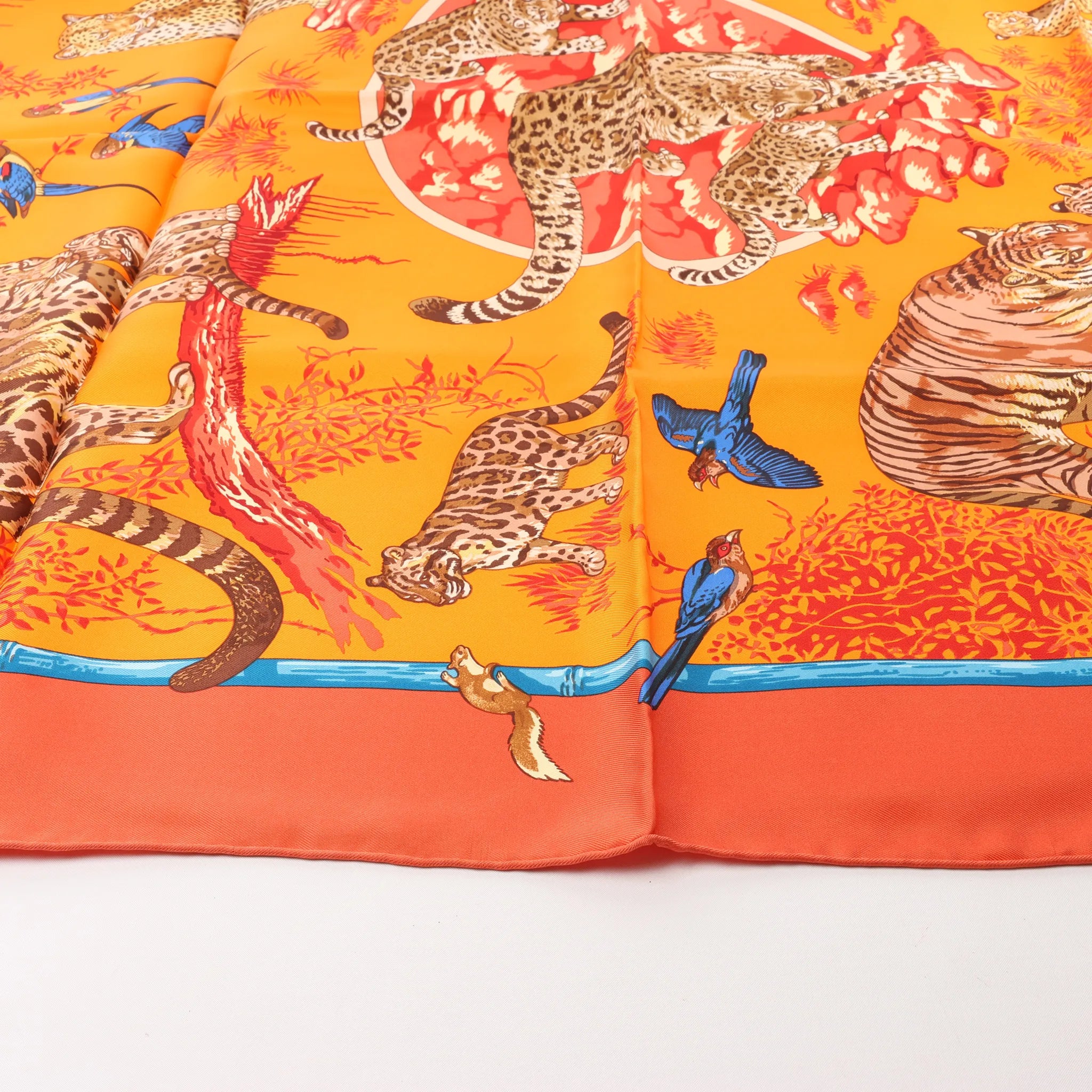 The Hermès Carré 90 "Tendresse Feline" in orange captures the wild charm of the animal kingdom. Crafted from luxurious silk, this vibrant scarf features playful big cats, birds, and jungle scenes—perfect for adding a bold and exotic touch to your look.