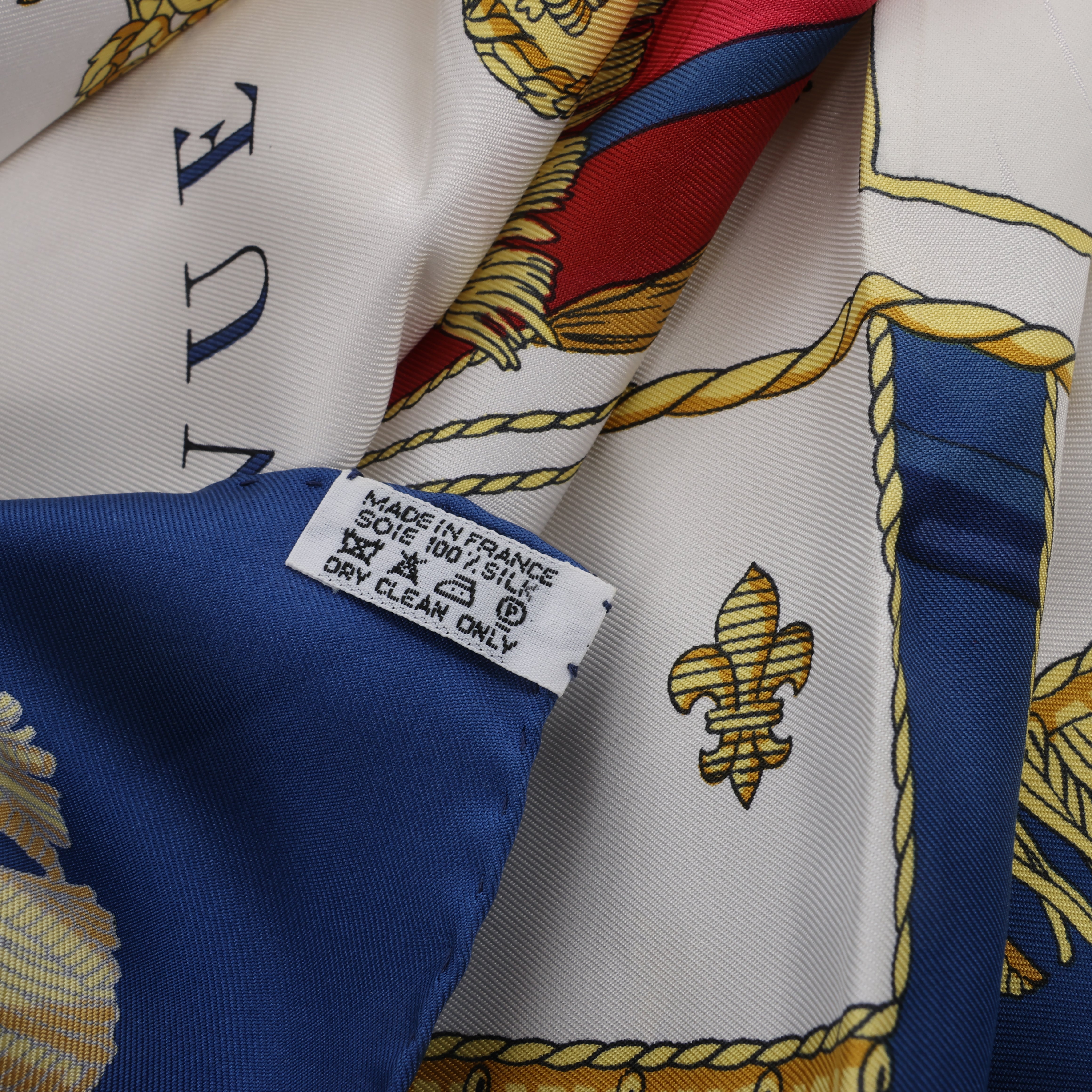 Brand: HermesModel: Carre 90Size: 90x90 cm Condition: ExcellentCondition Details: Visible creases, noticeable odor, discoloration, loose threads, and marked areas.Main Colour: Navy BlueColours: Red, Gold, BeigeMain material: 100% silkManufactured In: FranceComes With: Box