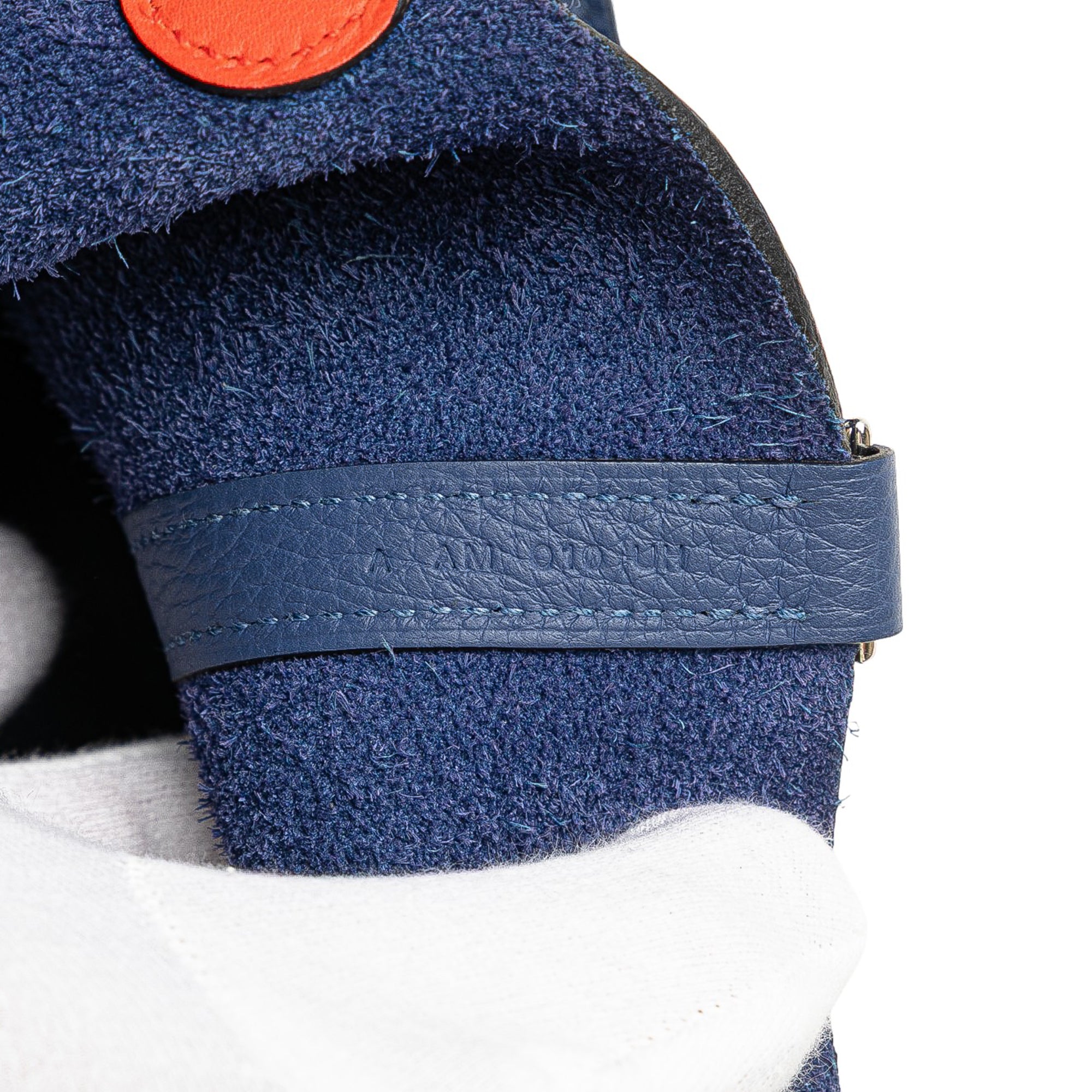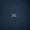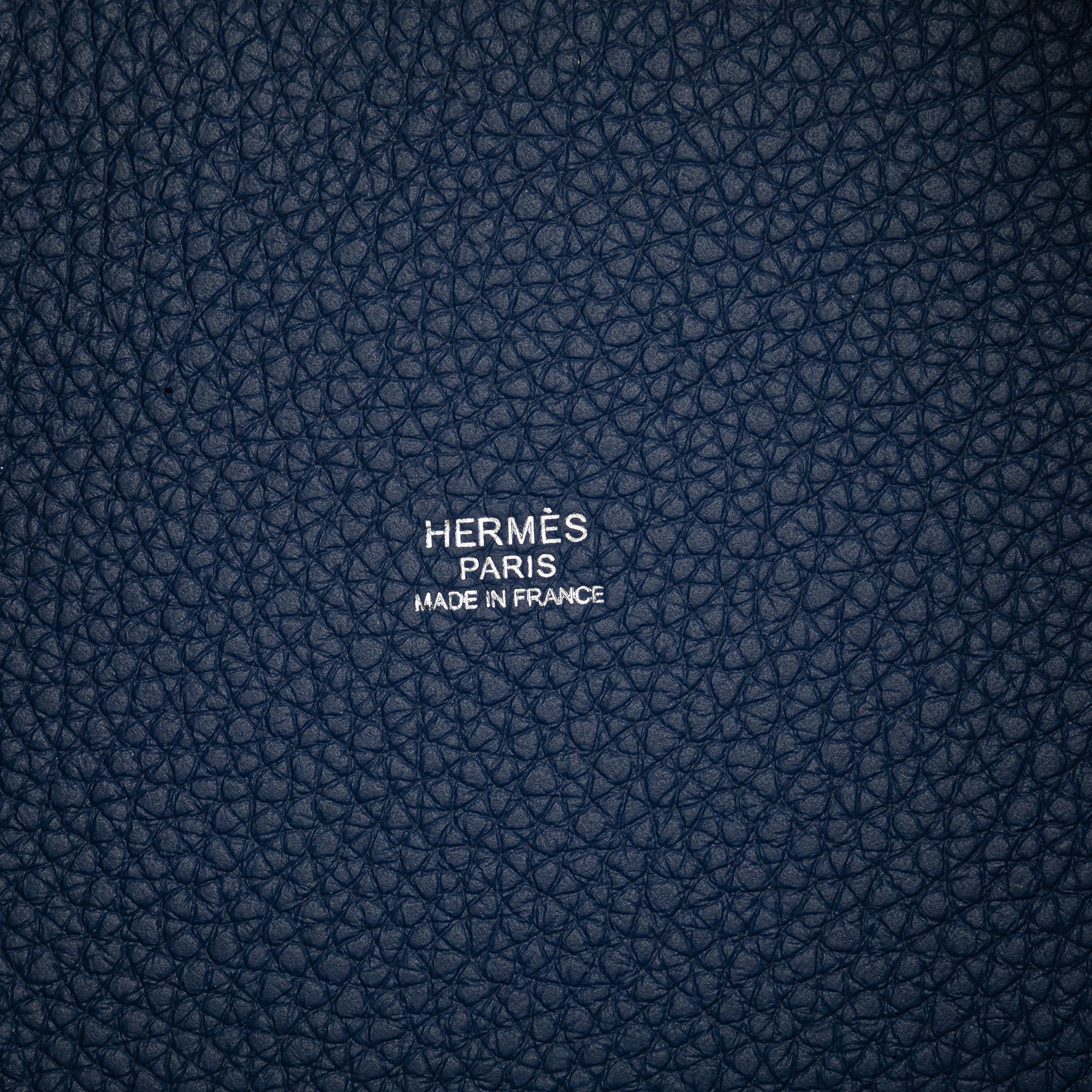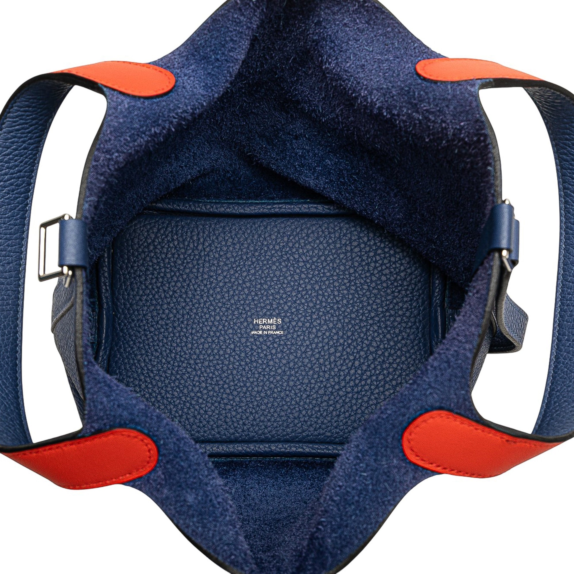 The Picotin Lock features a Clemence leather body in Bleu Brighton color and Swift leather trim in Capucine color, flat leather handles, and an open top with a pull-through strap closure. Inclusion: Dust bag. Retail Price: 4588.00