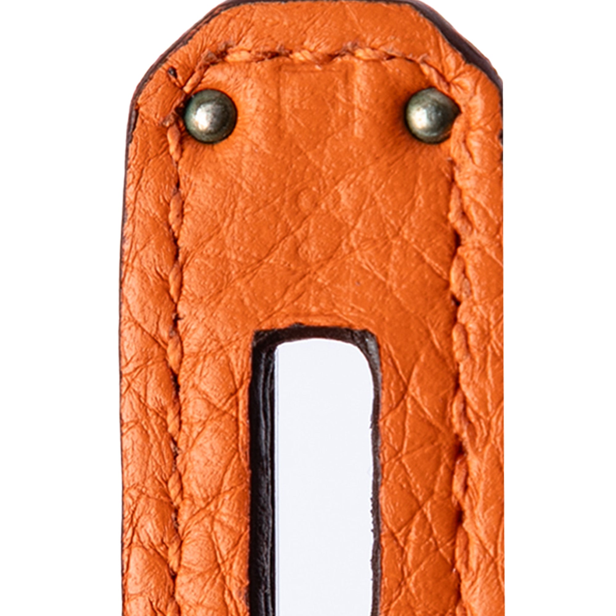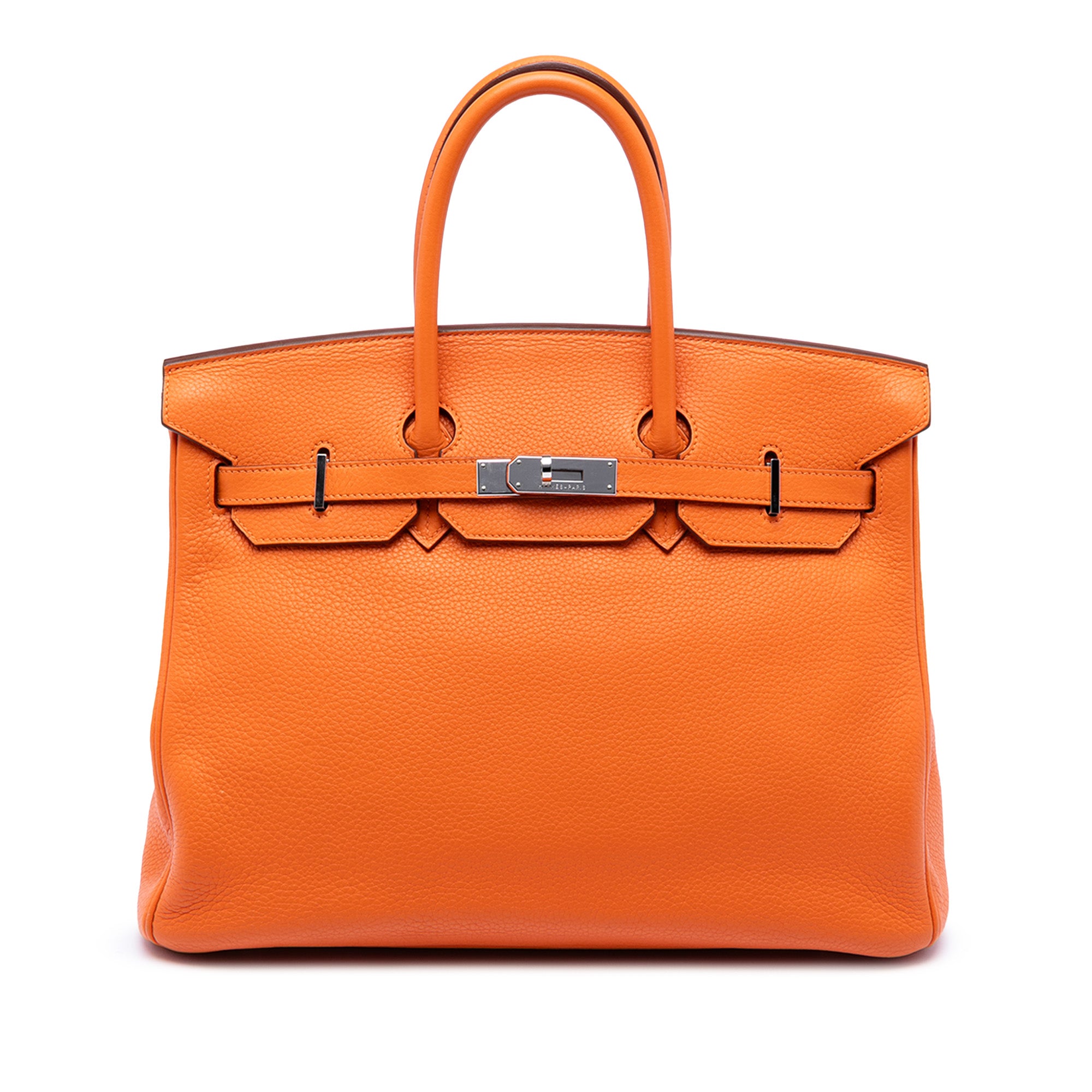 This Birkin 35 features a Clemence leather body in Orange color, rolled leather handles, a front flap with a strap and turn lock closure, and interior zip and slip pockets. Retail Price: 12700.00