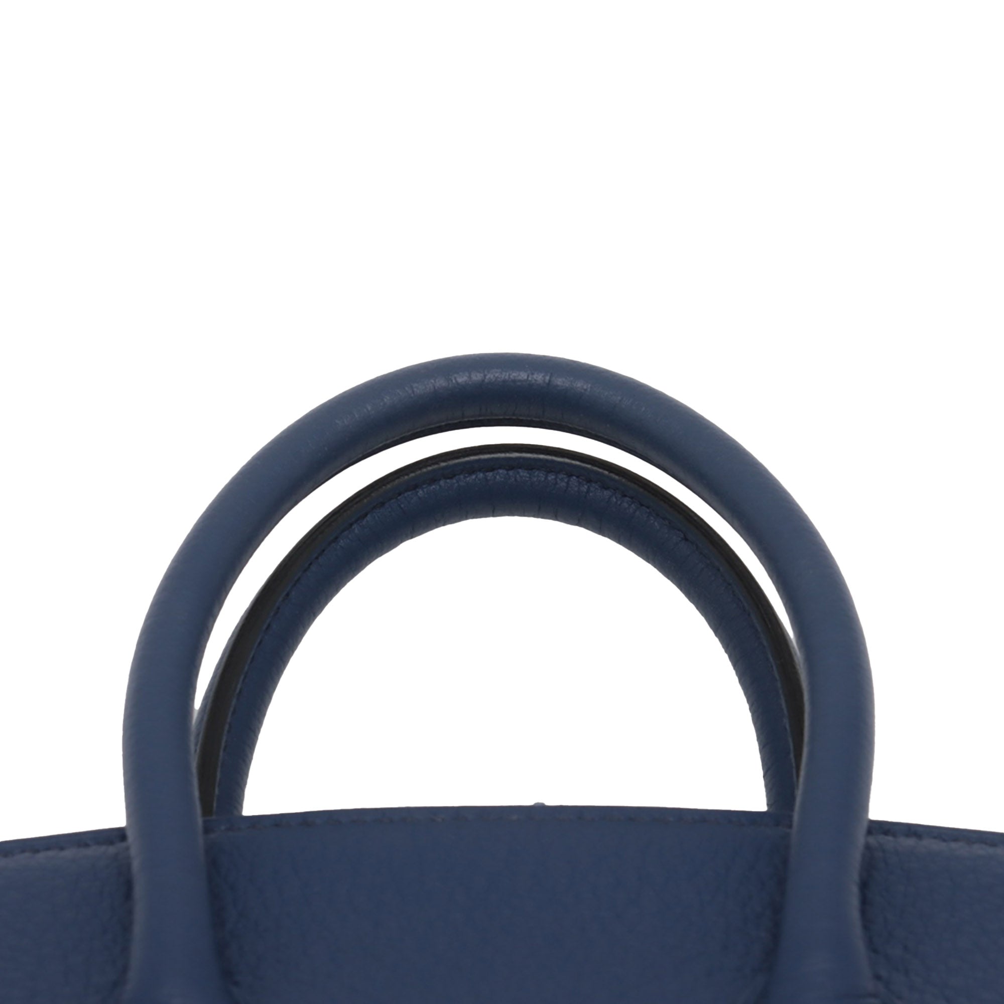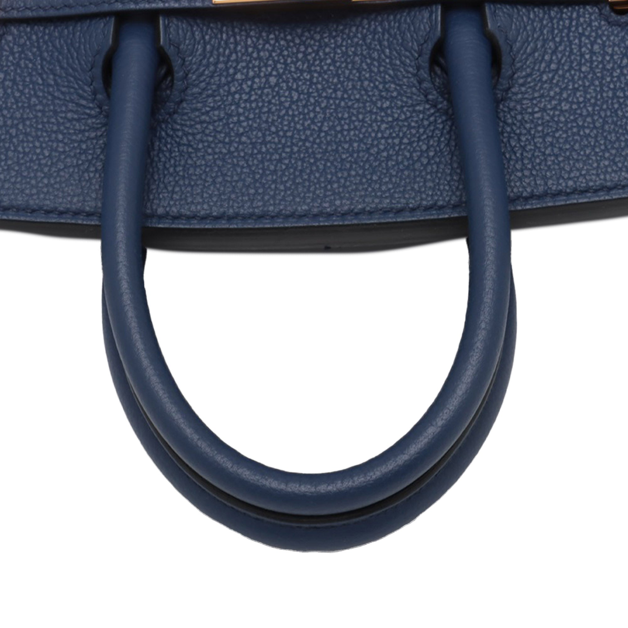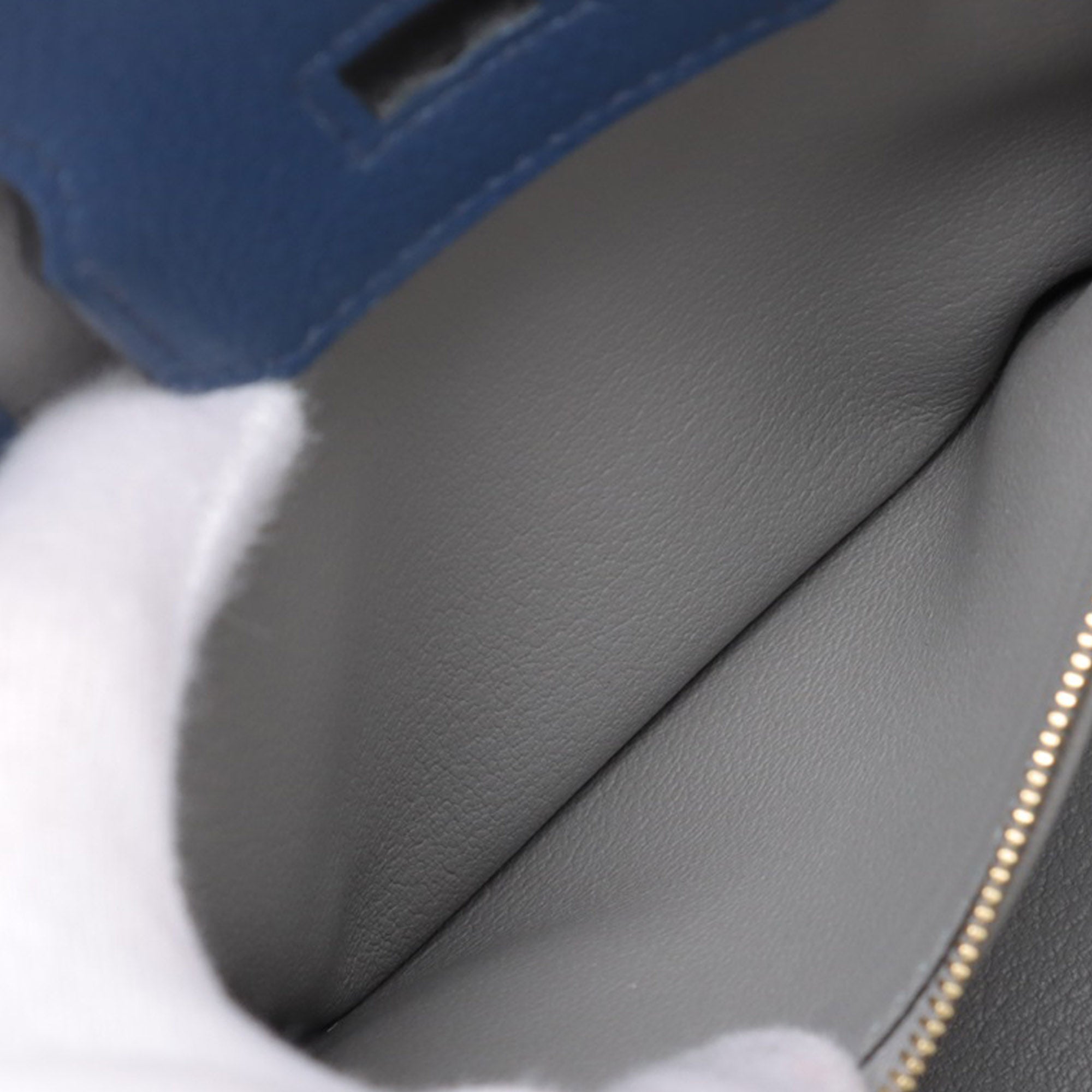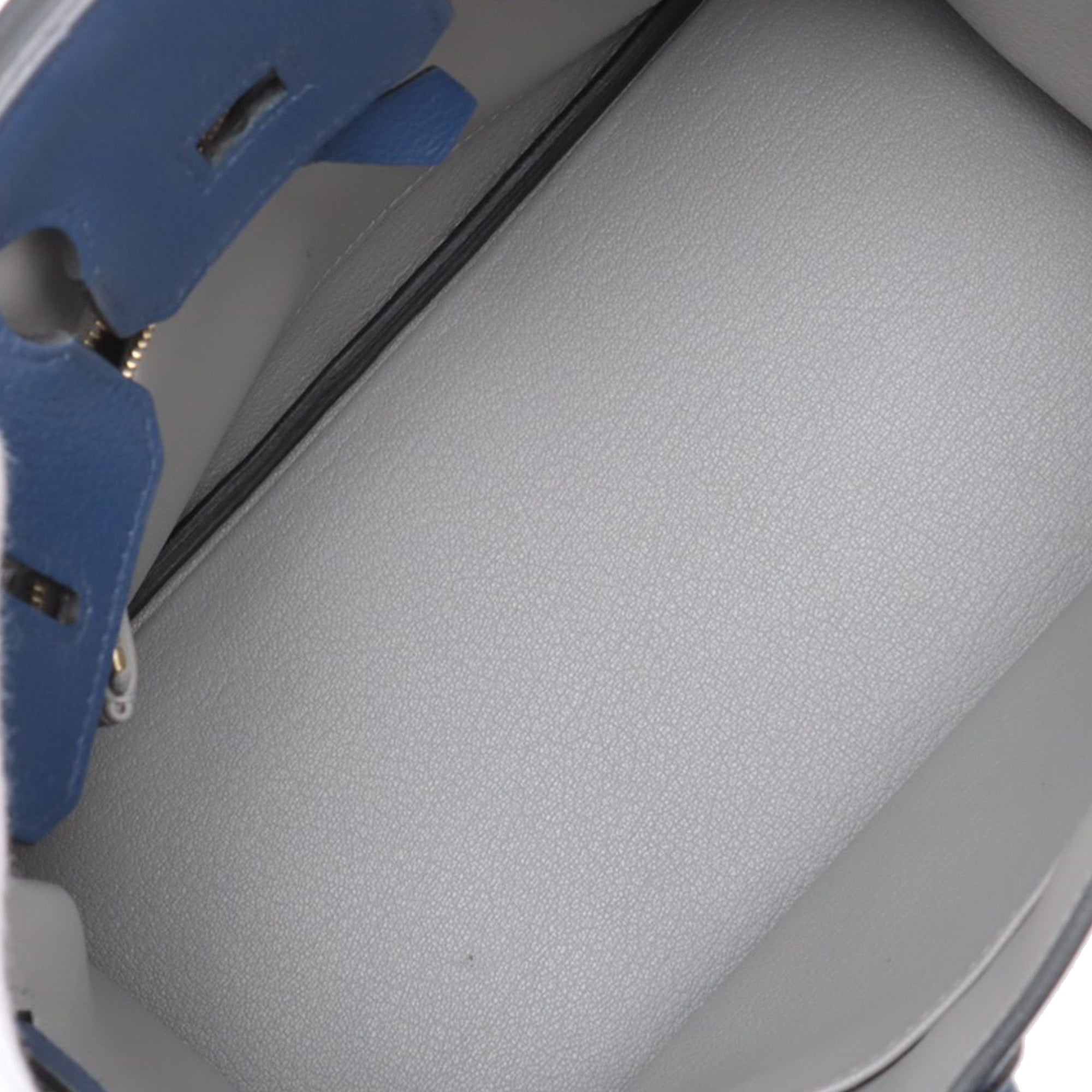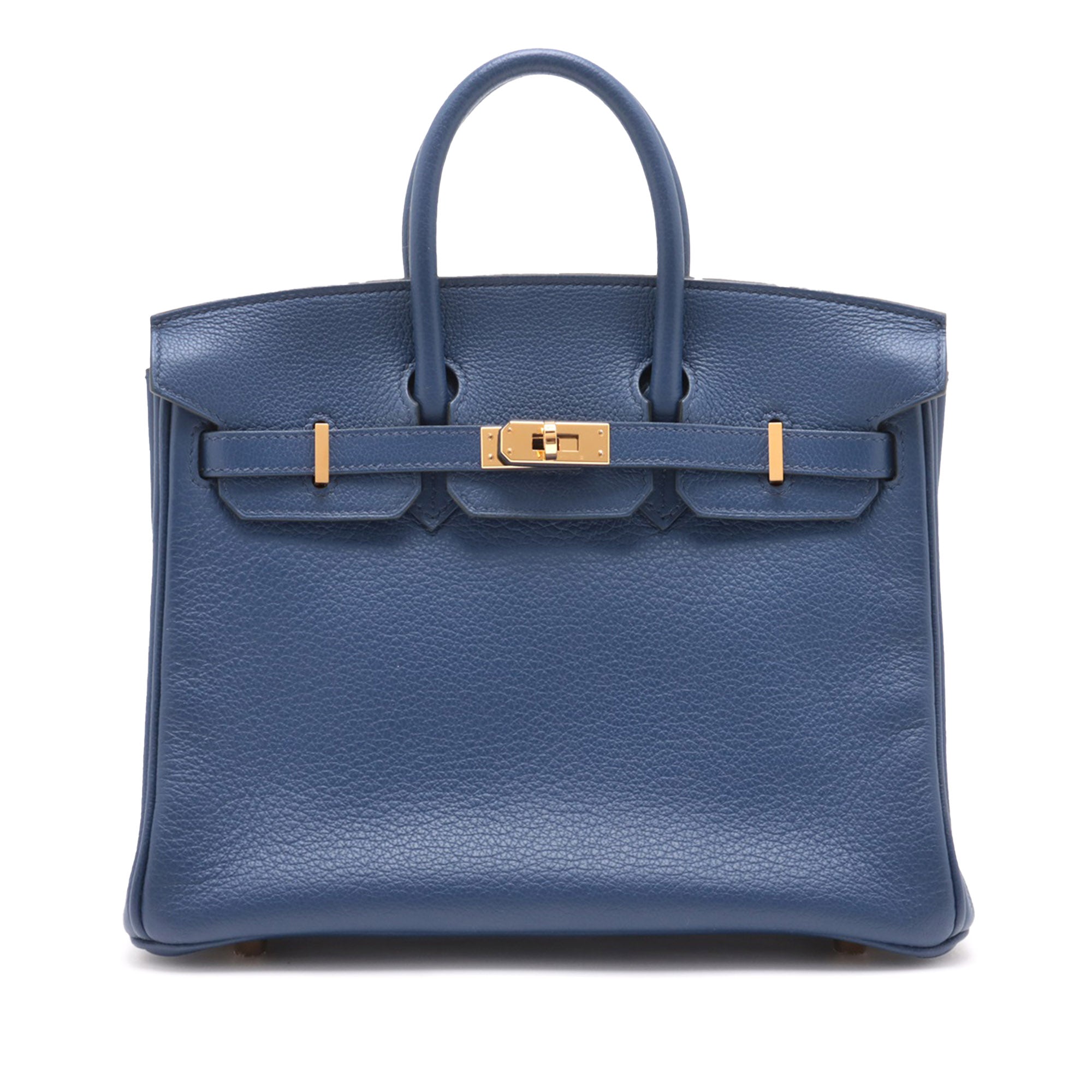 The Birkin 25 features a Clemence leather body in Bleu Sapphire and Gris Mouette color, rolled leather handles, a front flap with a metal lock closure, and interior zip and slip pockets. Inclusion: Dust bag. Retail Price: 27500.00