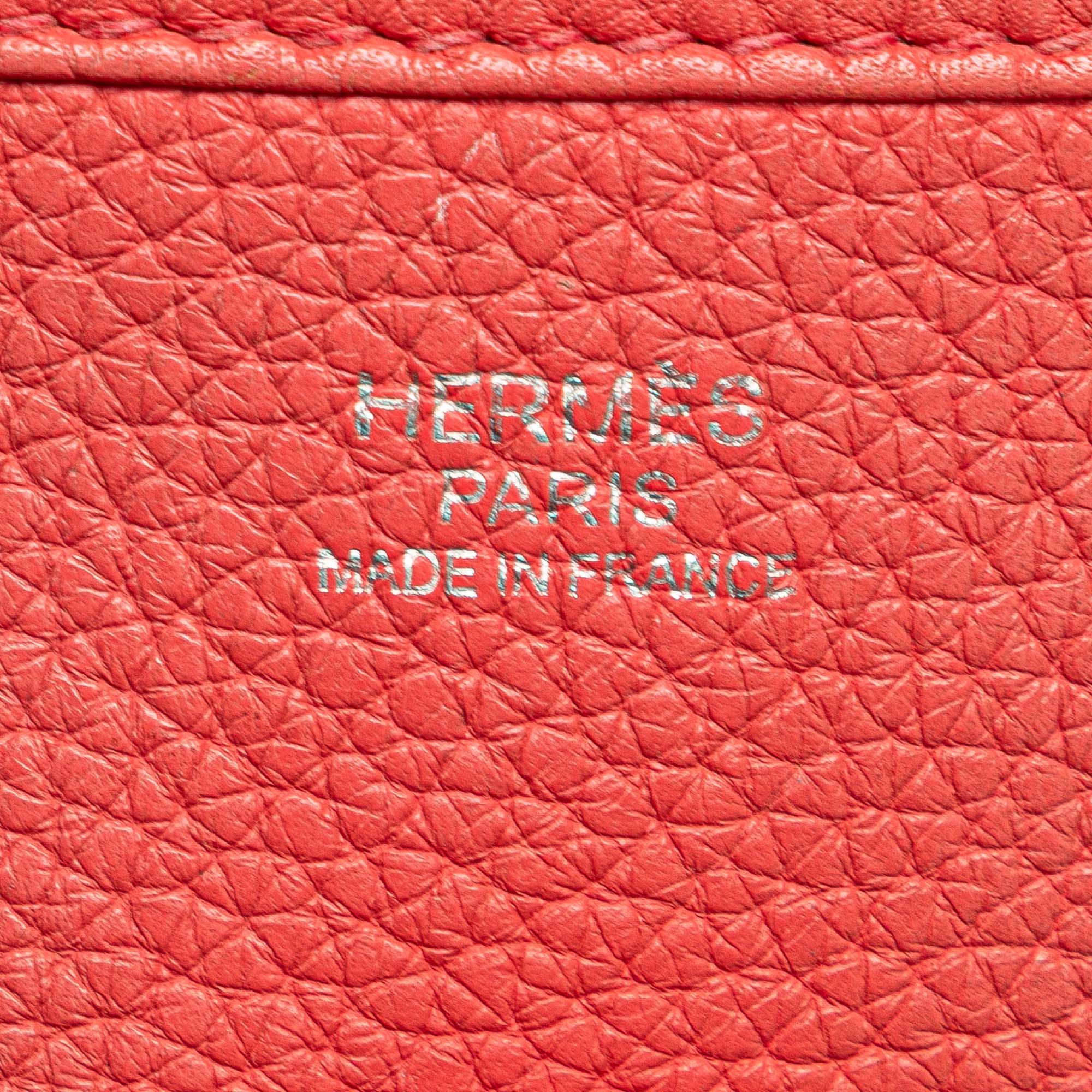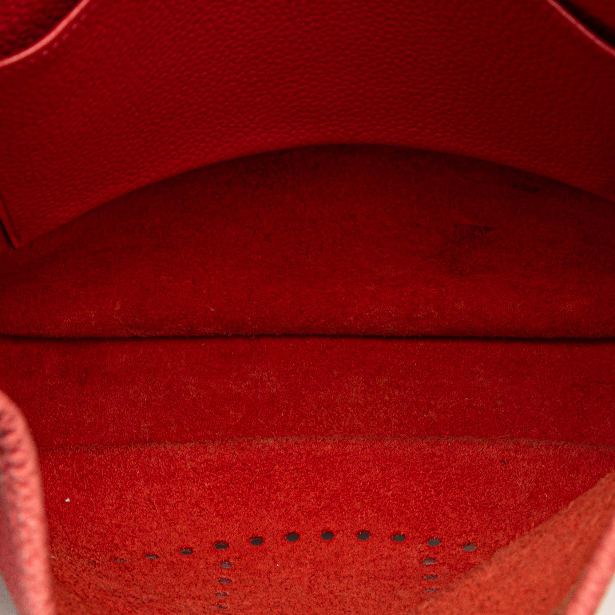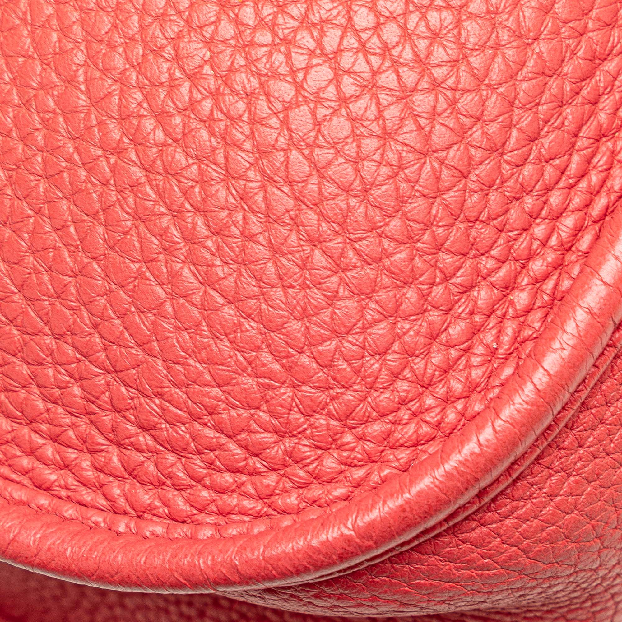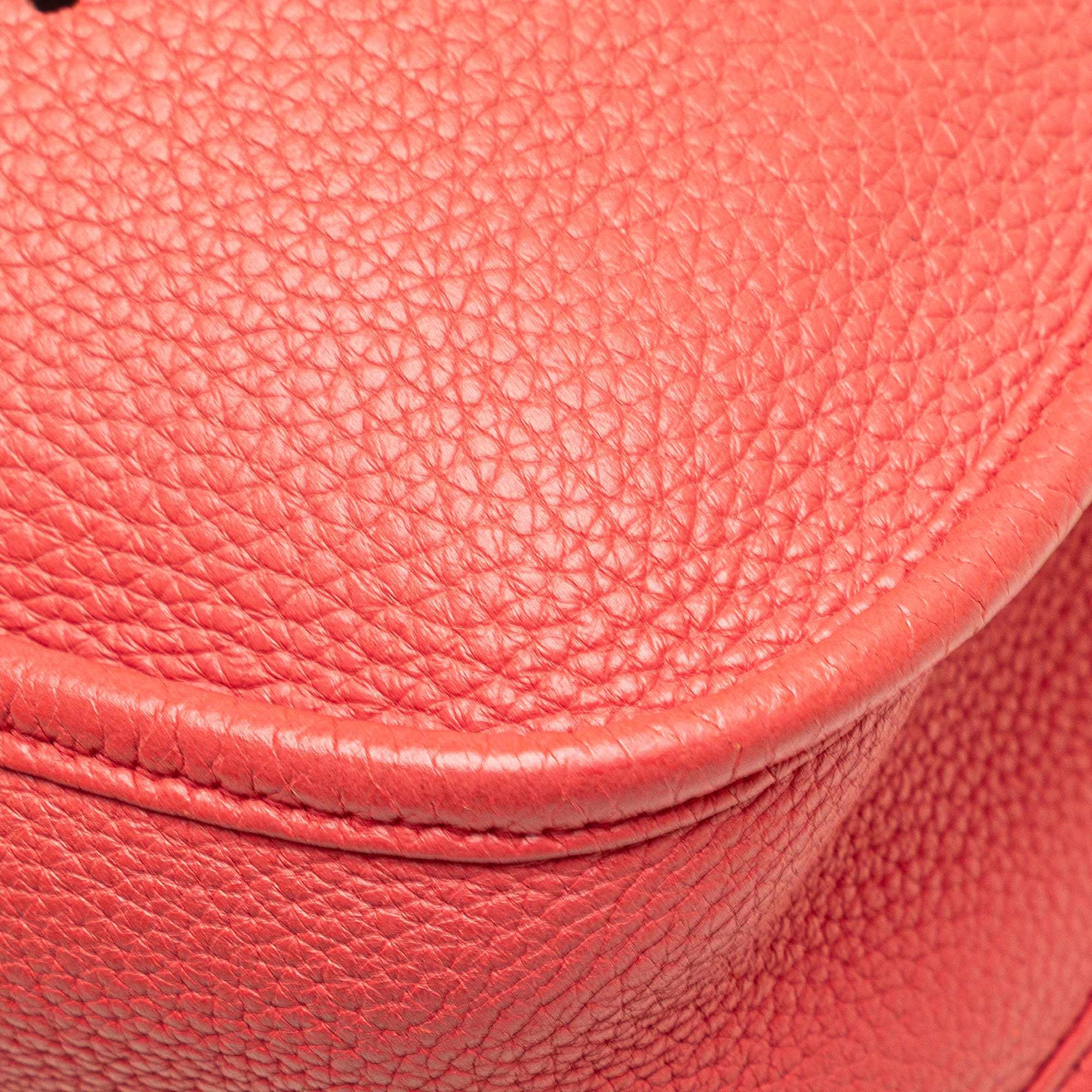 This Evelyne I PM features a Clemence leather body in Bougainvillea color, a flat canvas strap, an open top with a strap closure, and an interior slip pocket. Retail Price: 3850.00