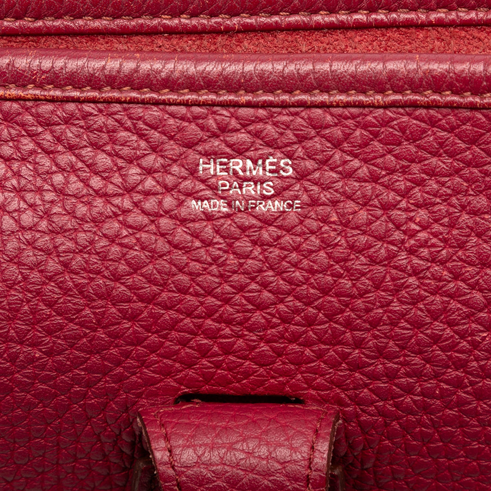 This Evelyne I PM features a Clemence leather body in Rubis color, a detachable flat canvas strap, and an open top with a strap and snap closure. Retail Price: 4175.00