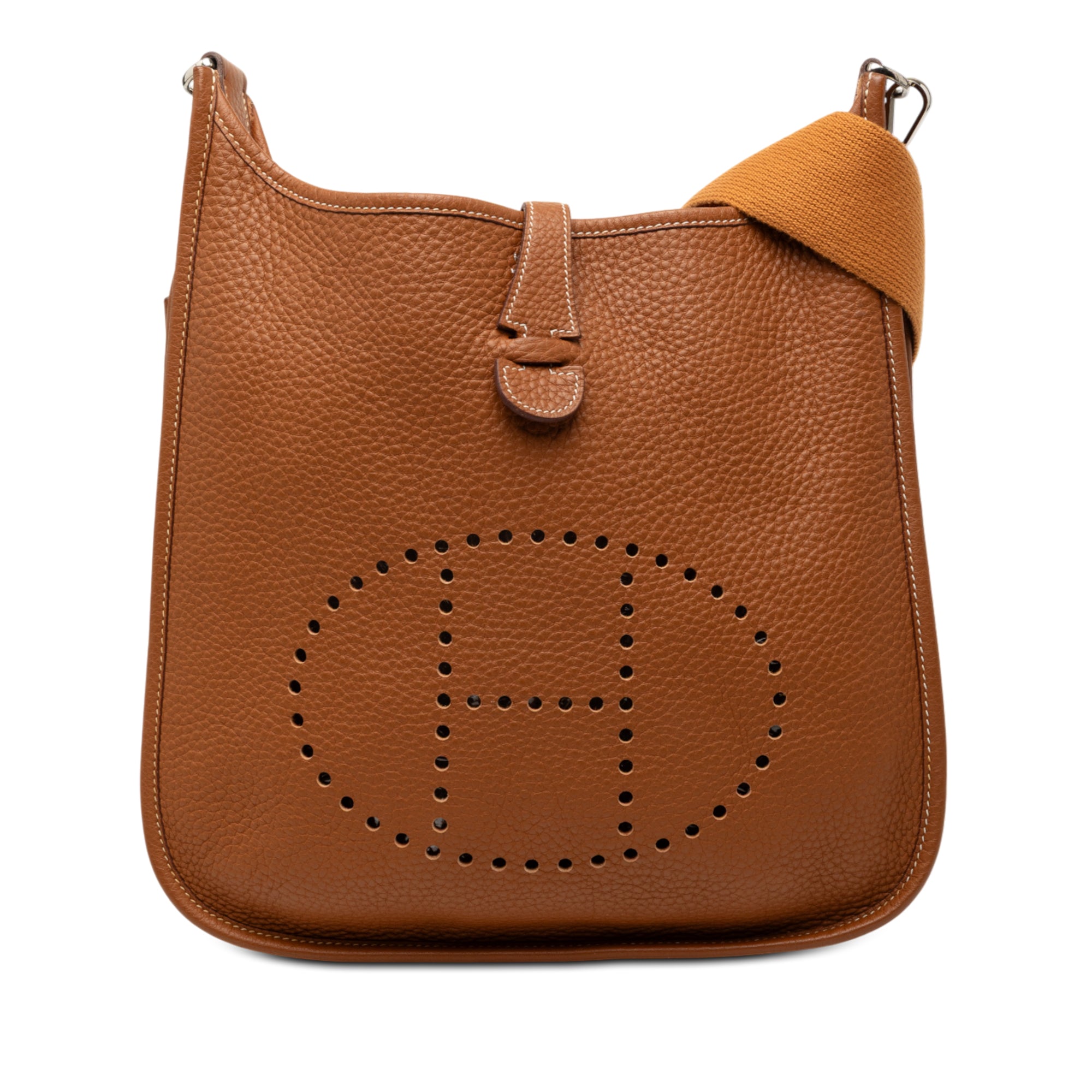 This Evelyne II features a Clemence leather body in Gold color, a detachable flat canvas strap, an open top with a tuck closure, and an exterior back slip pocket. Retail Price: 2670.00