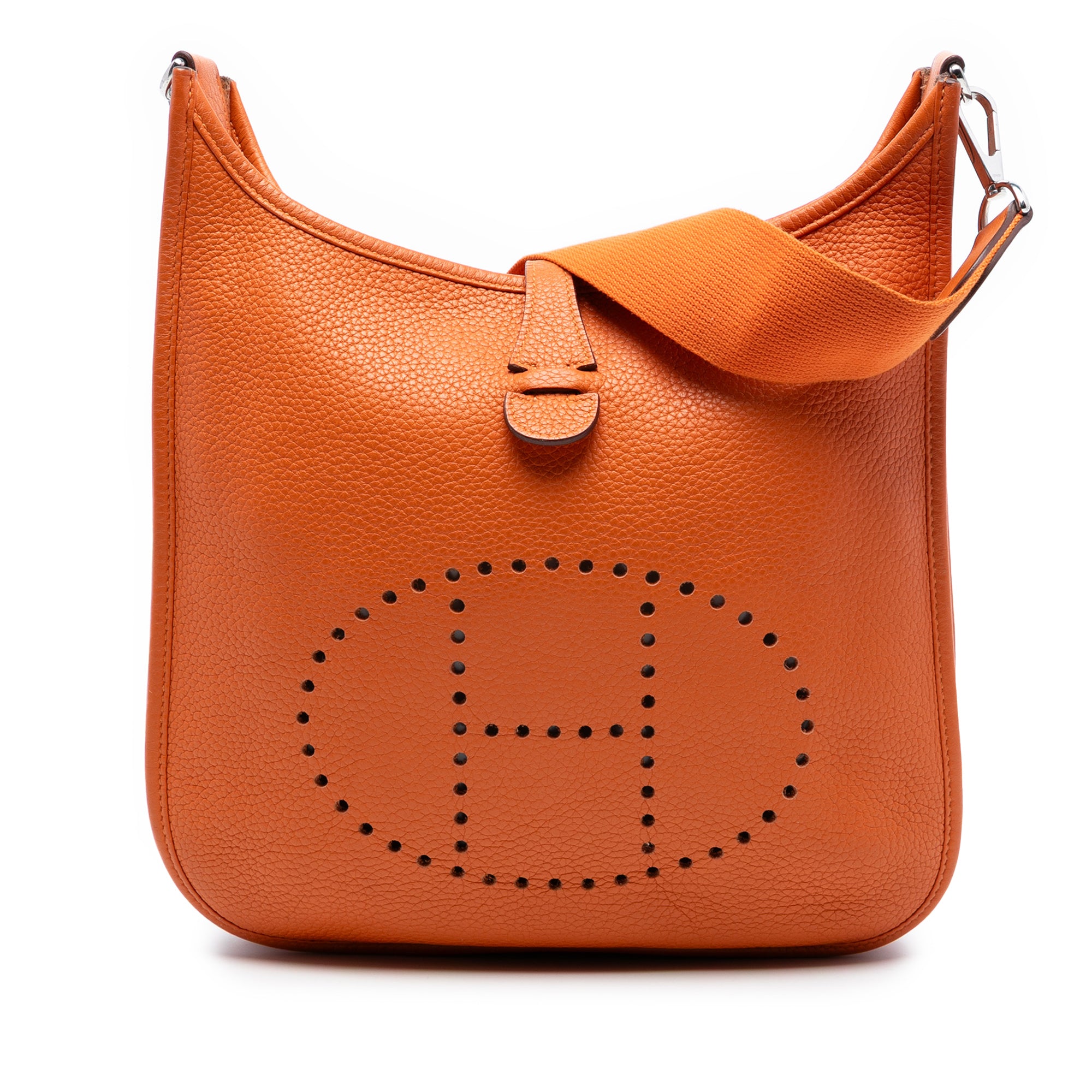 This Evelyne III features a Clemence leather body in Orange color, an adjustable and detachable flat canvas strap, an open top with a tuck closure, and an exterior back slip pocket. Retail Price: 4025.00