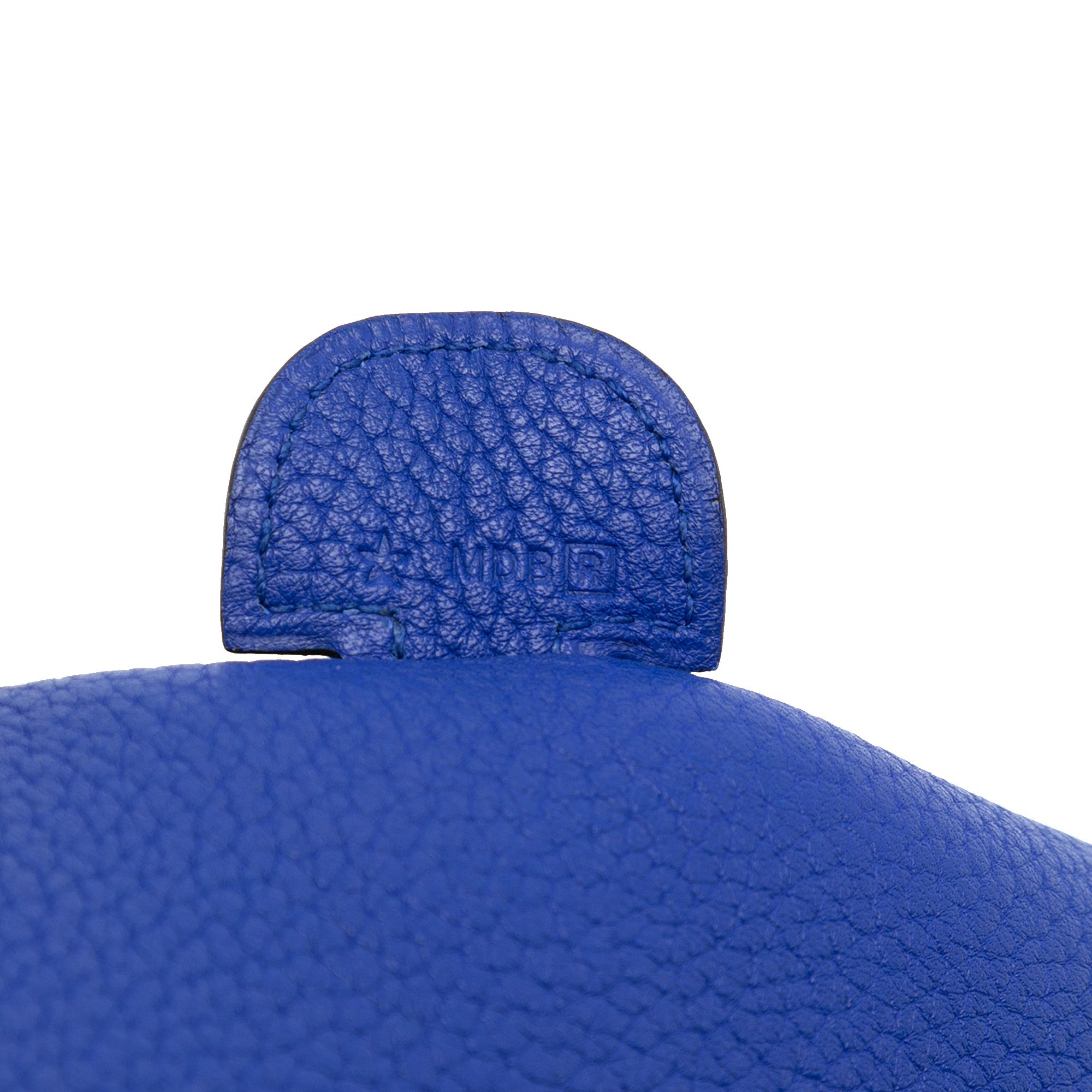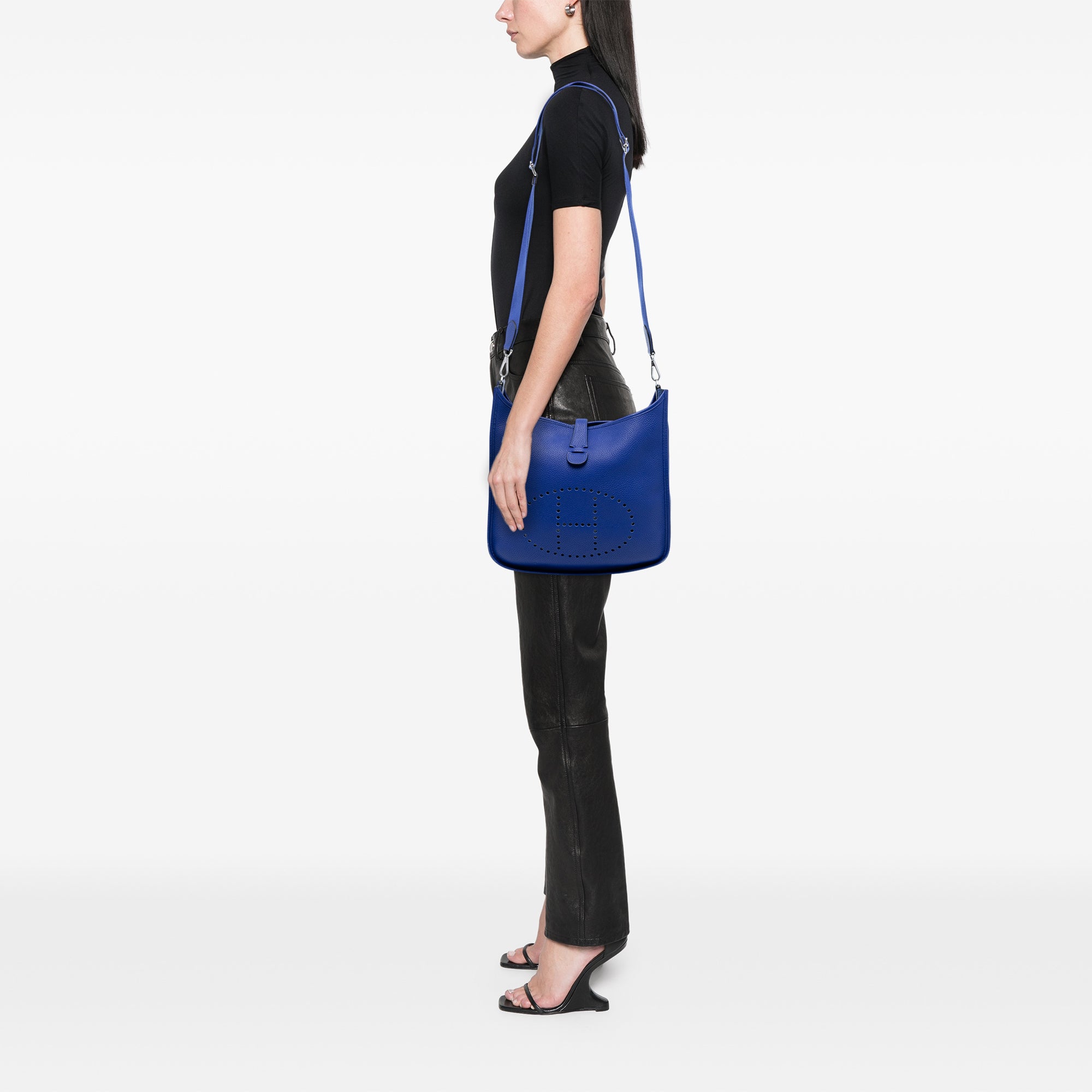 This Evelyne III features a leather body in Bleu Royal color, a detachable and adjustable flat canvas strap, an open top with a snap closure, and an exterior back slip pocket. Retail Price: 3650.00