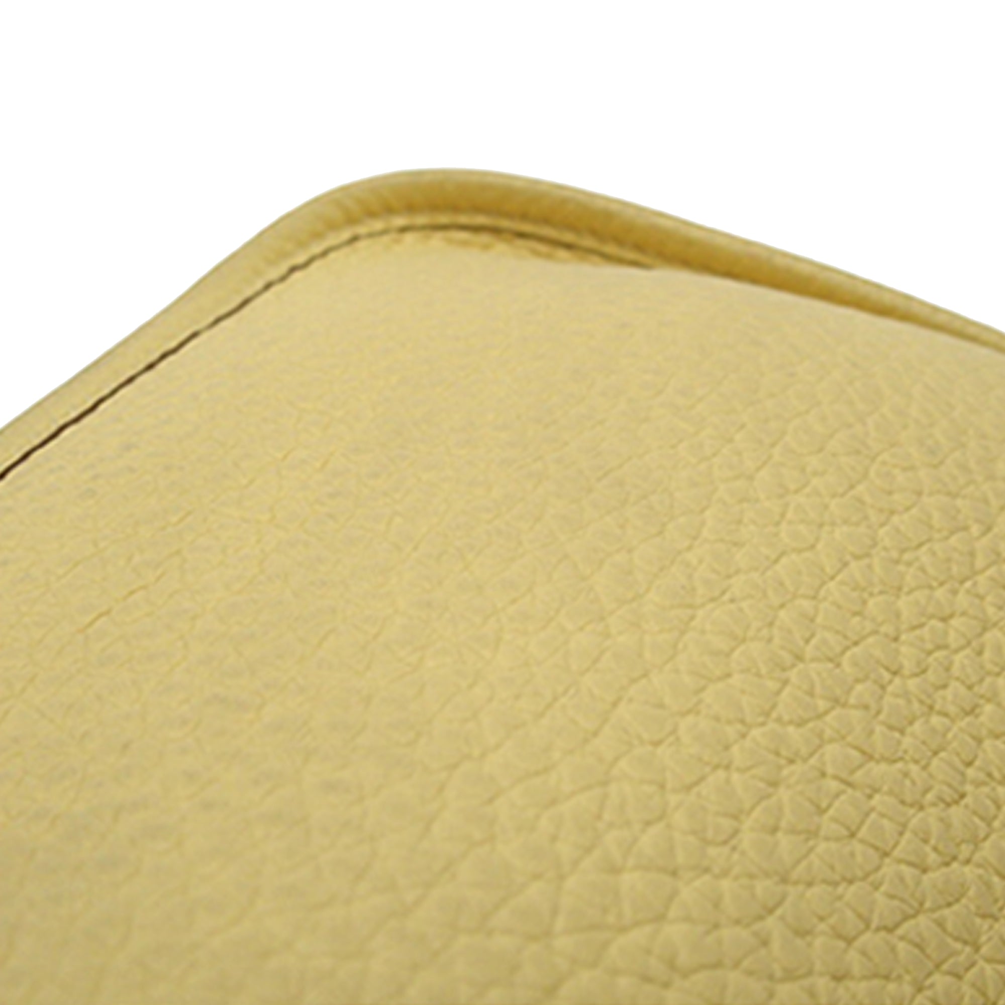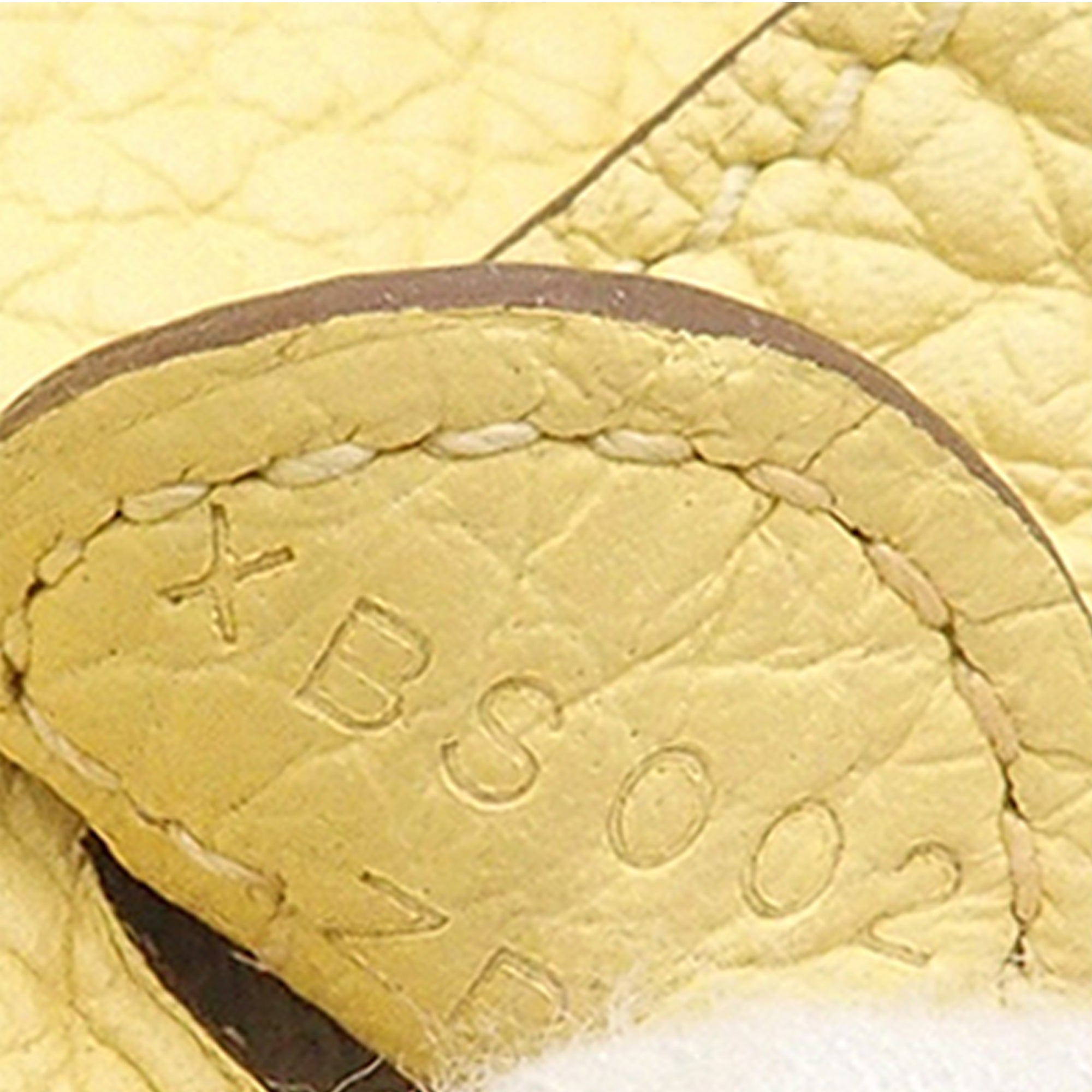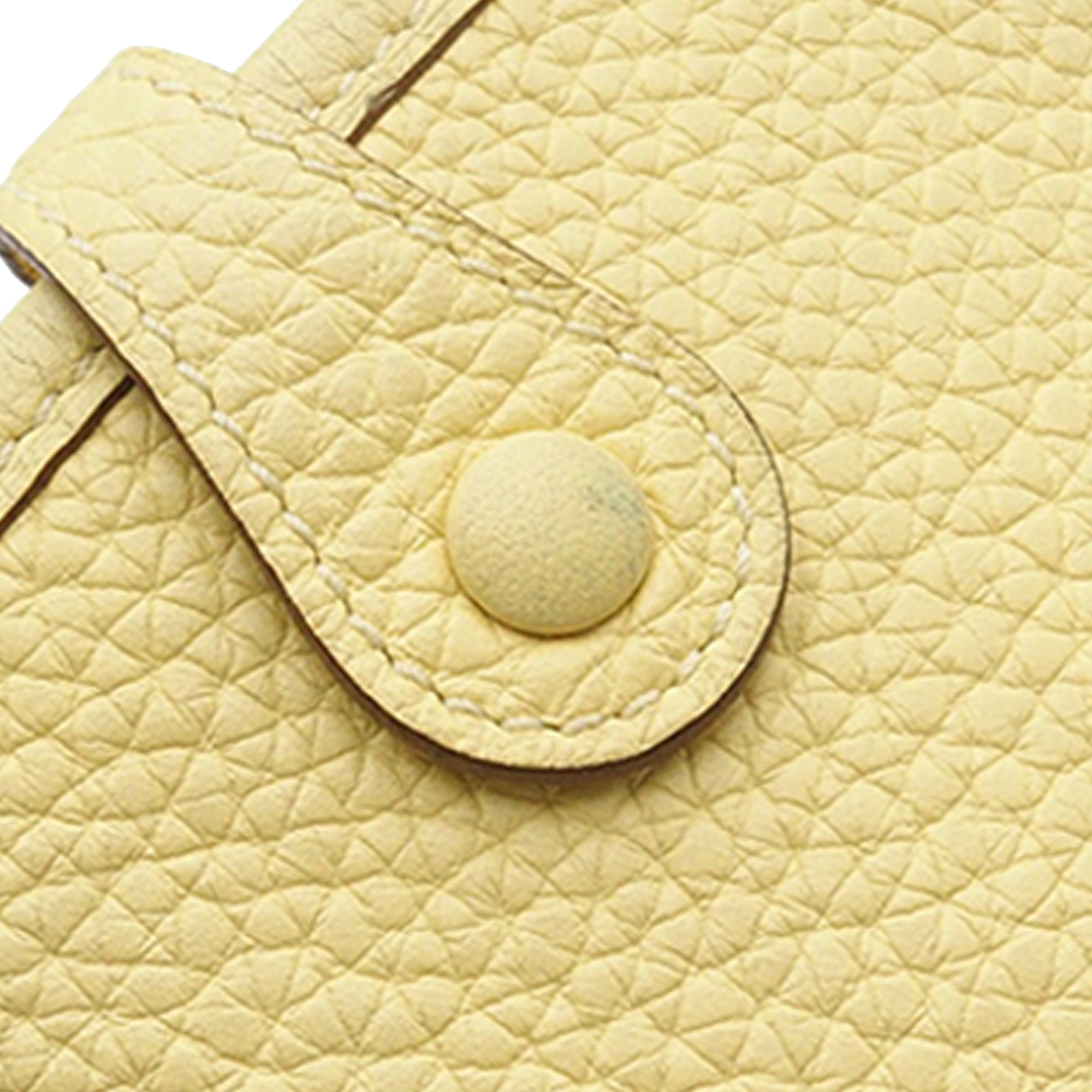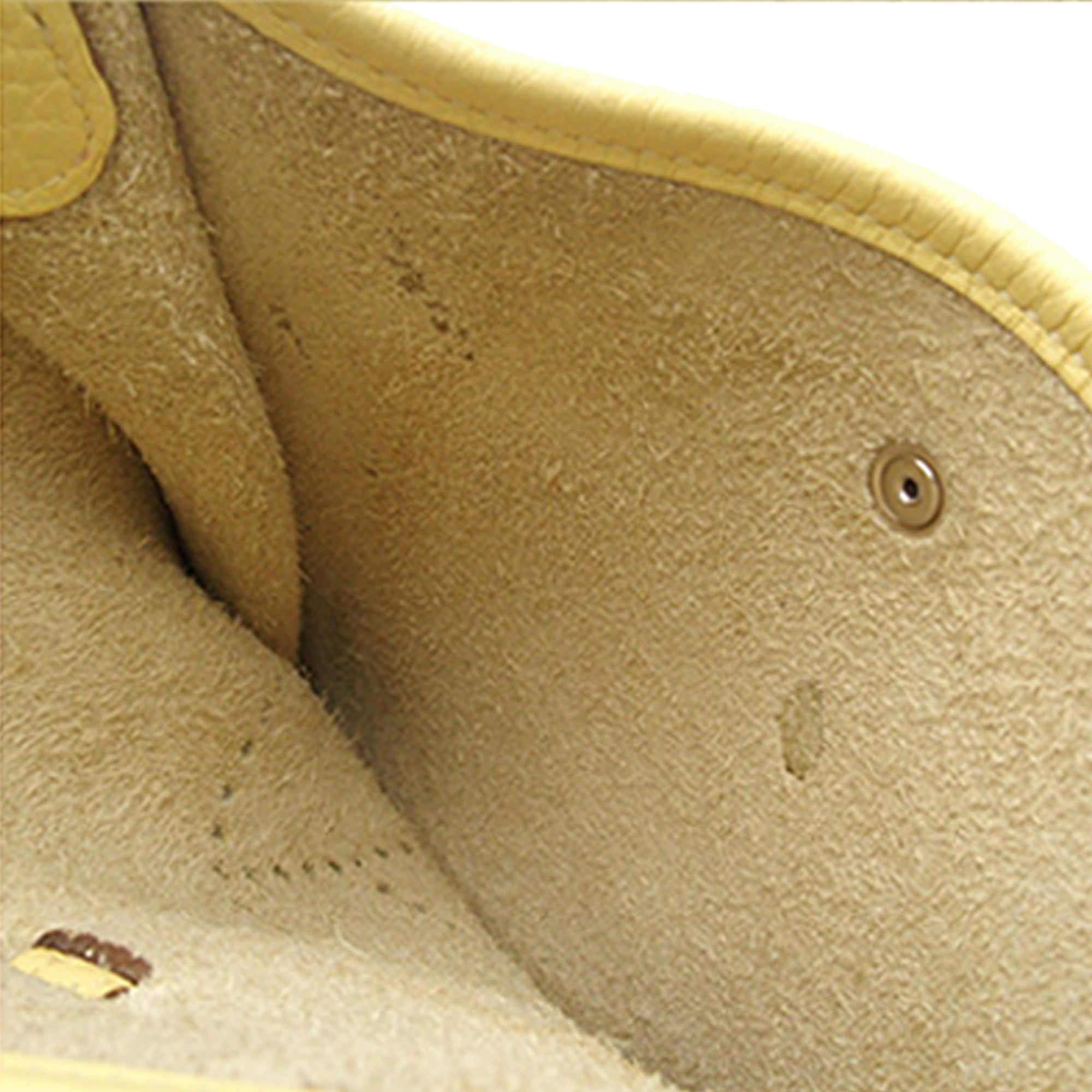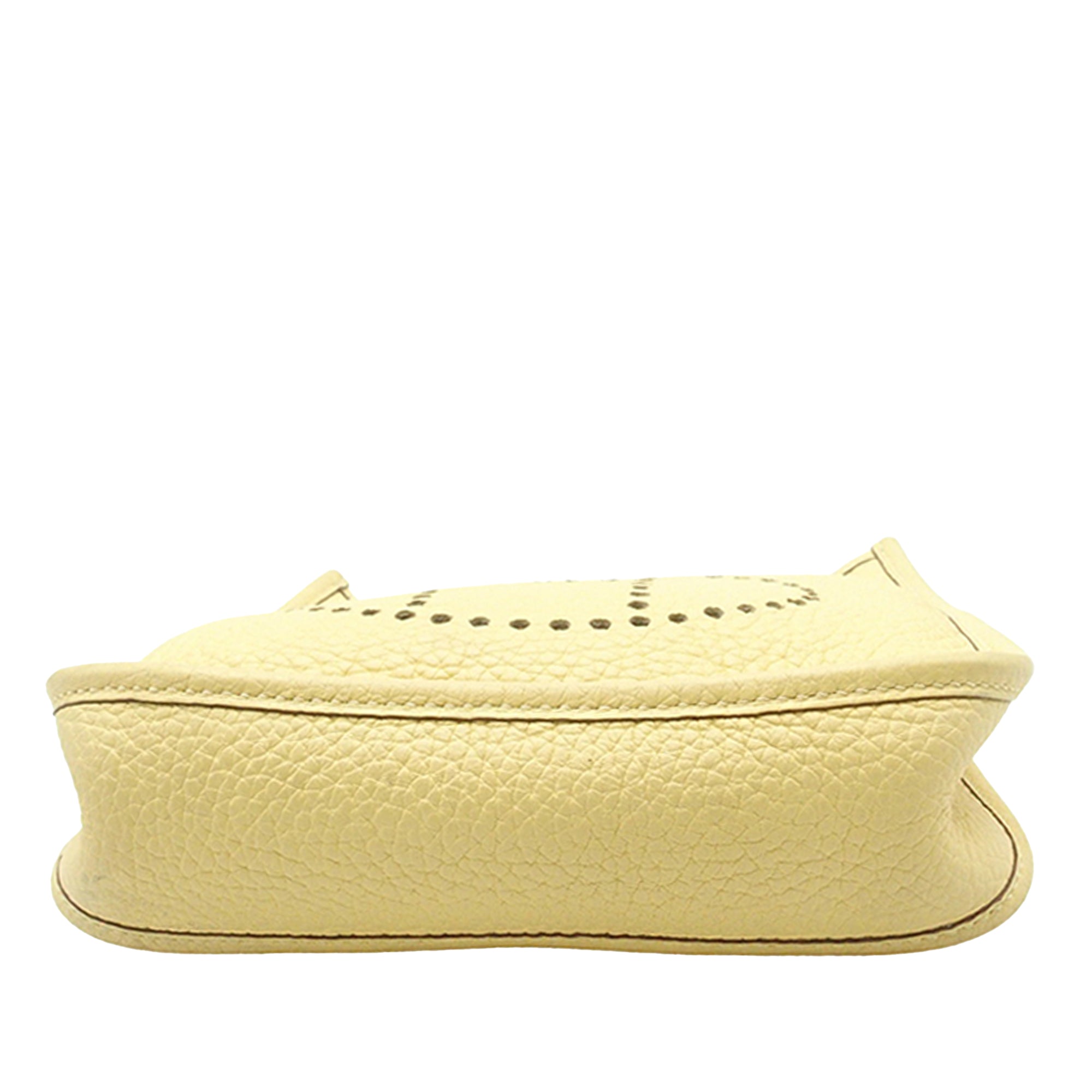 This Evelyne TPM features a Clemence leather body in Jaune Poussin color, a detachable flat strap, and an open top with a strap and snap button closure. Retail Price: 5000.00