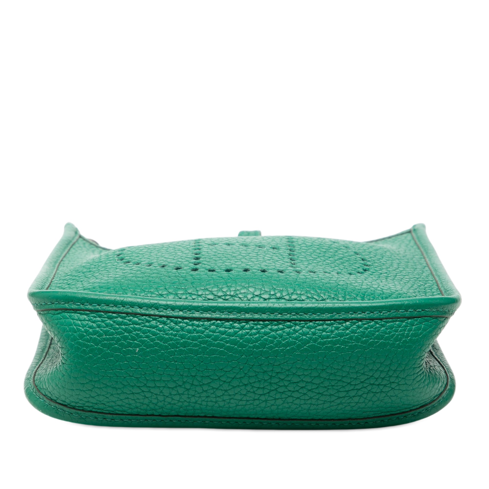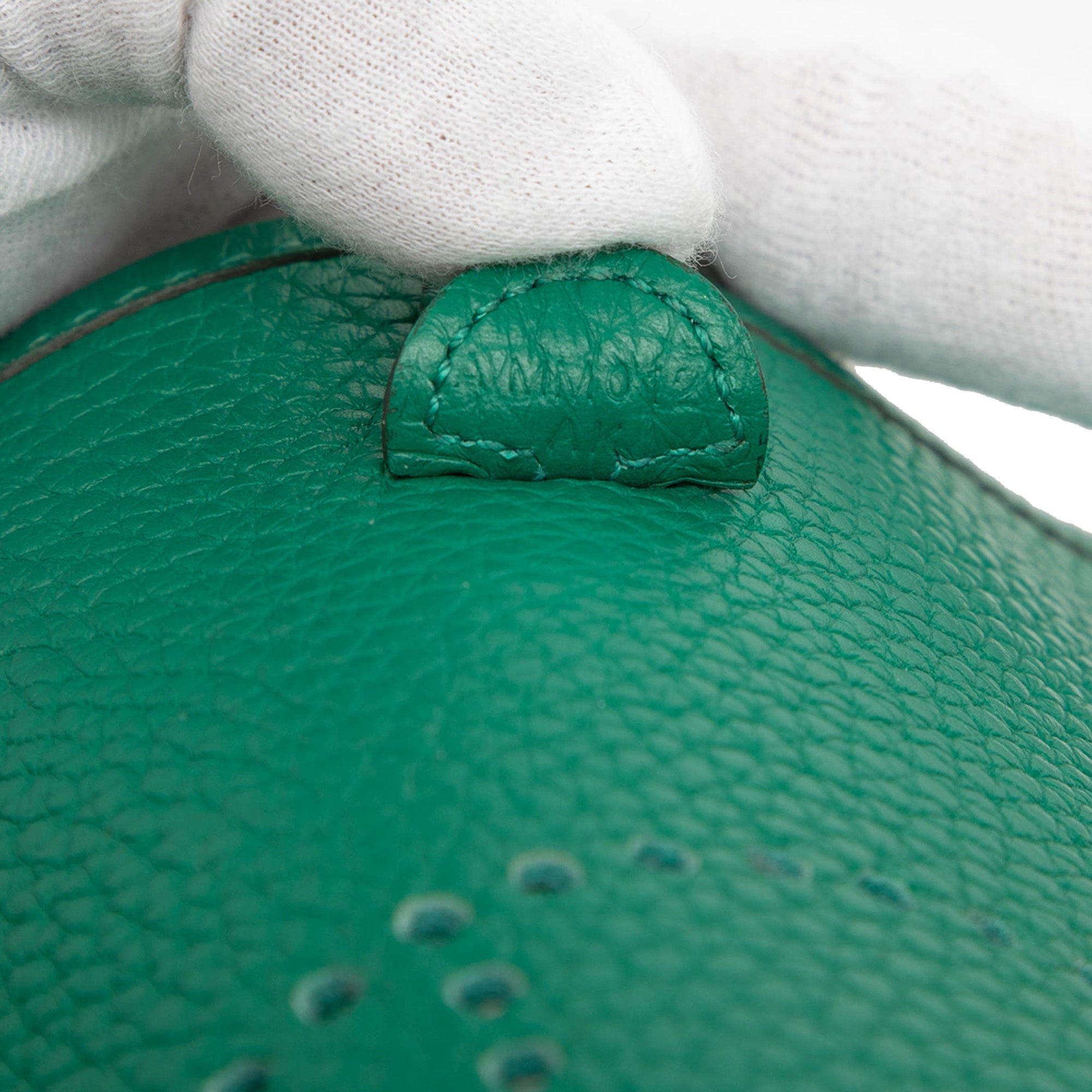 This Evelyne TPM features a Clemence leather body in Vert Vertigo color, a detachable flat strap, and an open top with a strap and snap closure. Retail Price: 5000.00