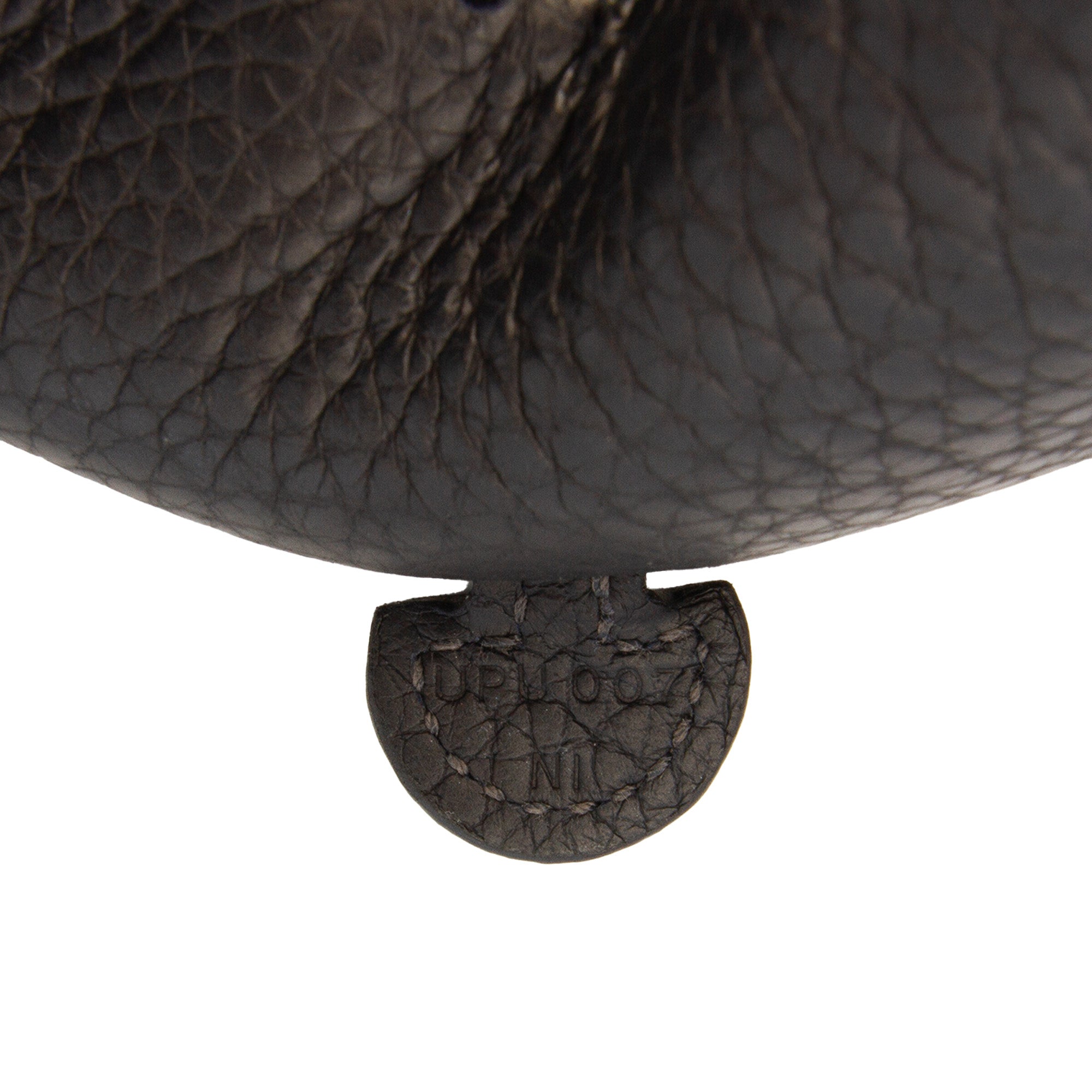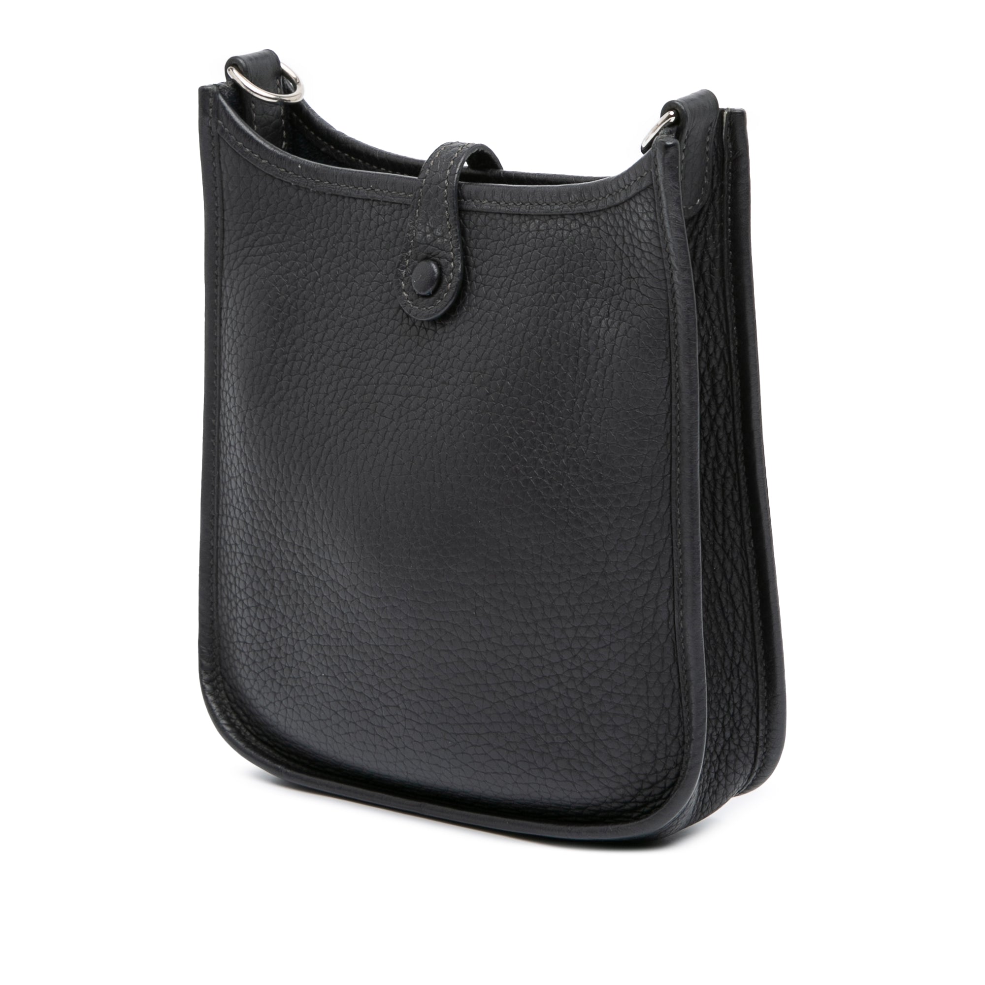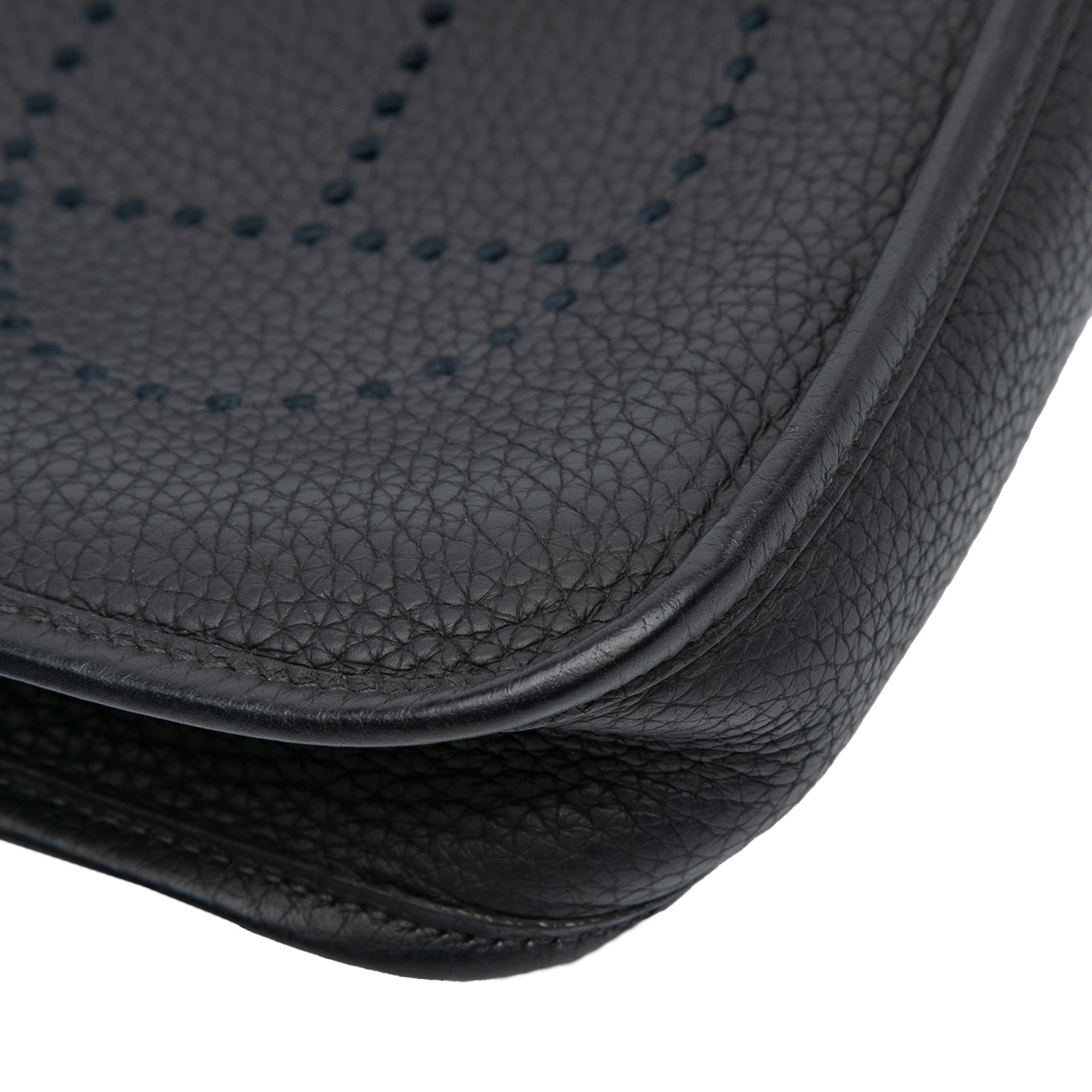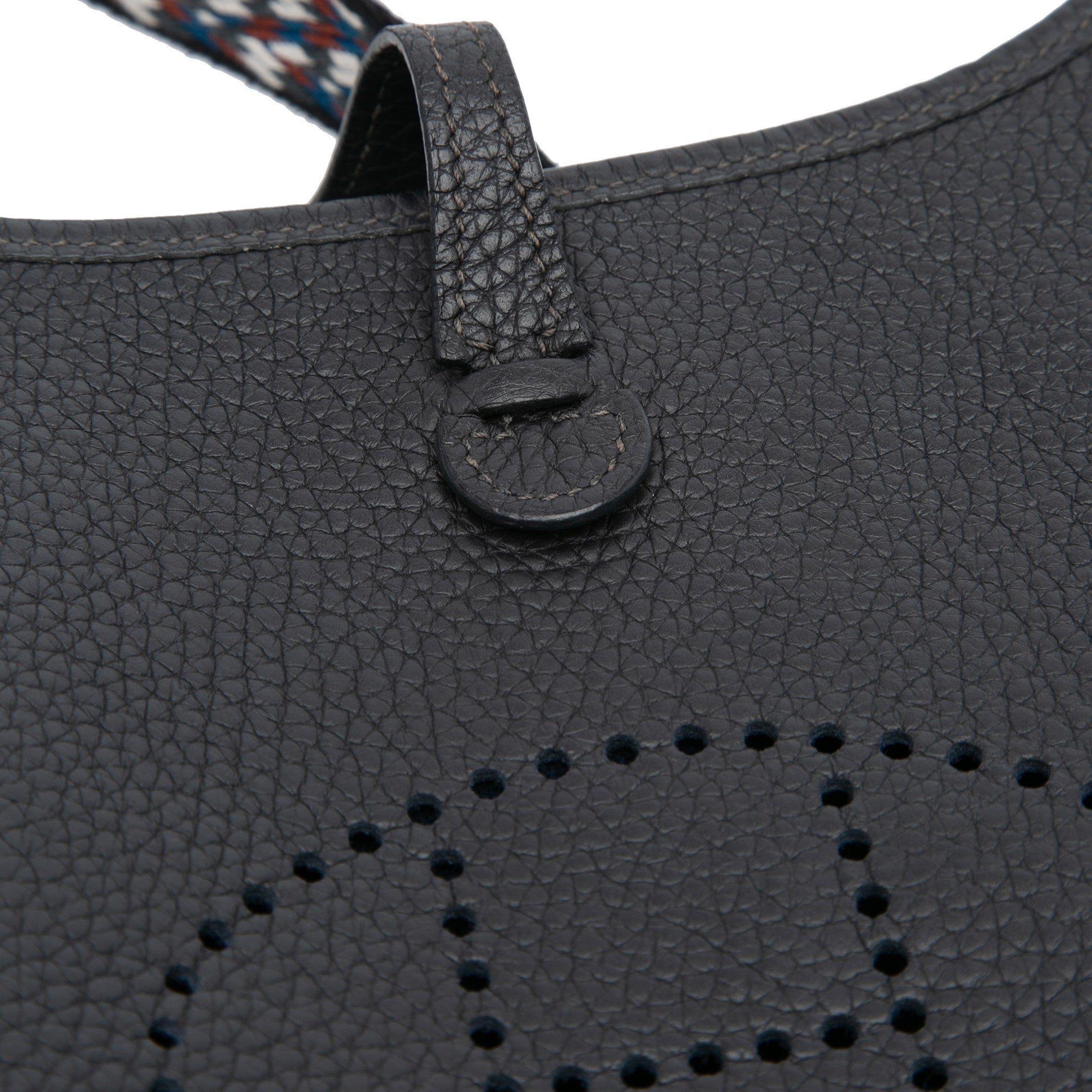 This Evelyne TPM features a Clemence leather body in Caban color, a flat zigzag canvas strap, and an open top with a strap and snap closure. Retail Price: 5000.00