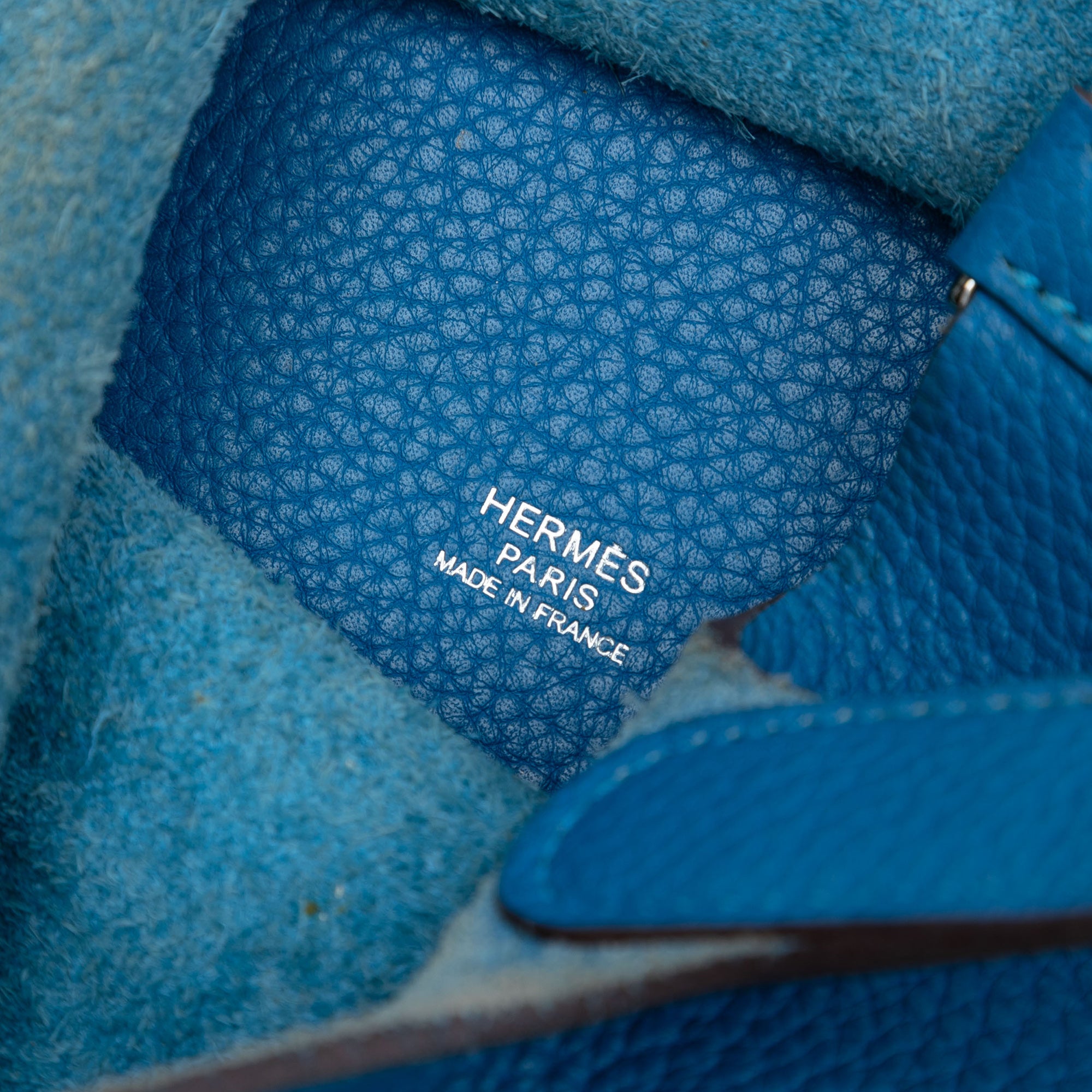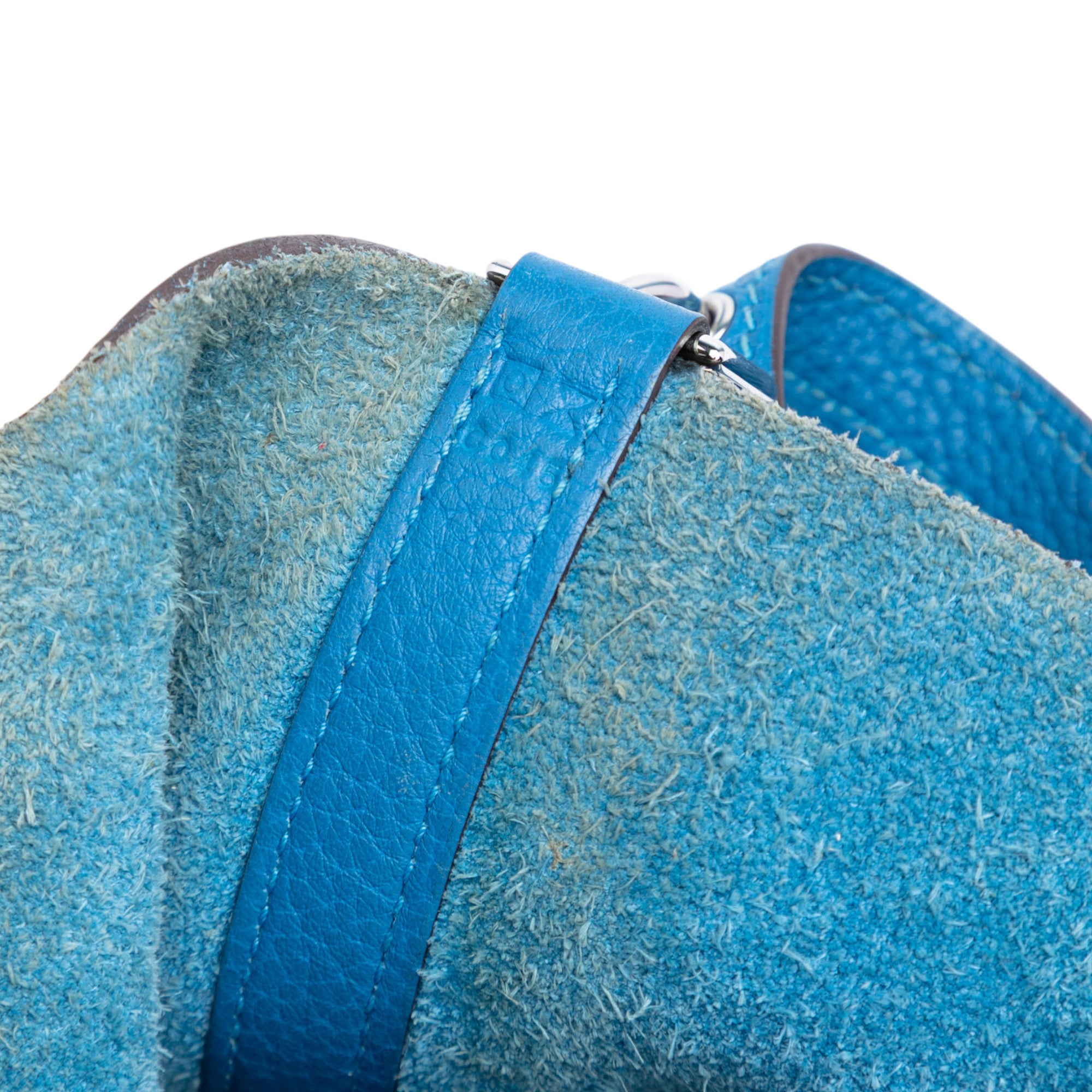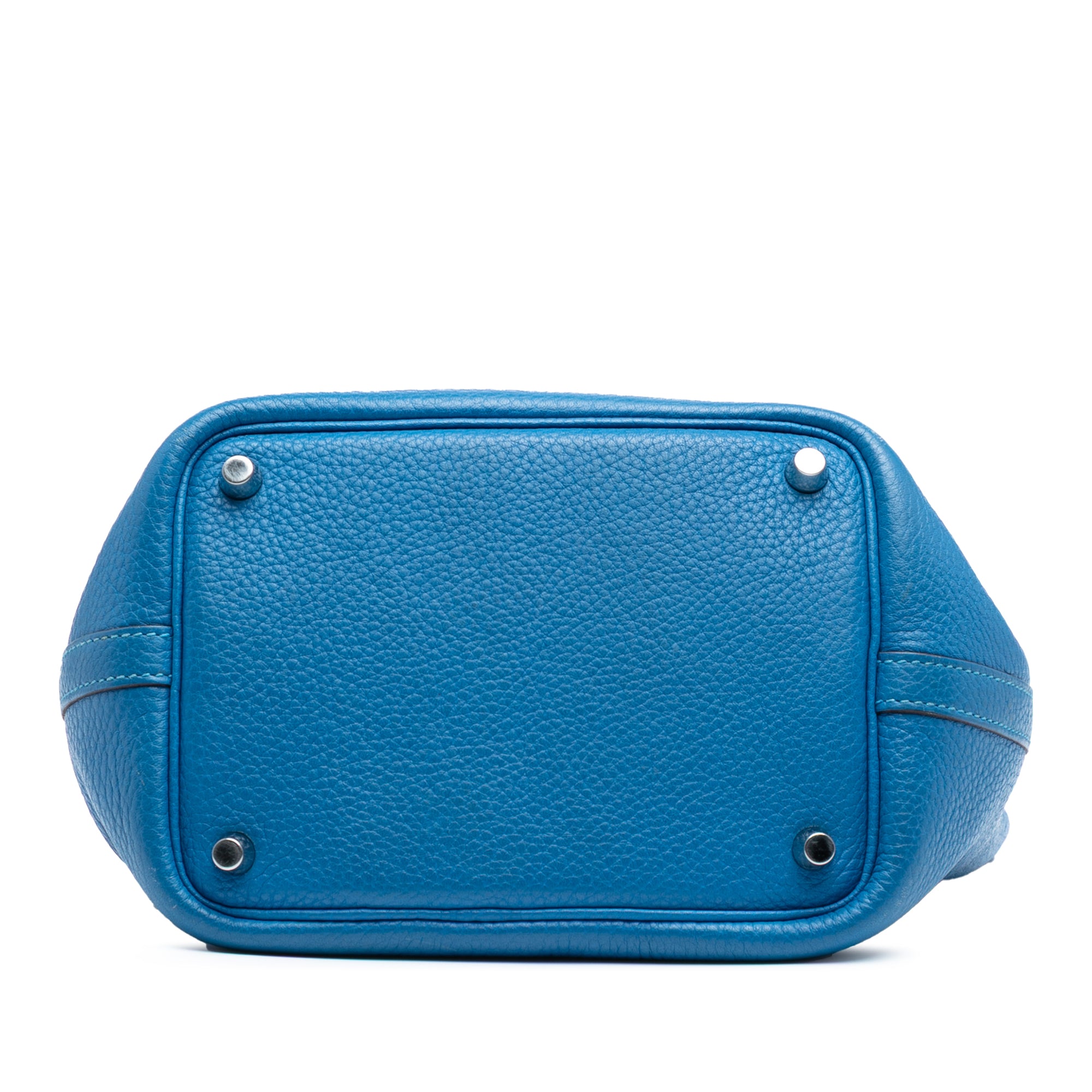 This Picotin Lock features a Clemence leather body in Blue Mykonos color, flat leather handles, and an open top with a pull-through strap closure. Retail Price: 5320.00