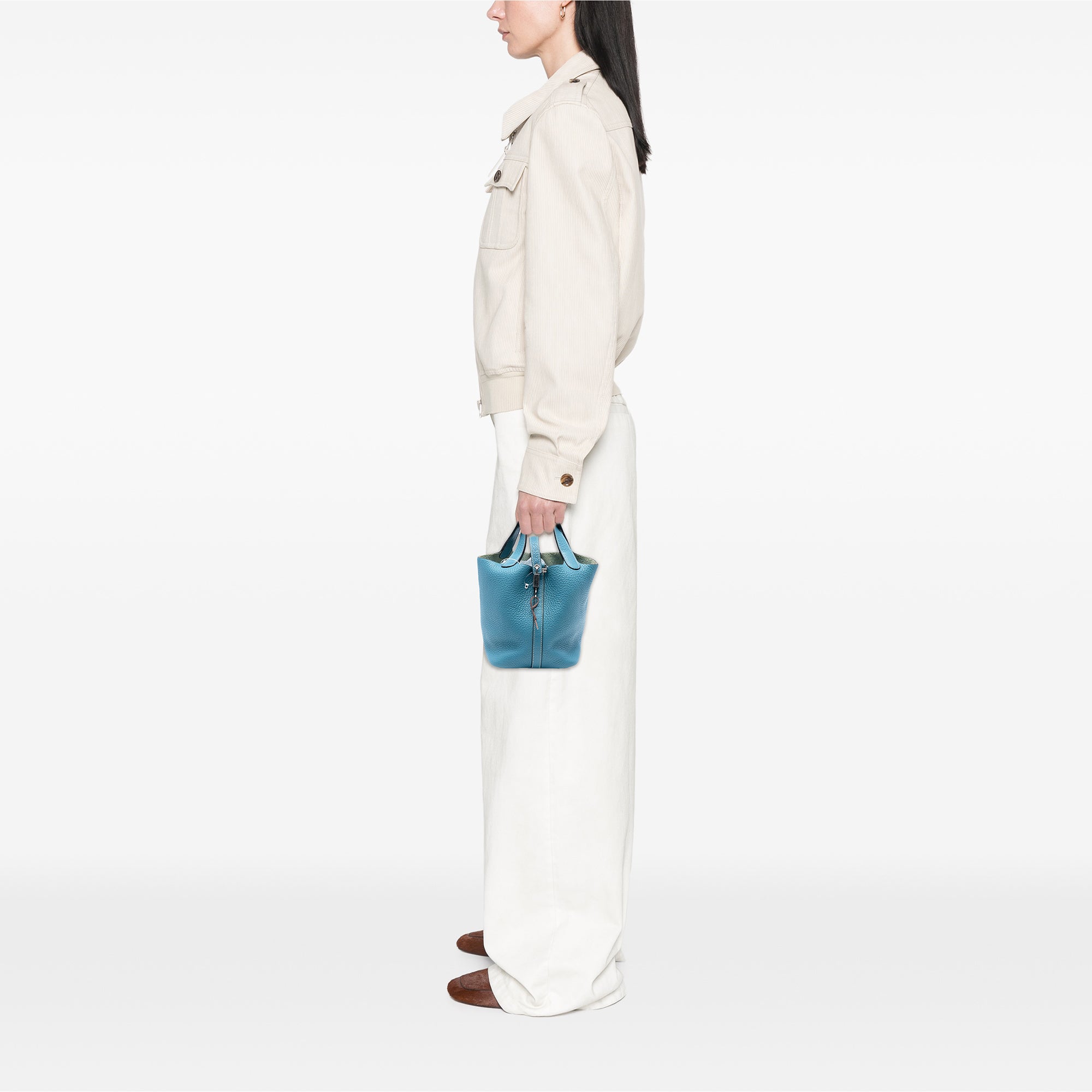 This Picotin Lock features a Clemence leather body in Blue Jean color, flat leather straps, and a top strap and buckle closure. Retail Price: 5320.00