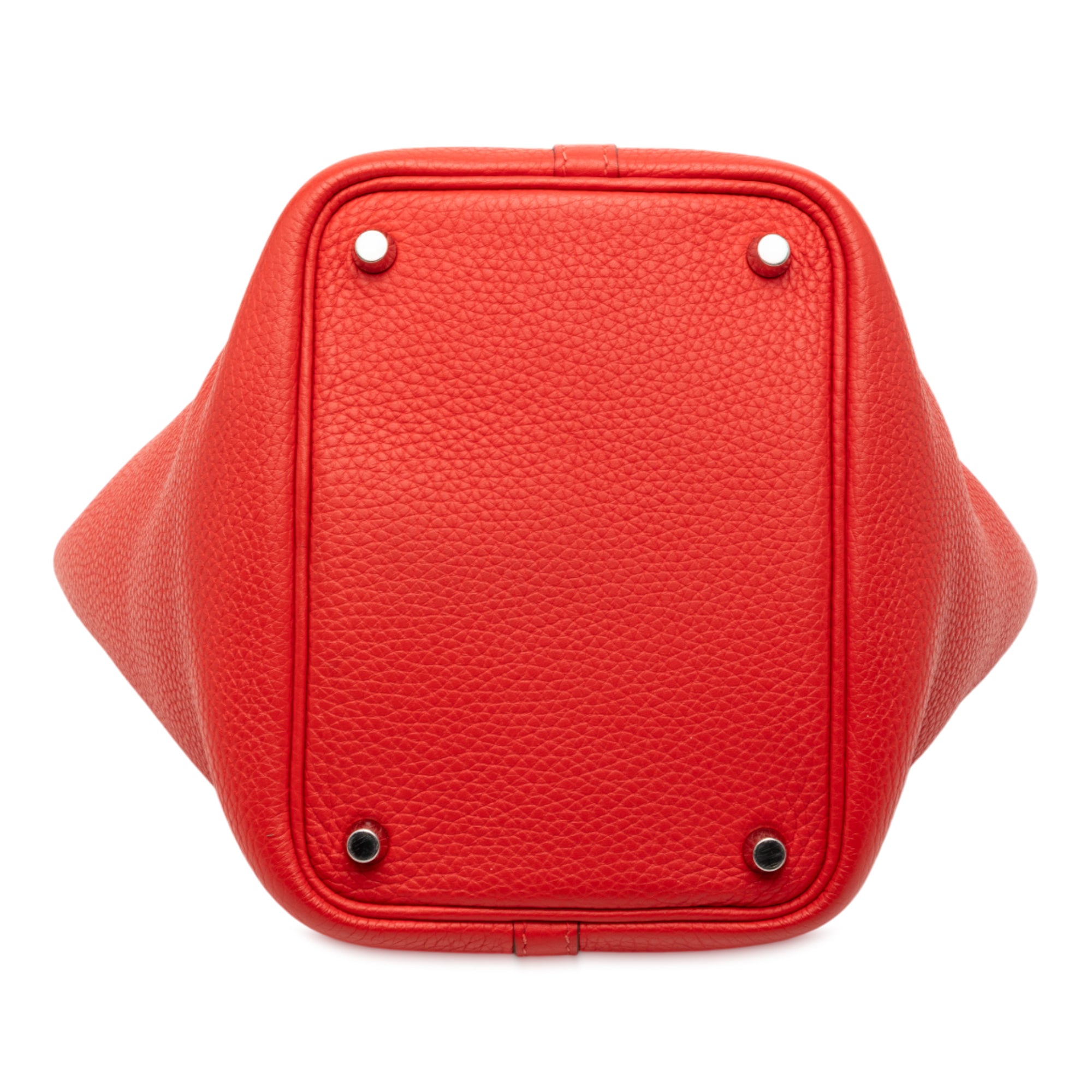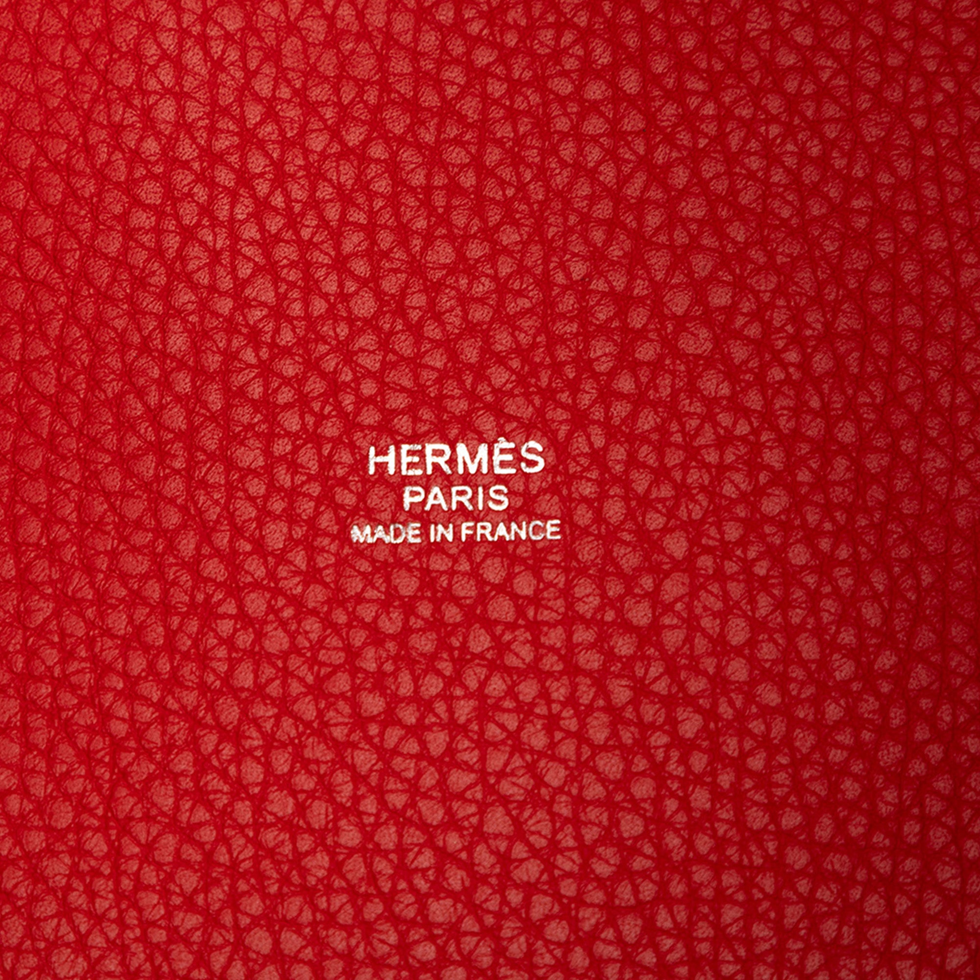 This Picotin Lock 18 features a Clemence leather body in Rouge Casaque color, leather flat handle, and a top flat strap with buckle closure. Retail Price: 3853.00