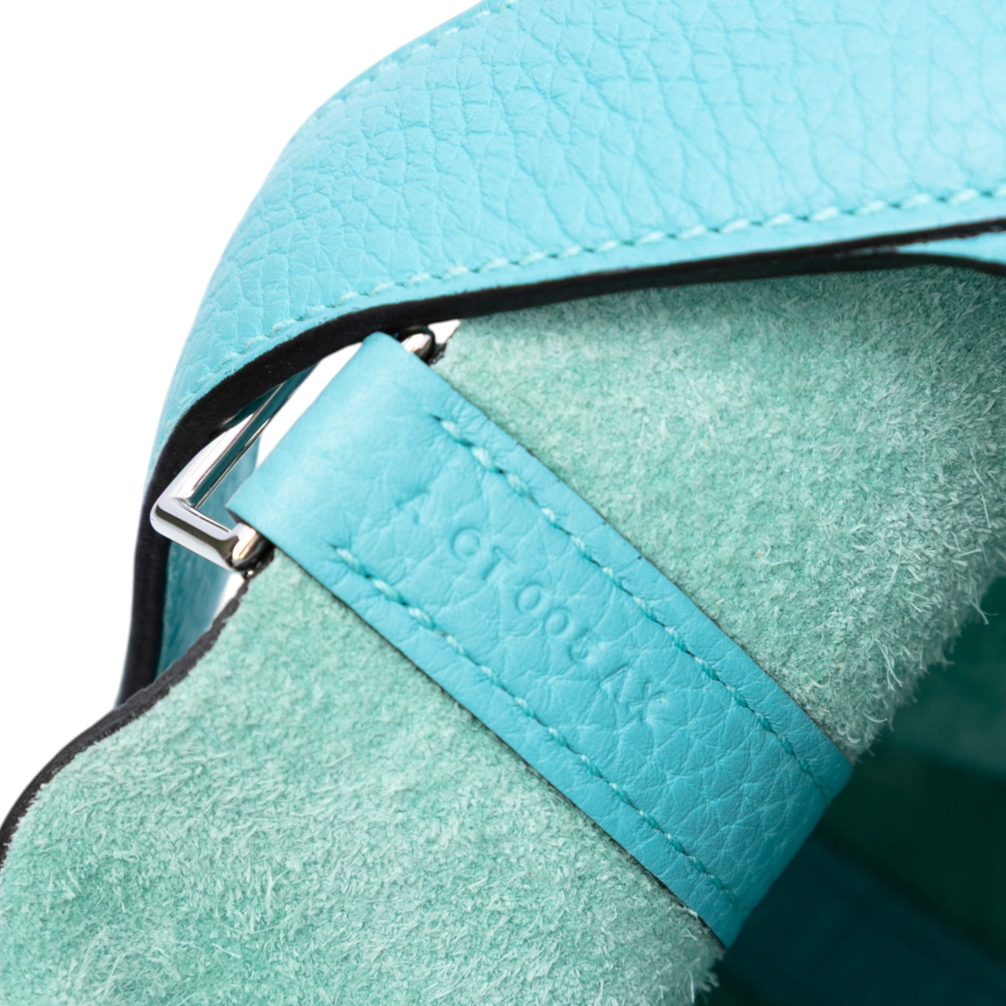 This Picotin 22 features a Clemence leather body in Blue Atoll color, flat leather handles, and an open top with a flat strap and buckle closure. Retail Price: 3575.00