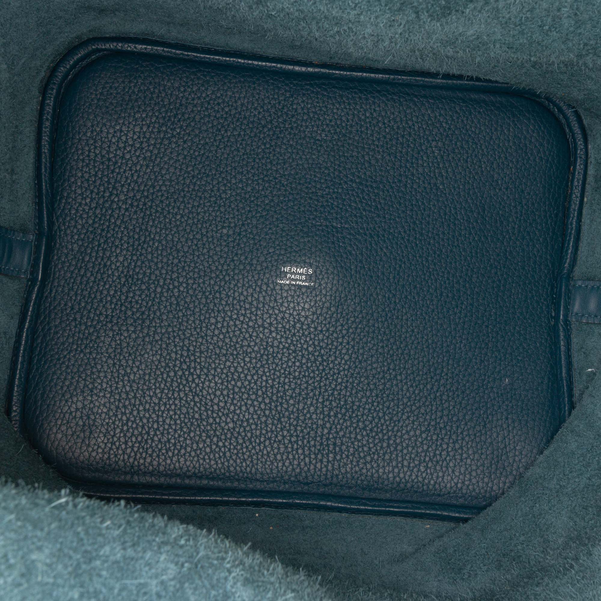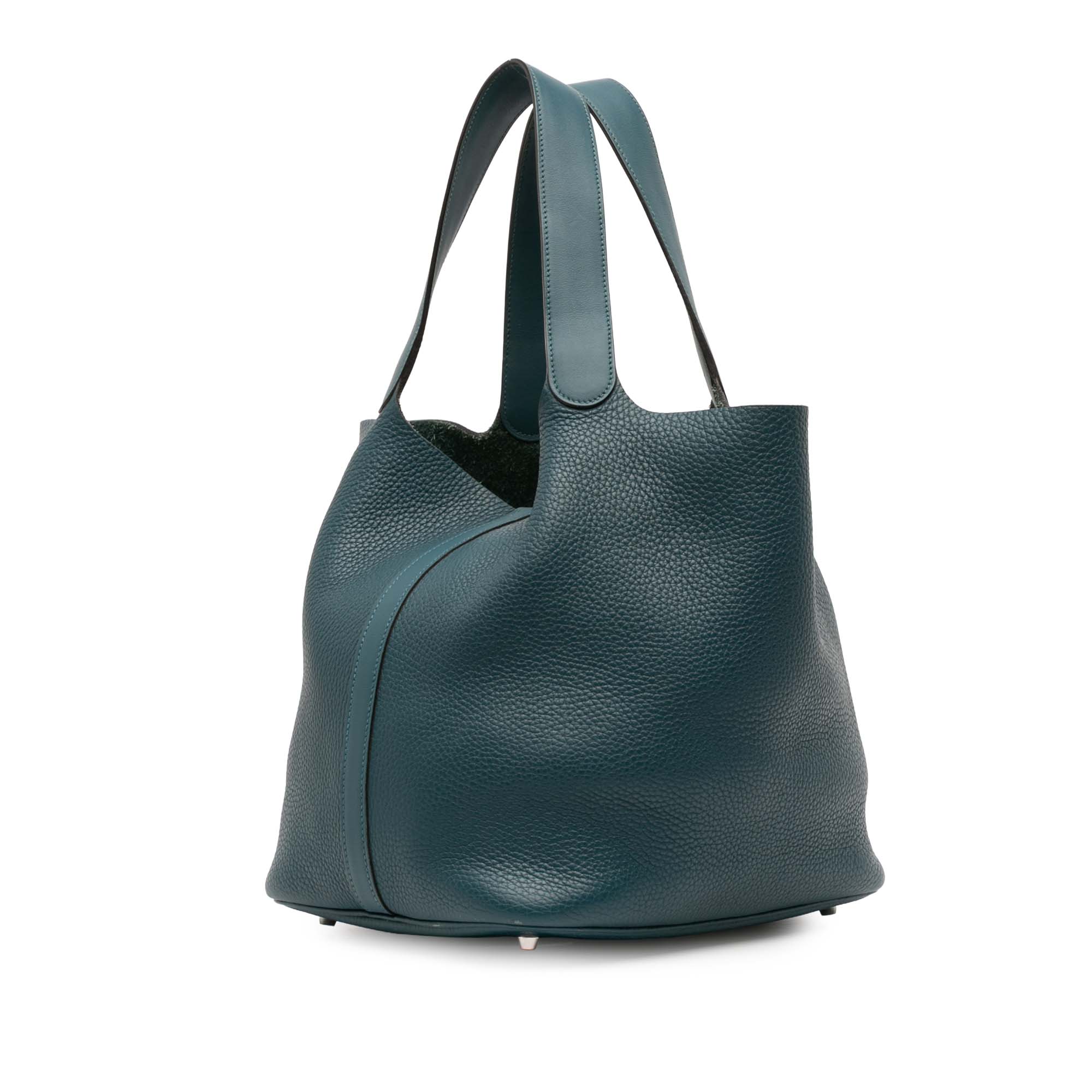 This Picotin 26 features a Clemence leather body in Vert Cypress color, flat handles, and an open top with a flat strap and buckle closure. Retail Price: 3025.00