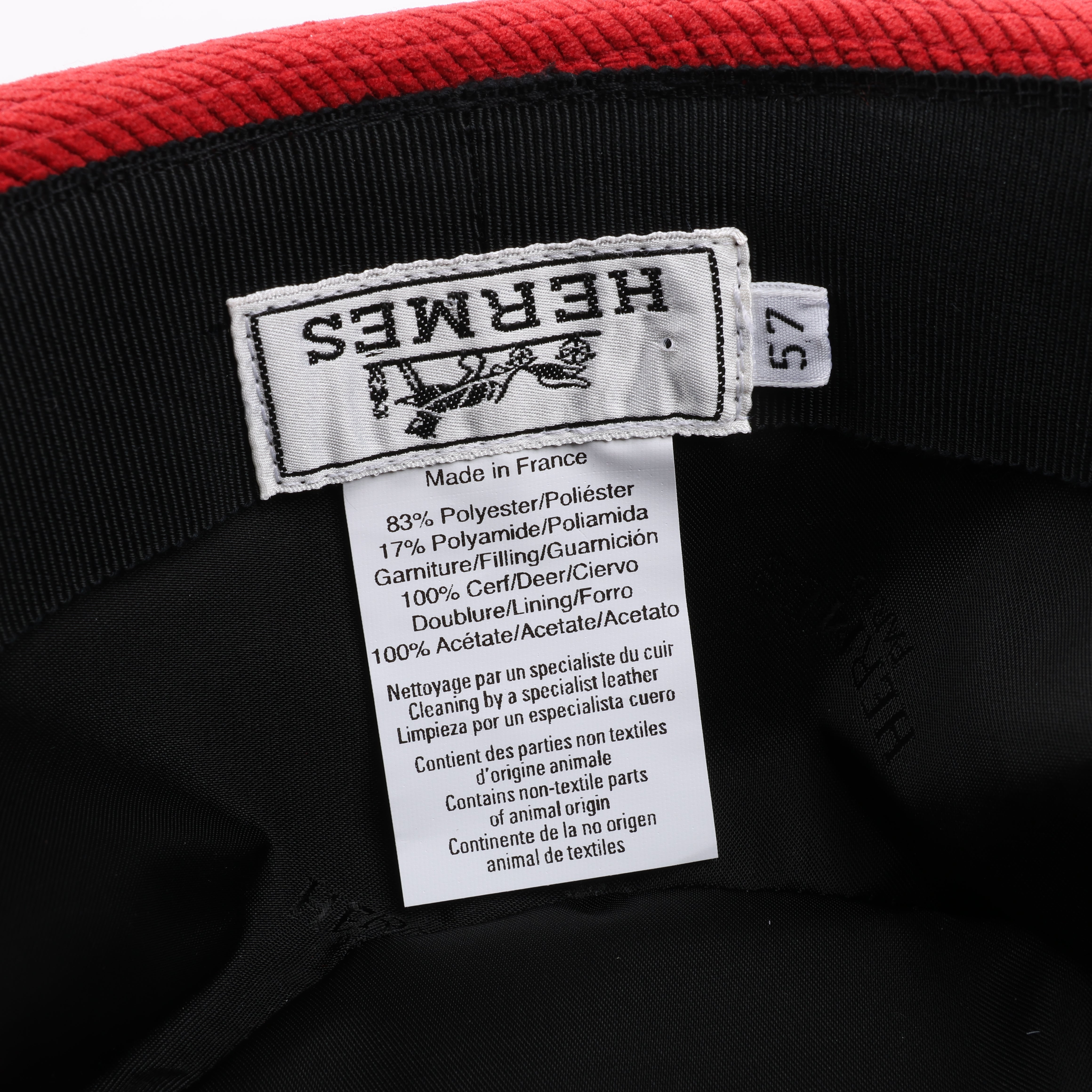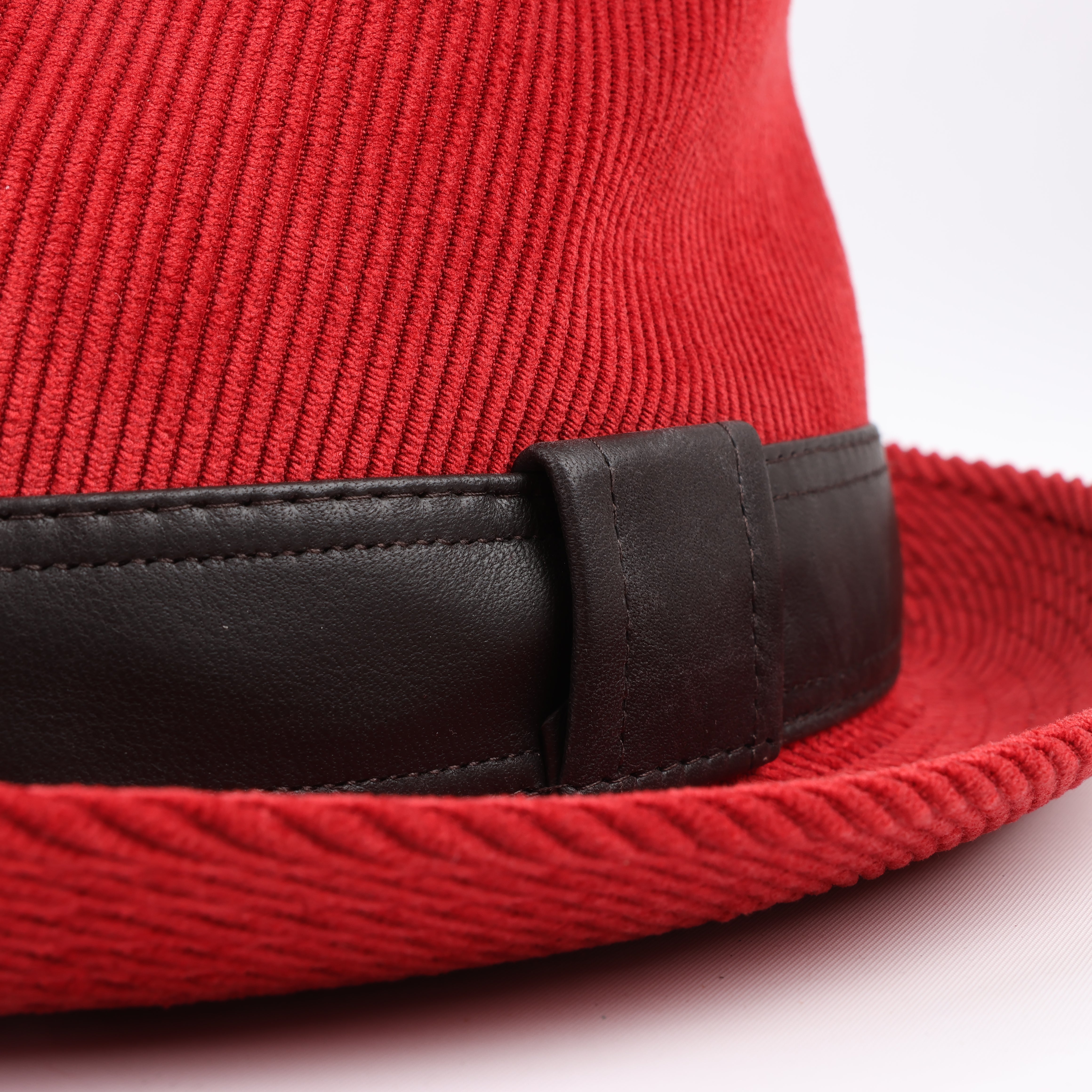 Hermès Corduroy Fedora Hat in vibrant red, featuring a sleek black leather band. This sophisticated hat showcases Hermès' renowned craftsmanship, blending bold design with luxurious texture for a statement accessory perfect for elevating any ensemble.Brand: Hermes