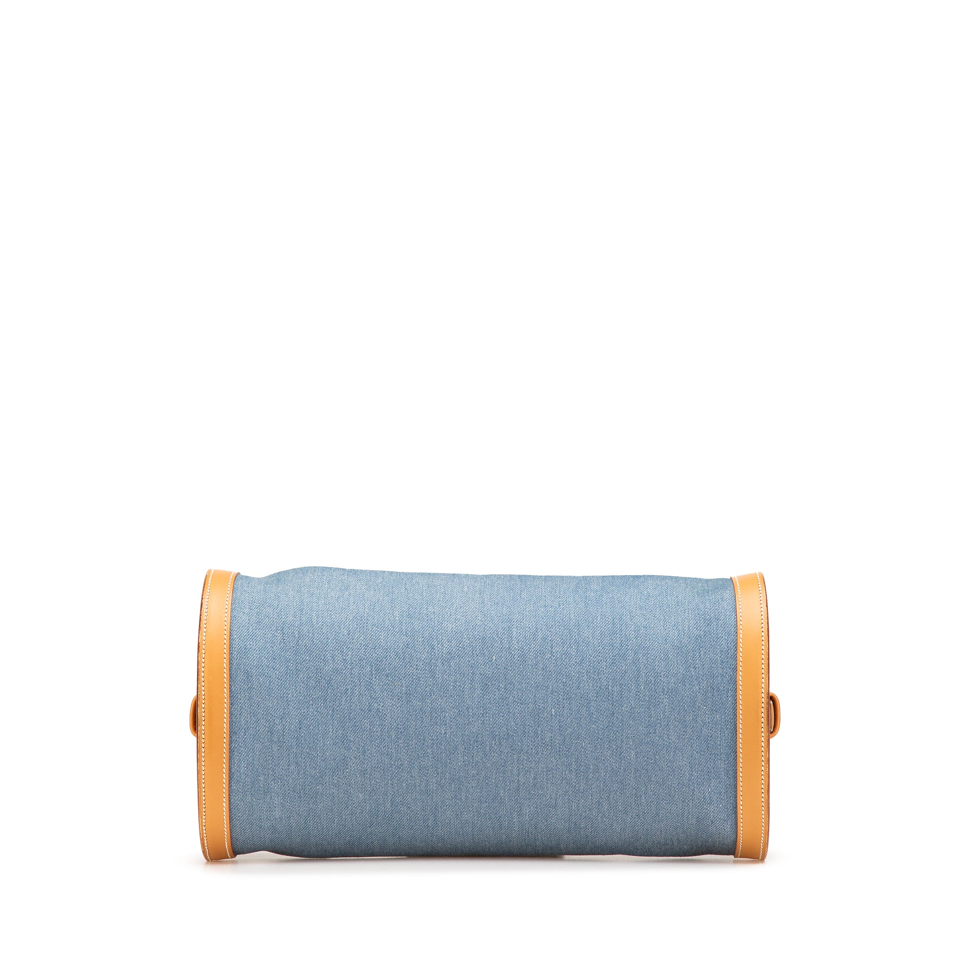 The Doremi features a denim body with leather trim, flat leather straps, and a top zip closure. Retail Price: 2575.00