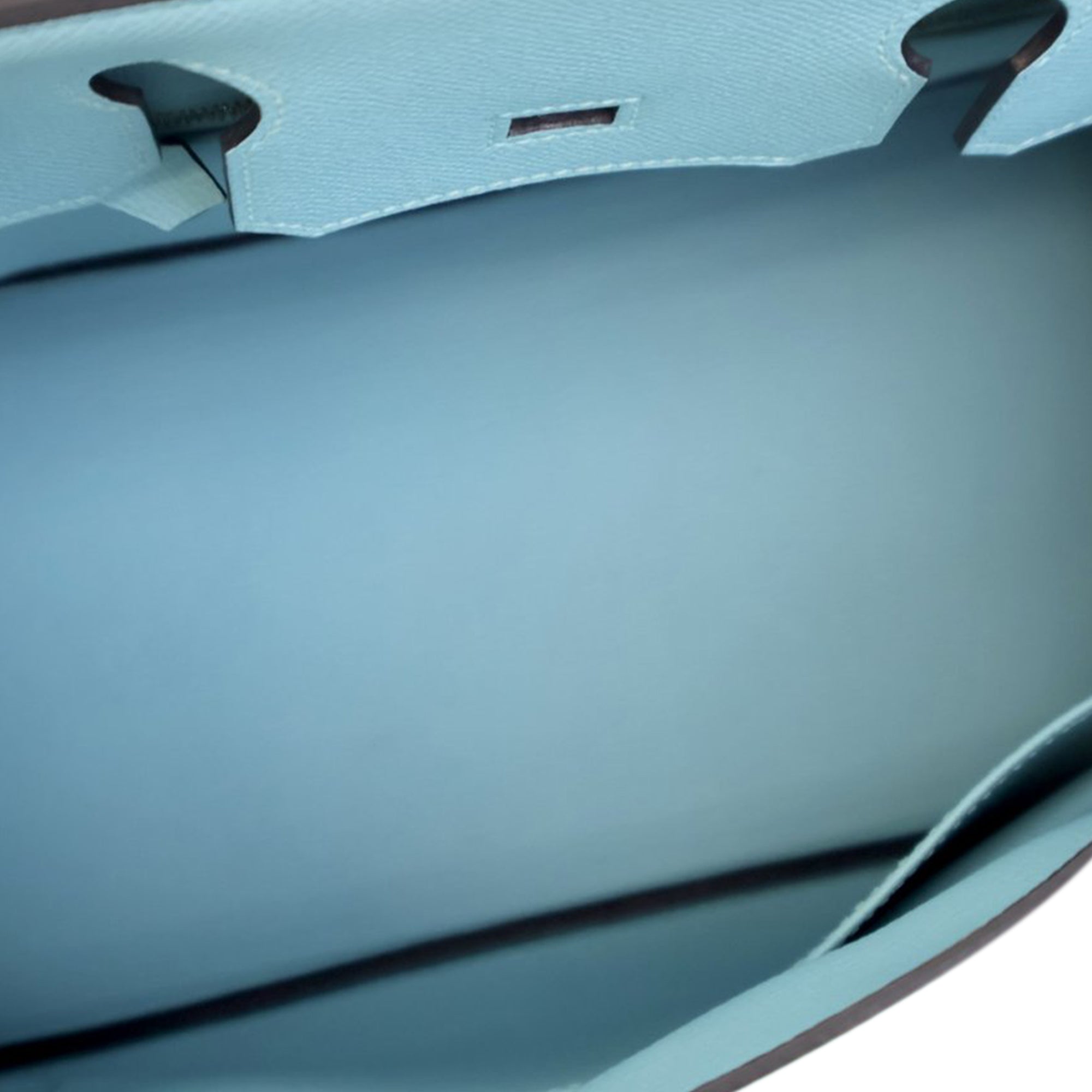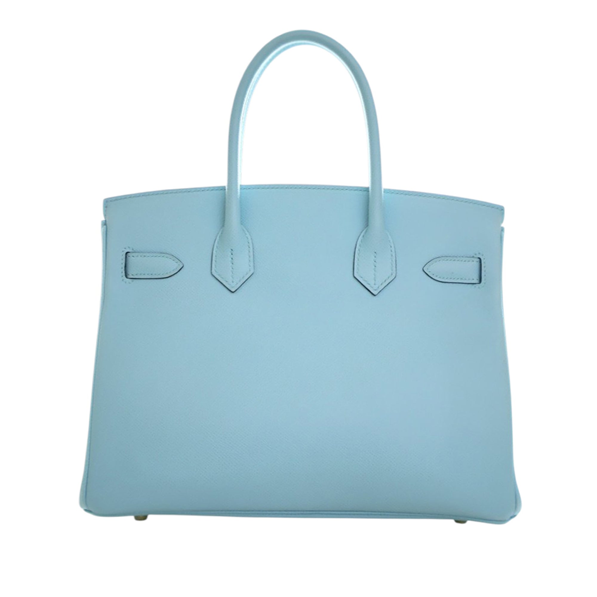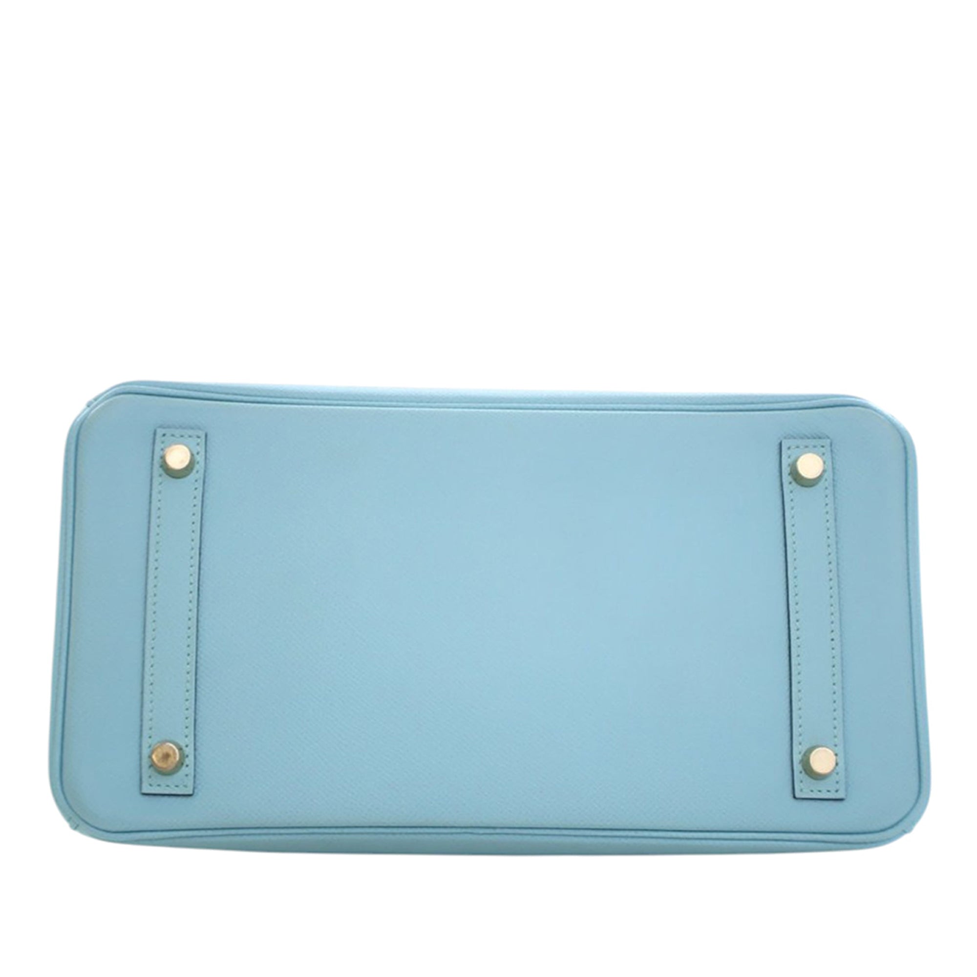 The Birkin 30 features an epsom leather body in Bleu Atoll color, rolled leather handles, a front flap with turn-lock closure, and interior slip and zip pockets. Inclusion: Dust bag, box. Retail Price: 26000.00