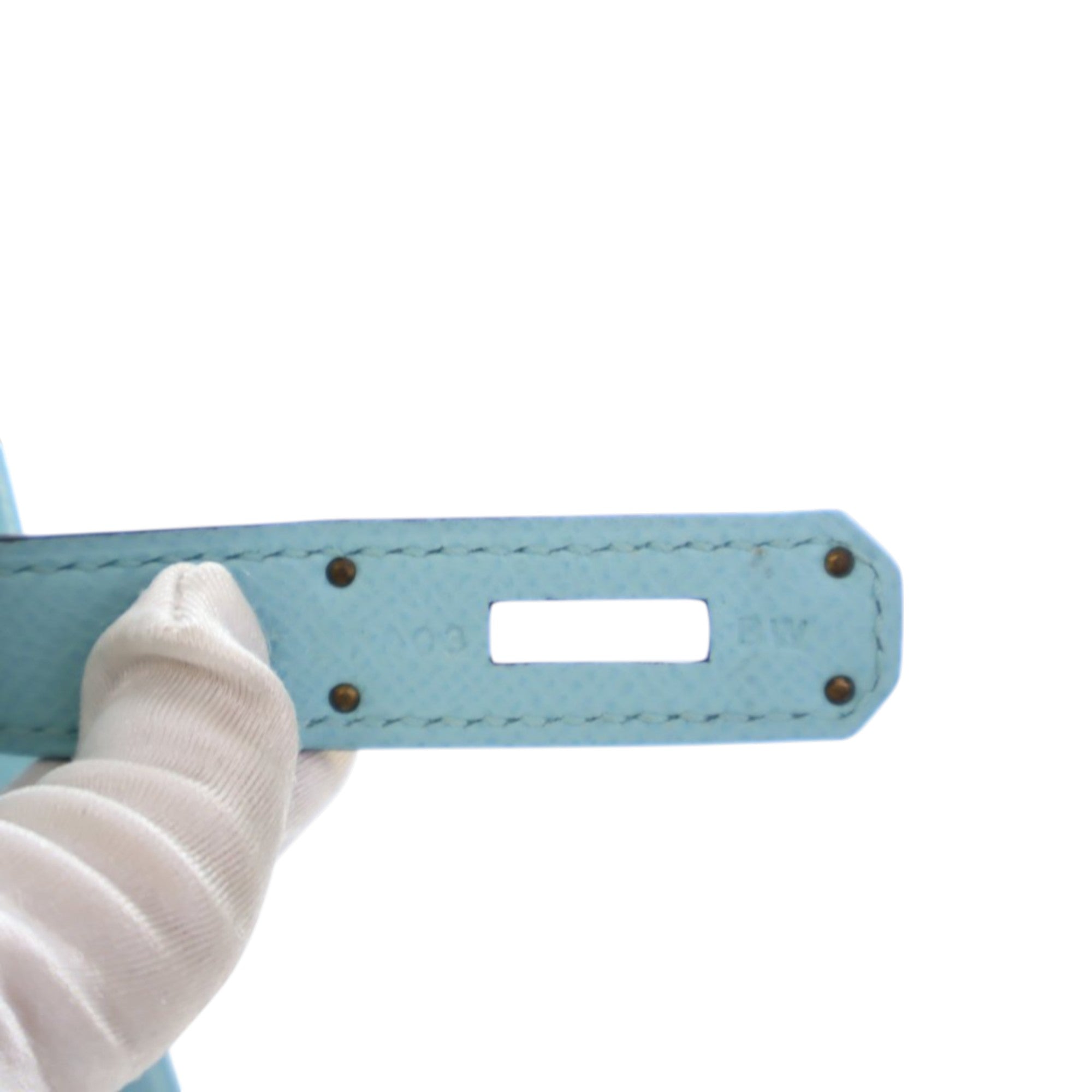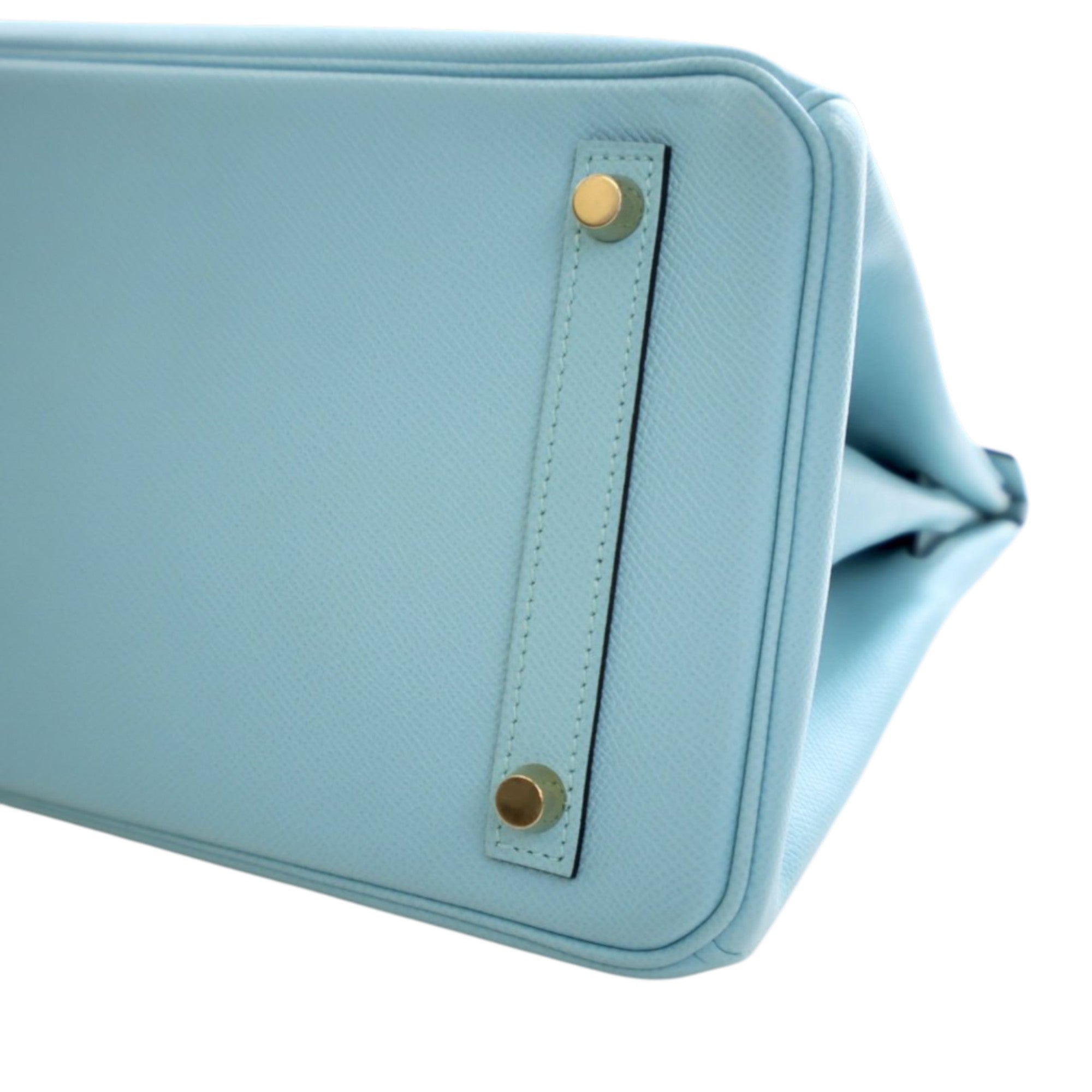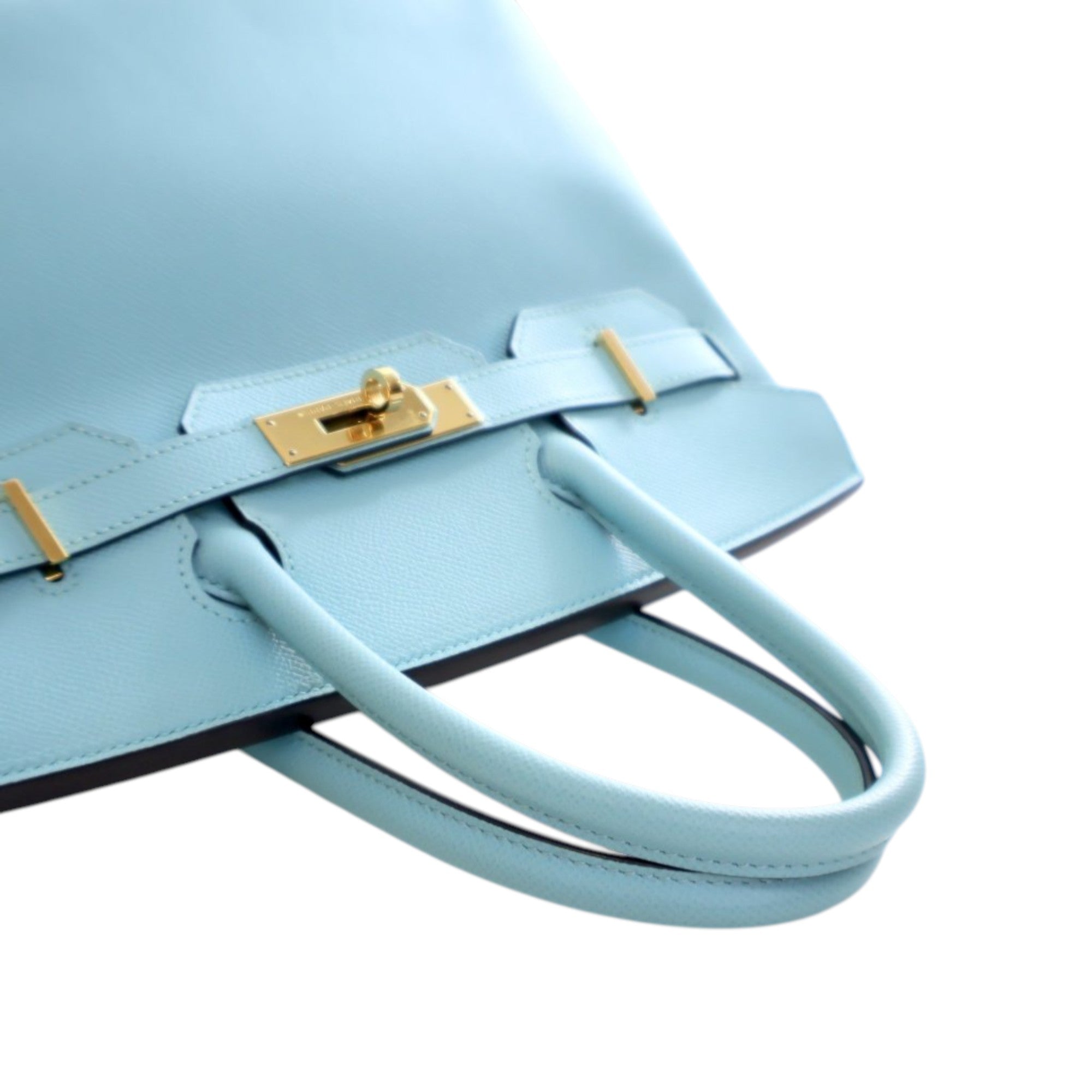 The Birkin 30 features an epsom leather body in Bleu Atoll color, rolled leather handles, a front flap with turn-lock closure, and interior slip and zip pockets. Inclusion: Dust bag, box. Retail Price: 26000.00