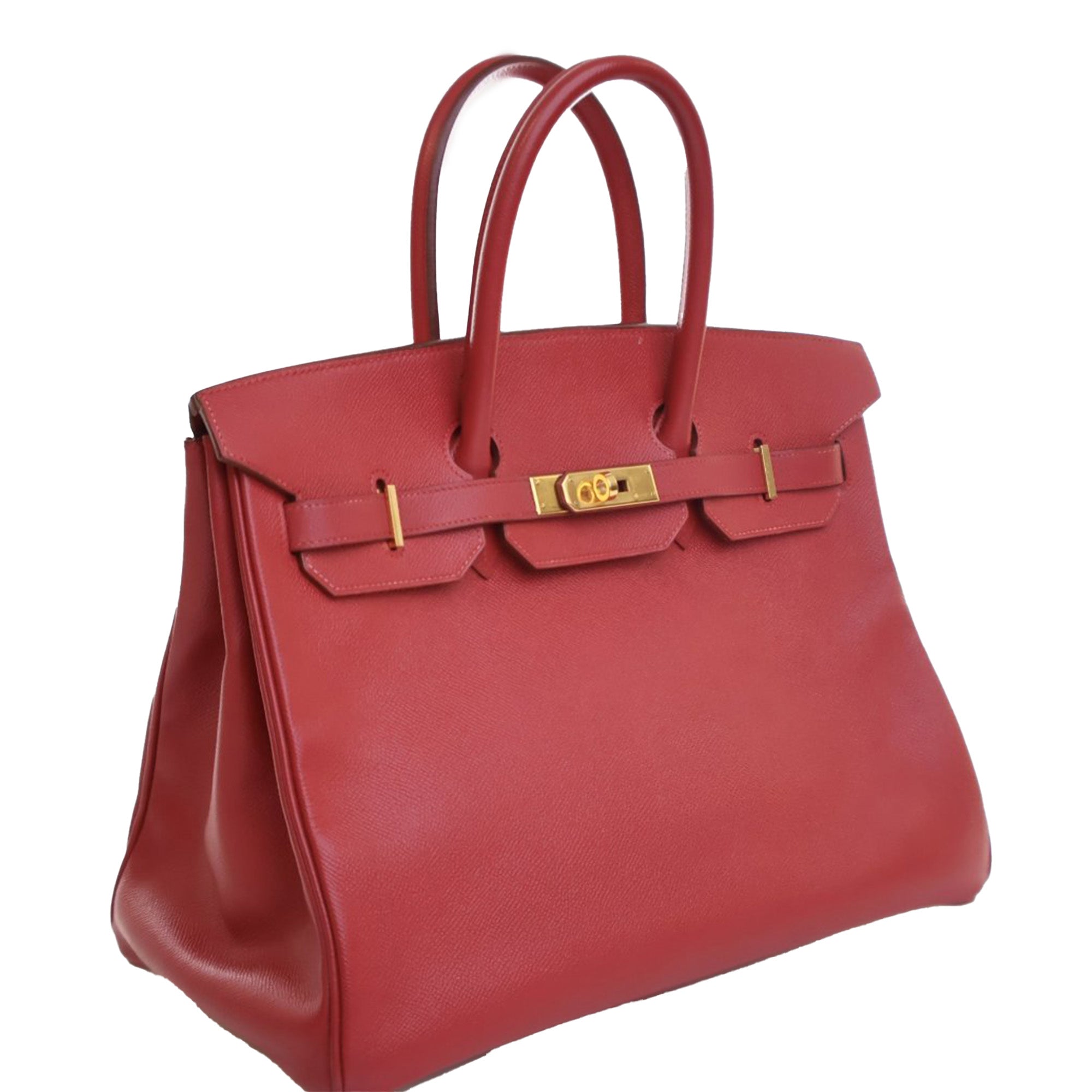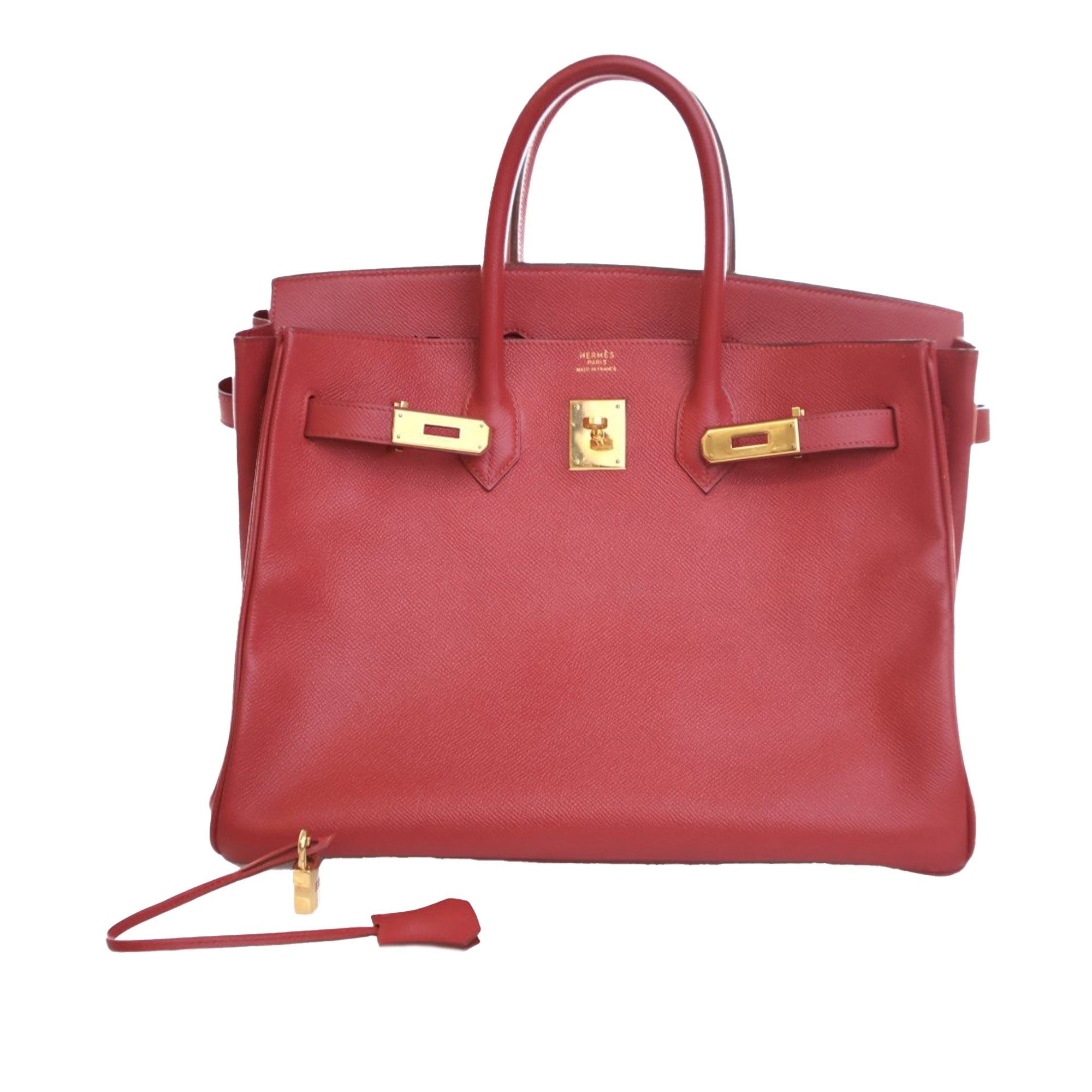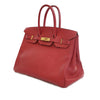 This Birkin 35 features an Epsom leather body in Rouge Vif color, rolled leather handles, a front flap with a strap and turn lock closure, and interior zip and slip pockets. Retail Price: 20085.00
