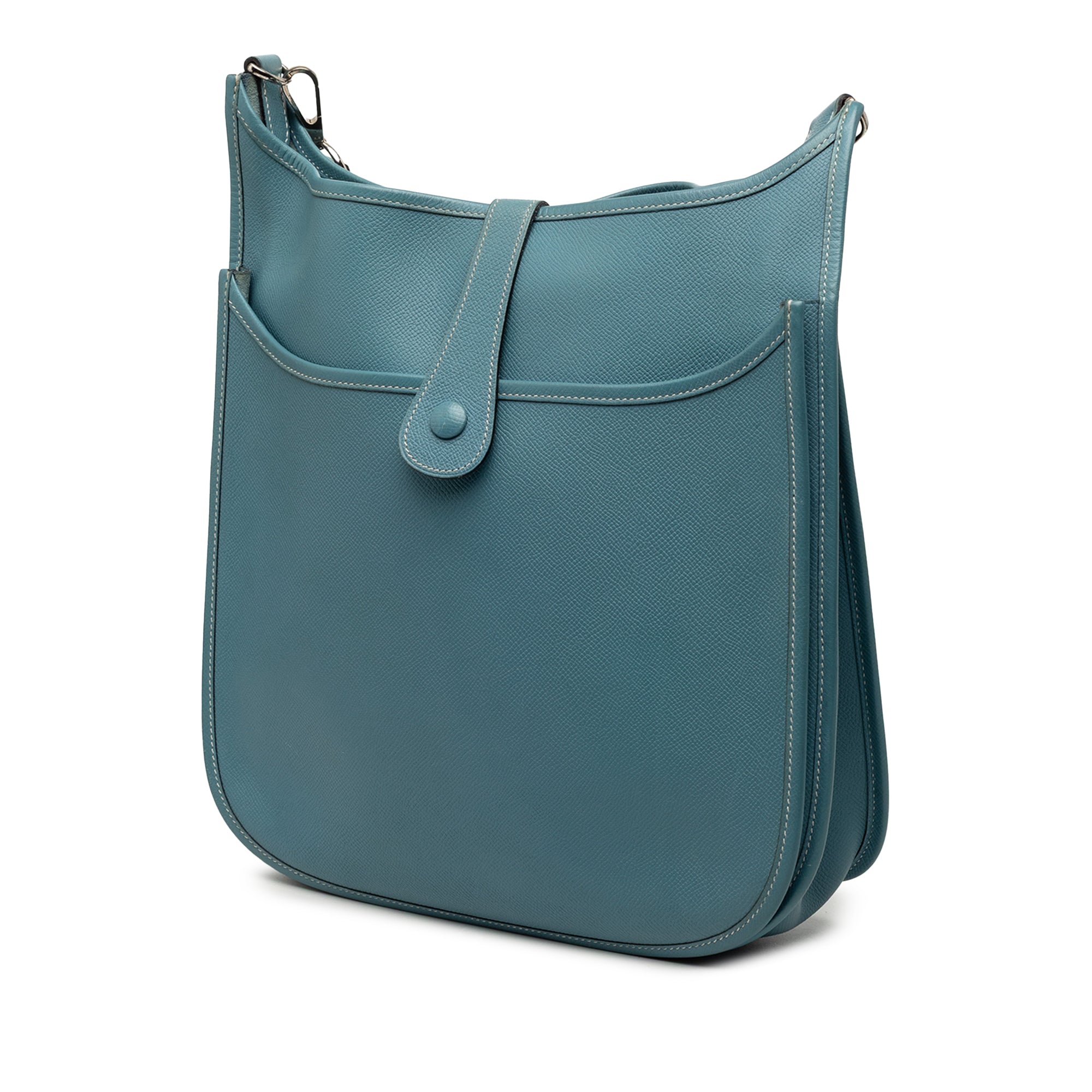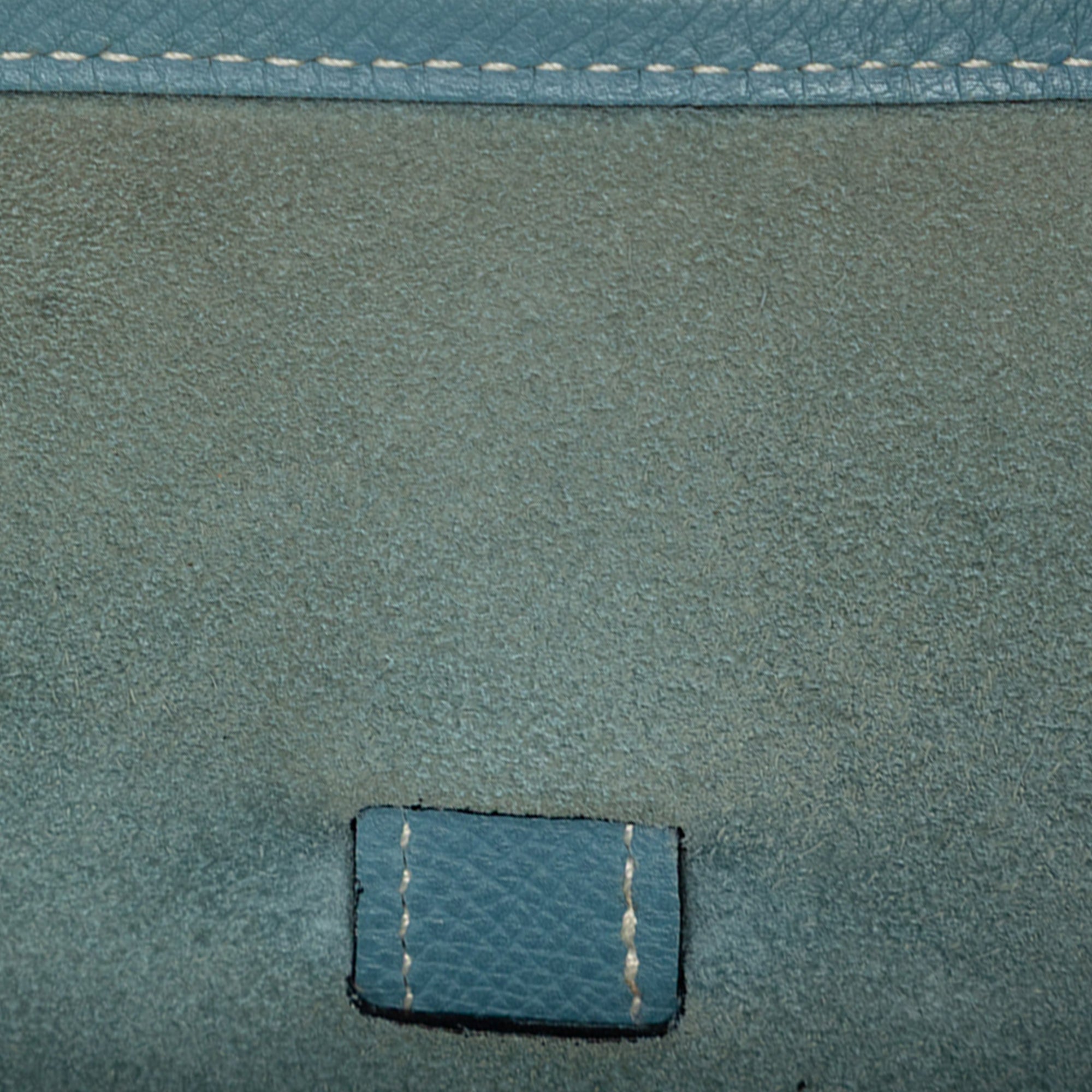 This Evelyne II features an Epsom leather body in Blue Jean color, a detachable flat canvas strap, an open top with a strap and snap closure, and an exterior slip pocket. Retail Price: 3925.00