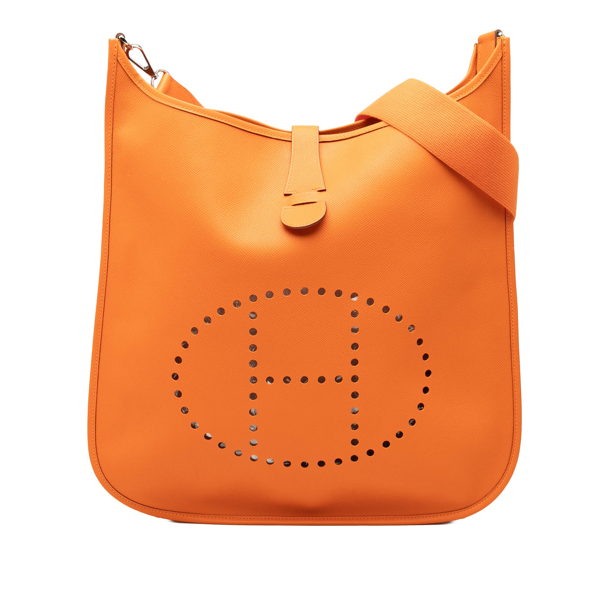 This Evelyne II features an Epsom leather body in Orange color, a flat canvas strap, an open top with a strap and snap button closure, and an exterior slip pocket. Retail Price: 6100.00