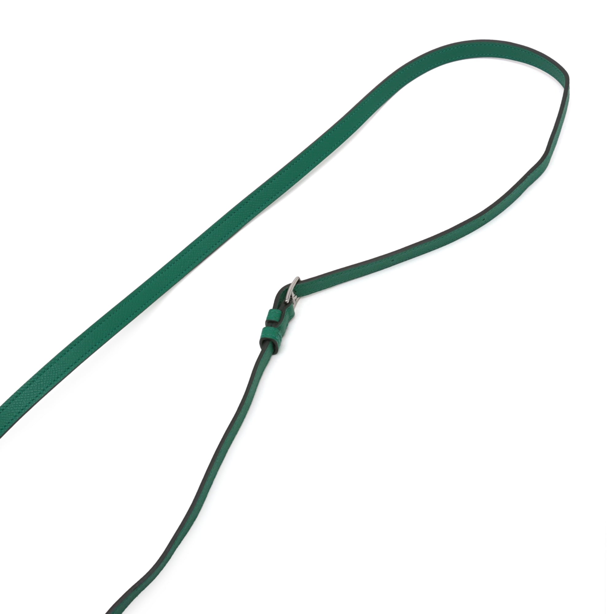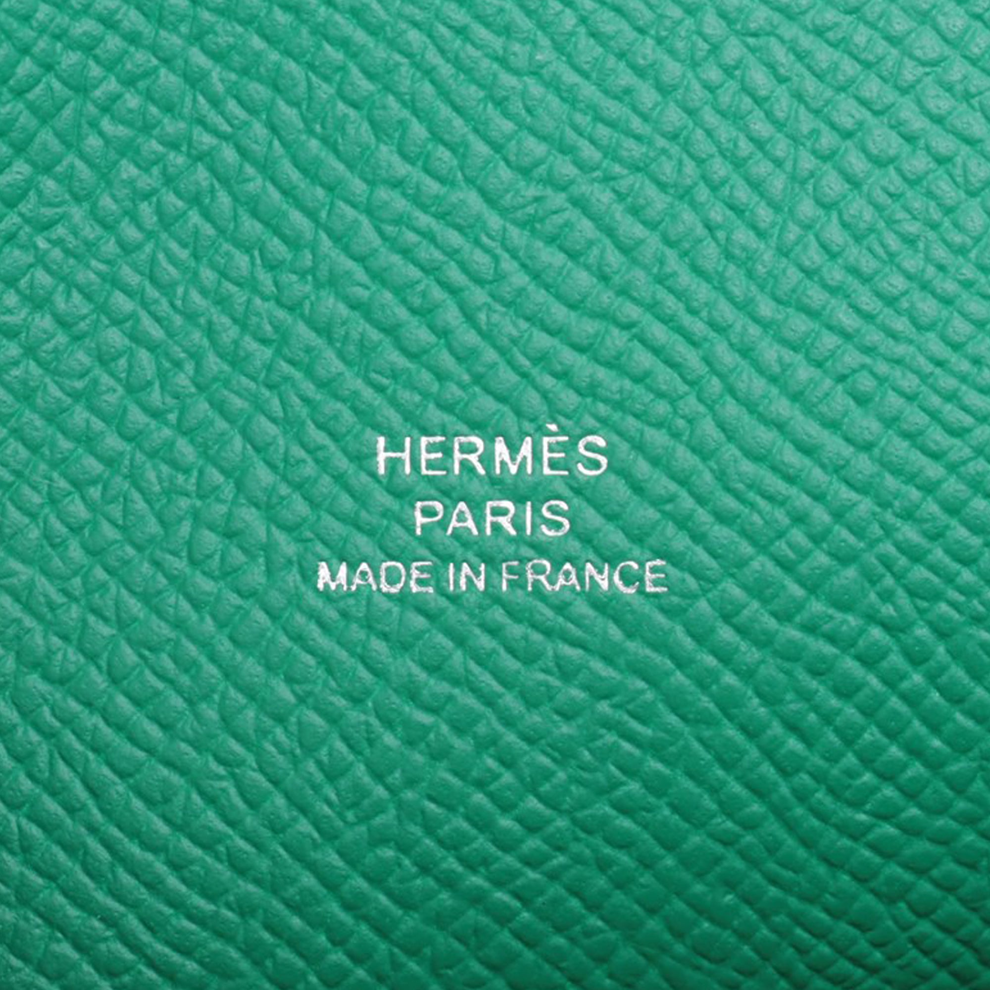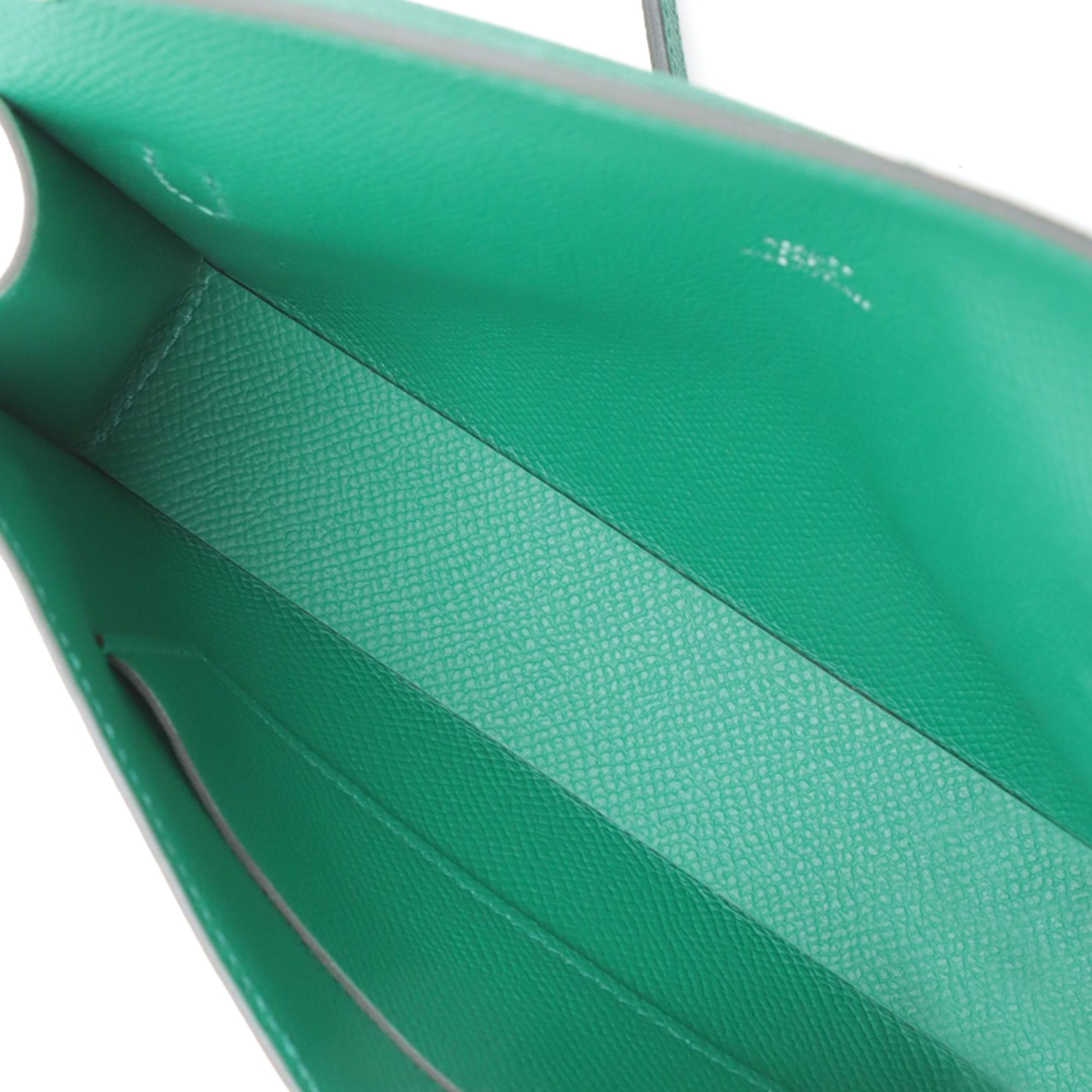 This Hermesnap wallet on strap features an Epsom leather body in Vert Vertigo color, an adjustable flat strap, a front flap with snap closures, and an interior slip pocket. Inclusion: box. Retail Price: 3750.00