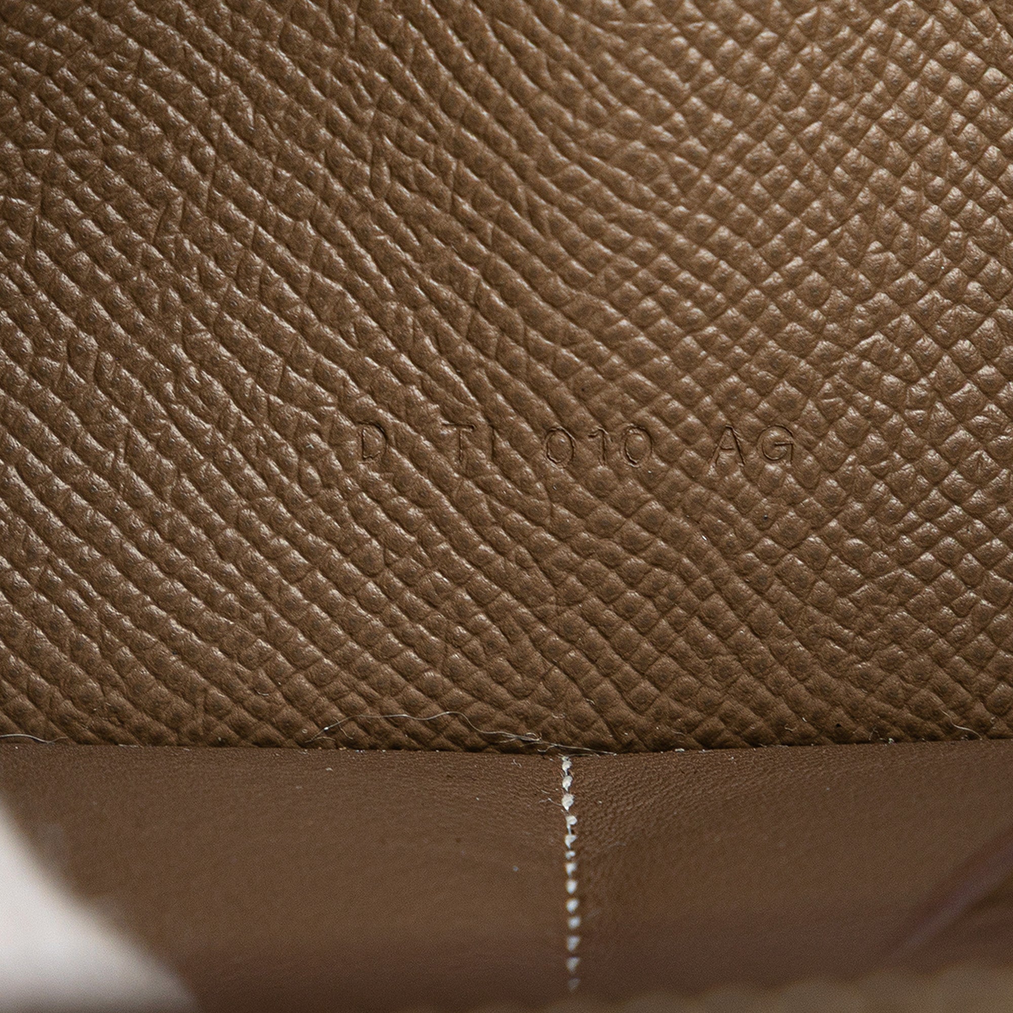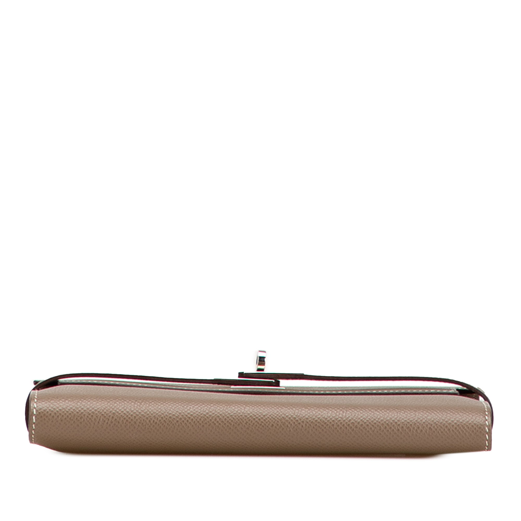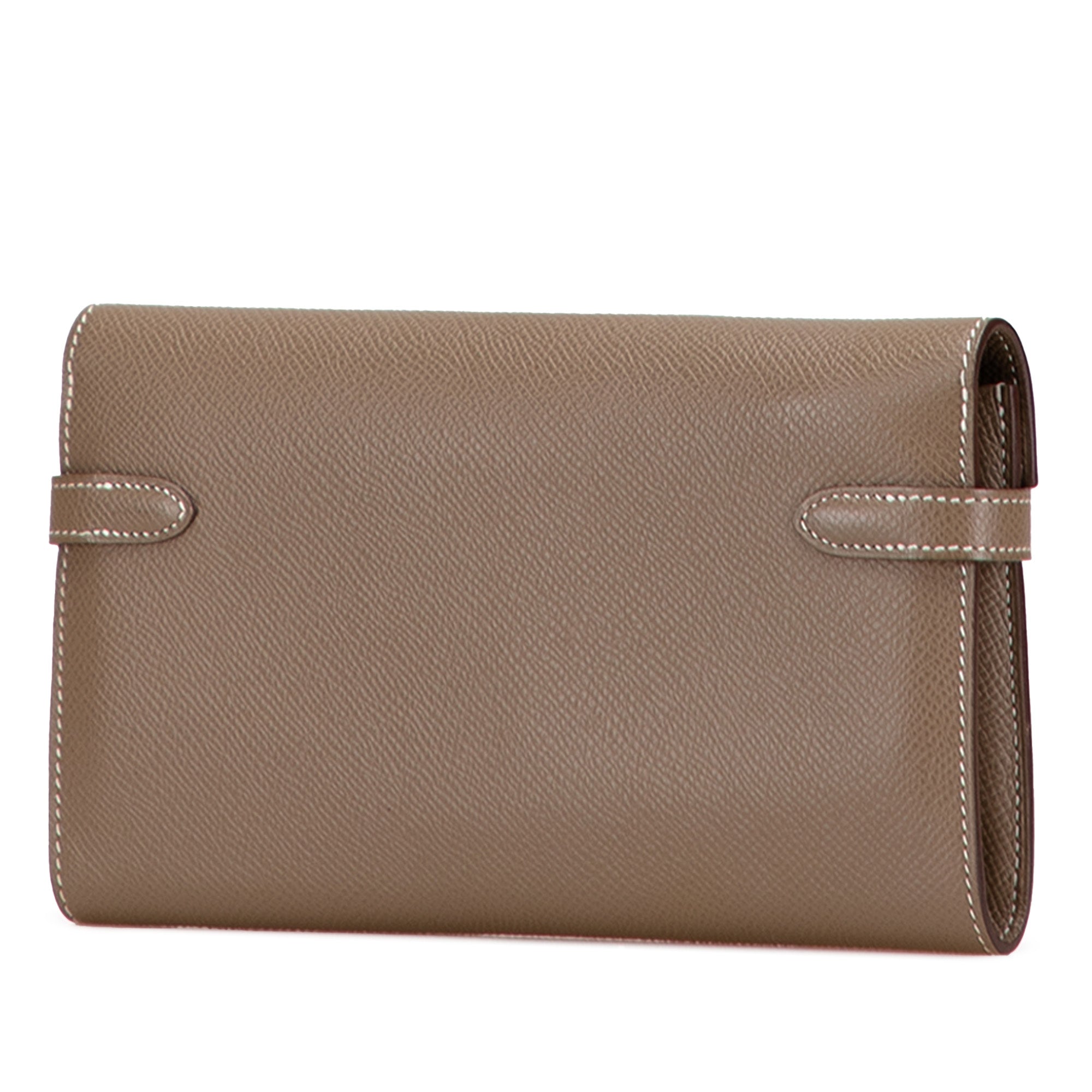 This Kelly wallet features an Epsom leather body in Etoupe color, a front flap with turn lock closure, and interior zip and slip pockets. Retail Price: 5050.00