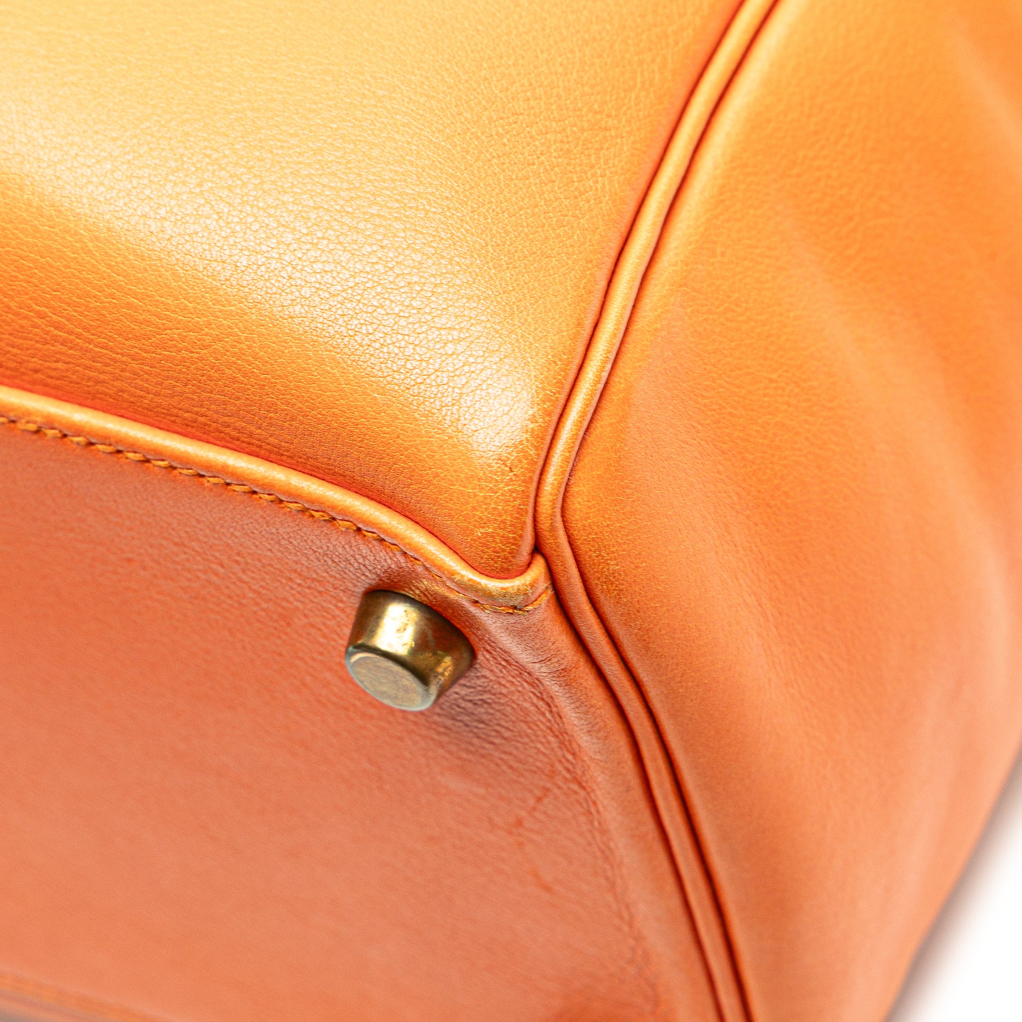 This Kelly 32 features a Gulliver leather body in Orange color, a flat leather top handle, a detachable flat leather strap, a top flap with twist lock closure, gold hardware, and interior zip and slip pockets. Inclusion: Dust bag. Retail Price: 20550.00
