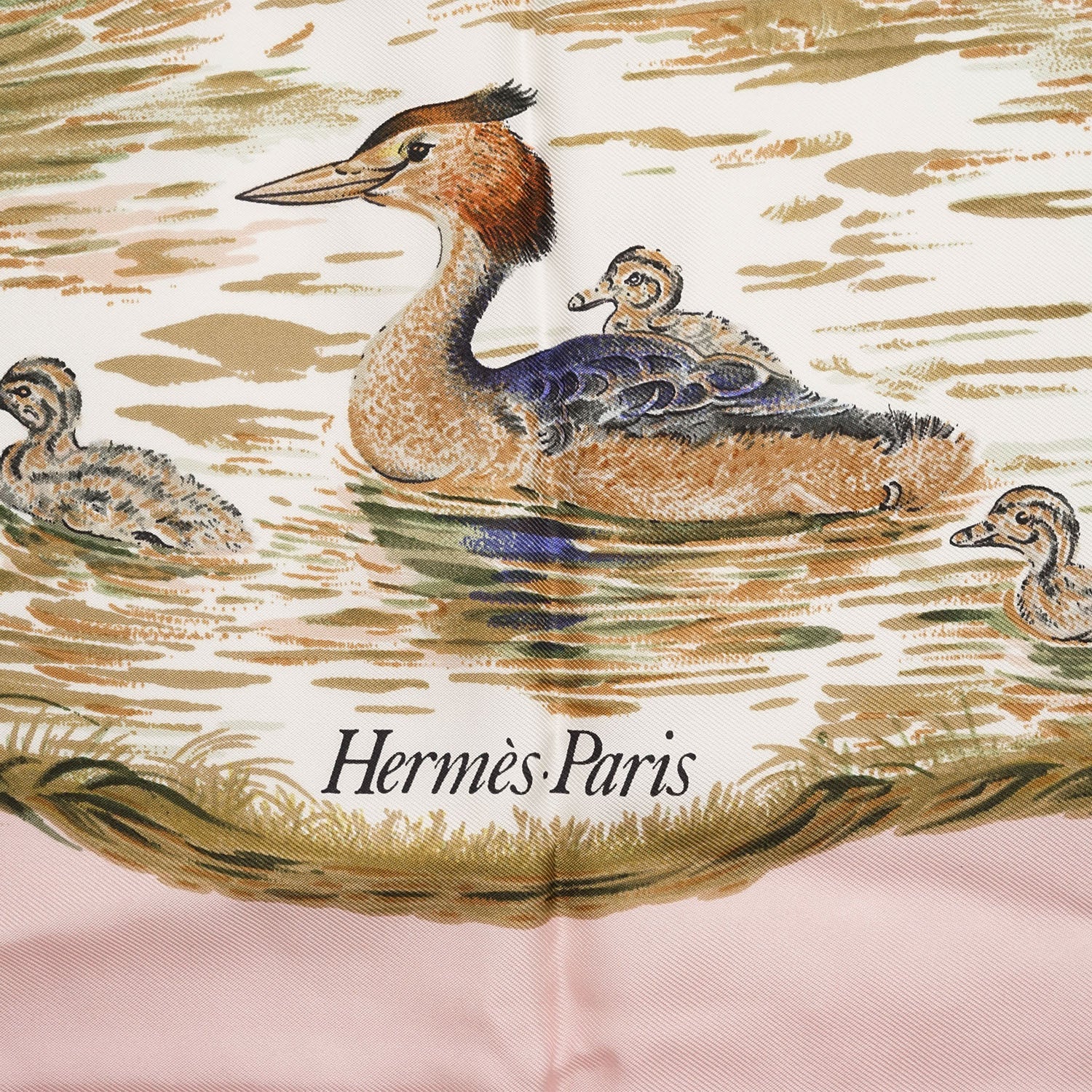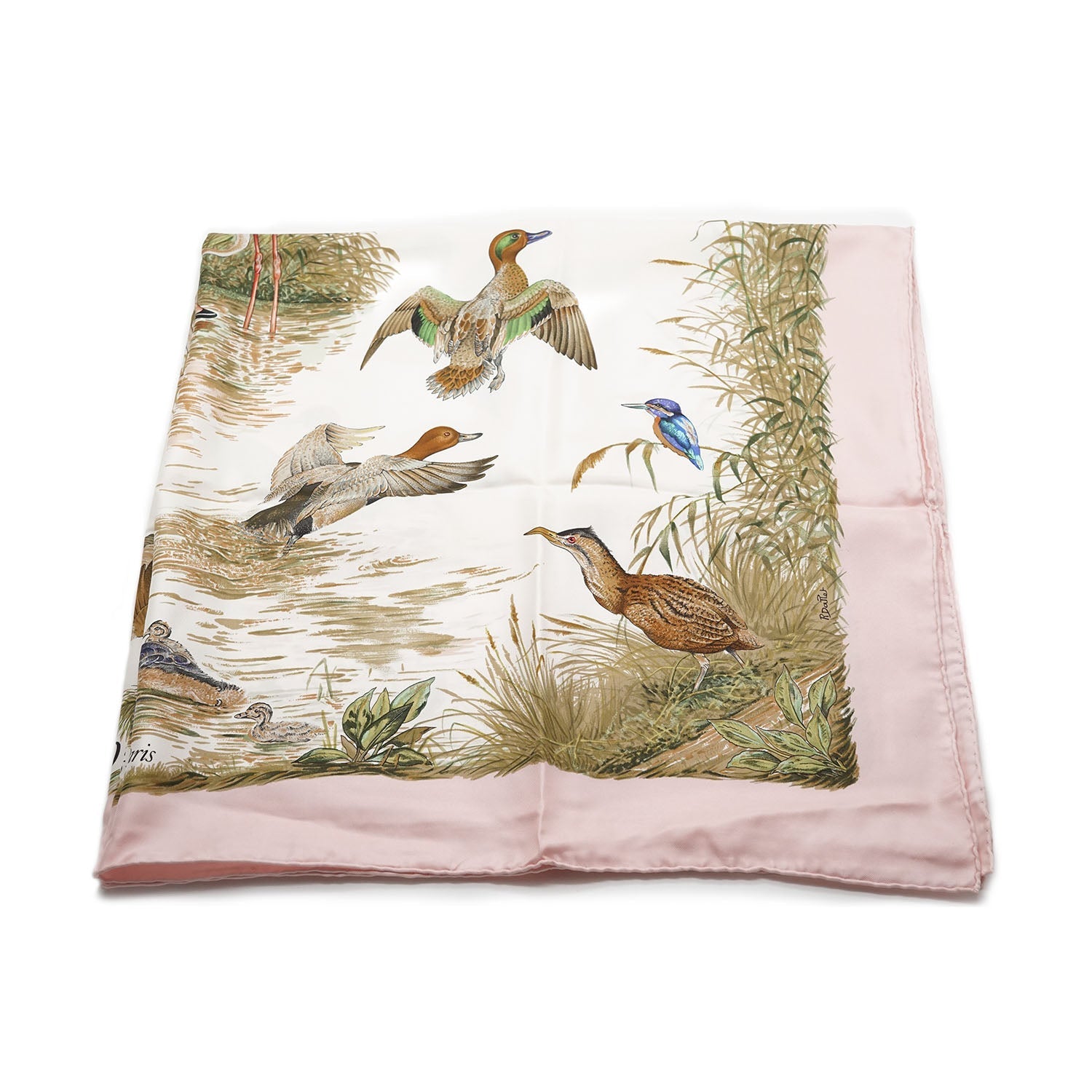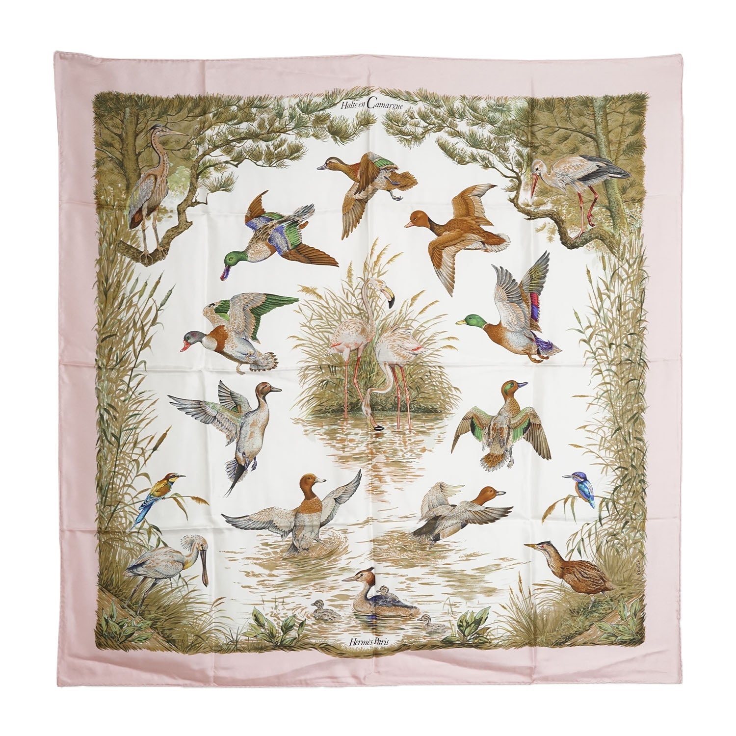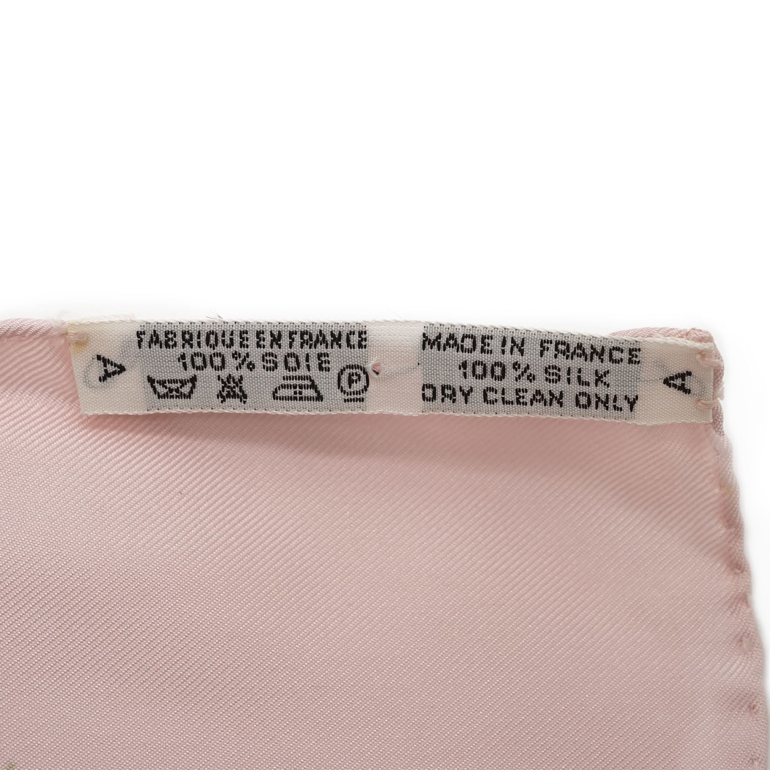 Halte en Camargue Silk Carre 90 Pink SilkHeight: 89cmWidth: 88cmStain: Faint stains on the front/bottom (white section)Tear: Minor tear on the brand tag (undone stitch)Serial code: A A