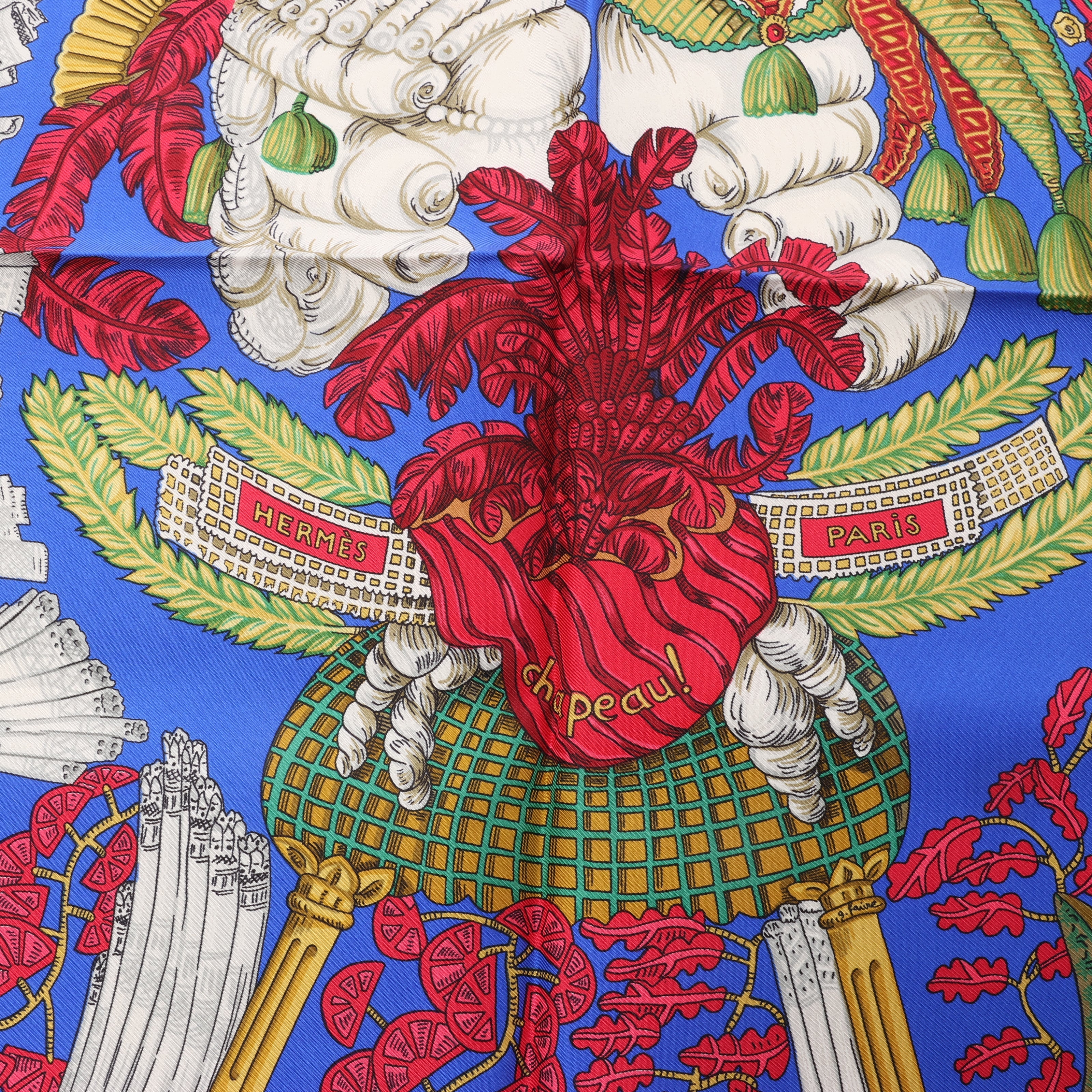 Hermès Carré 90 “Chapeau” scarf in vibrant blue silk showcases an ornate hat-themed design in vivid red, green, and gold tones—an elegant statement piece with playful charm and signature Hermès craftsmanship.