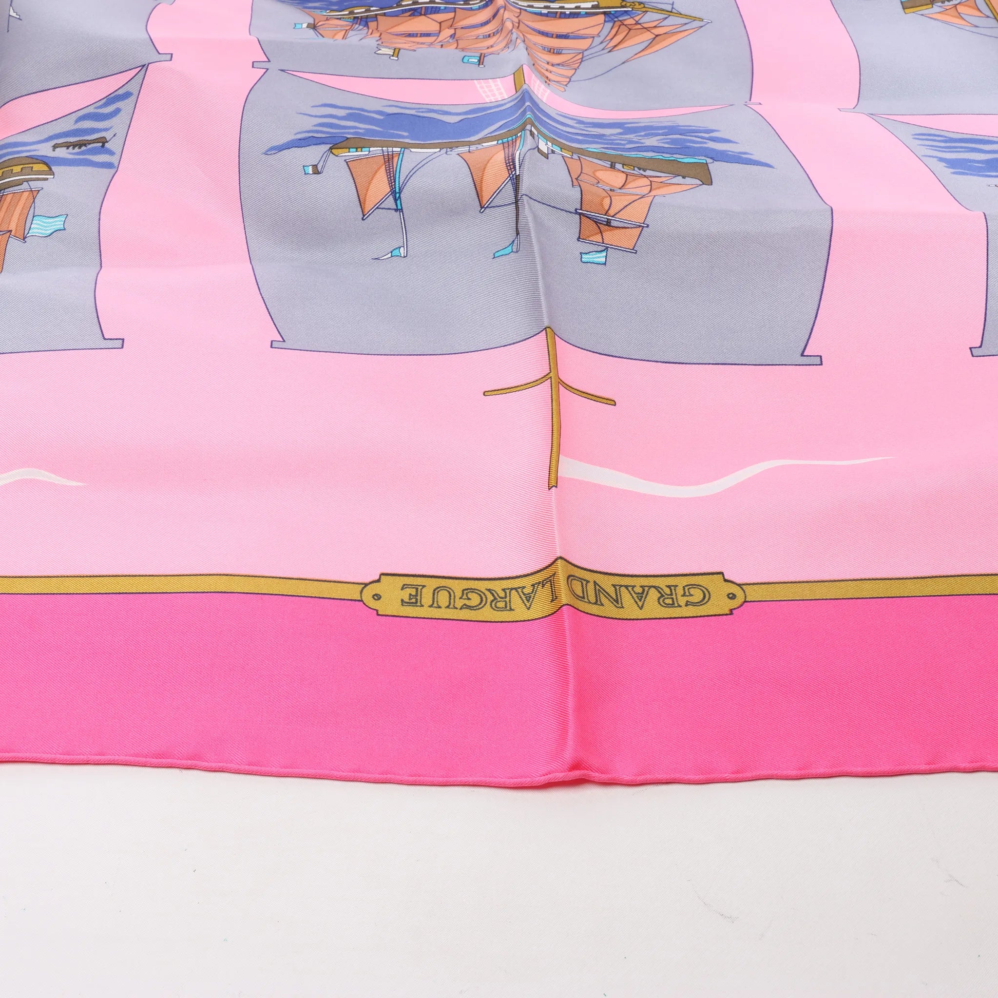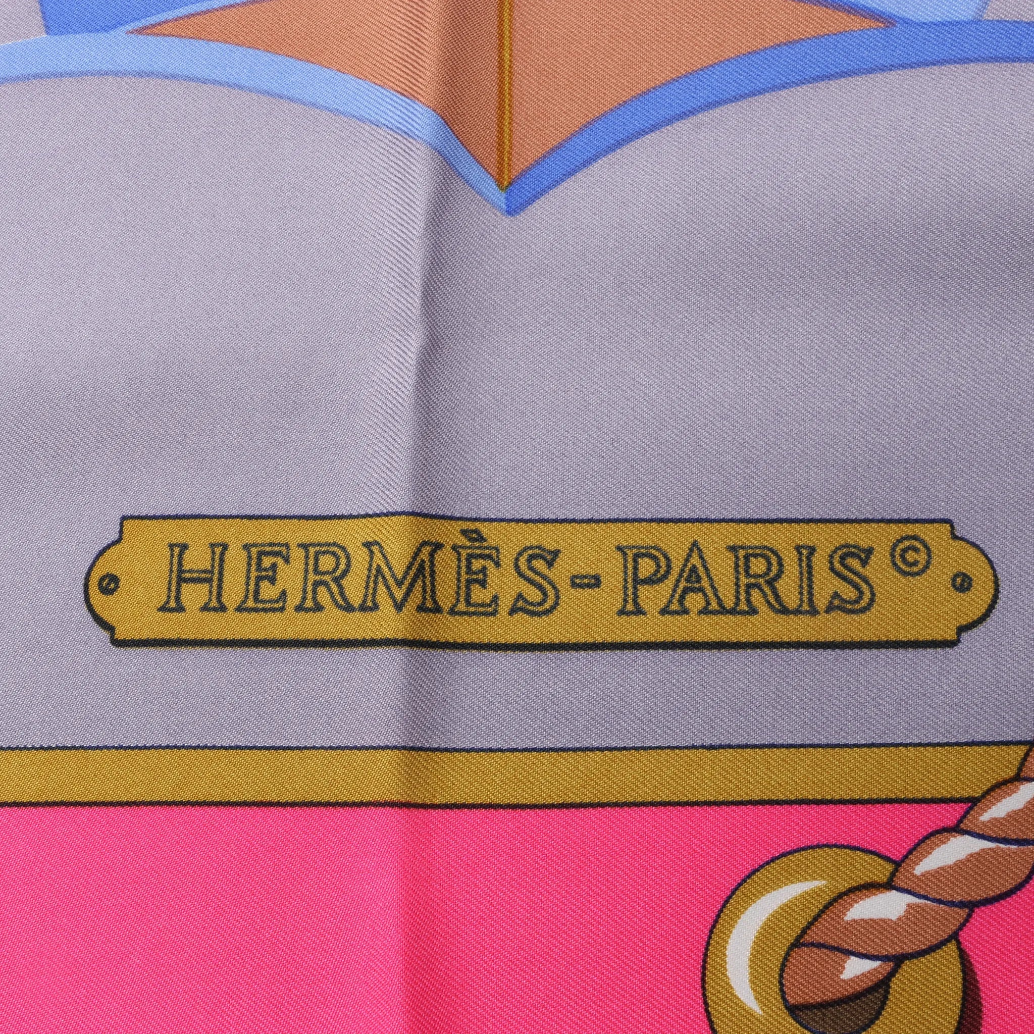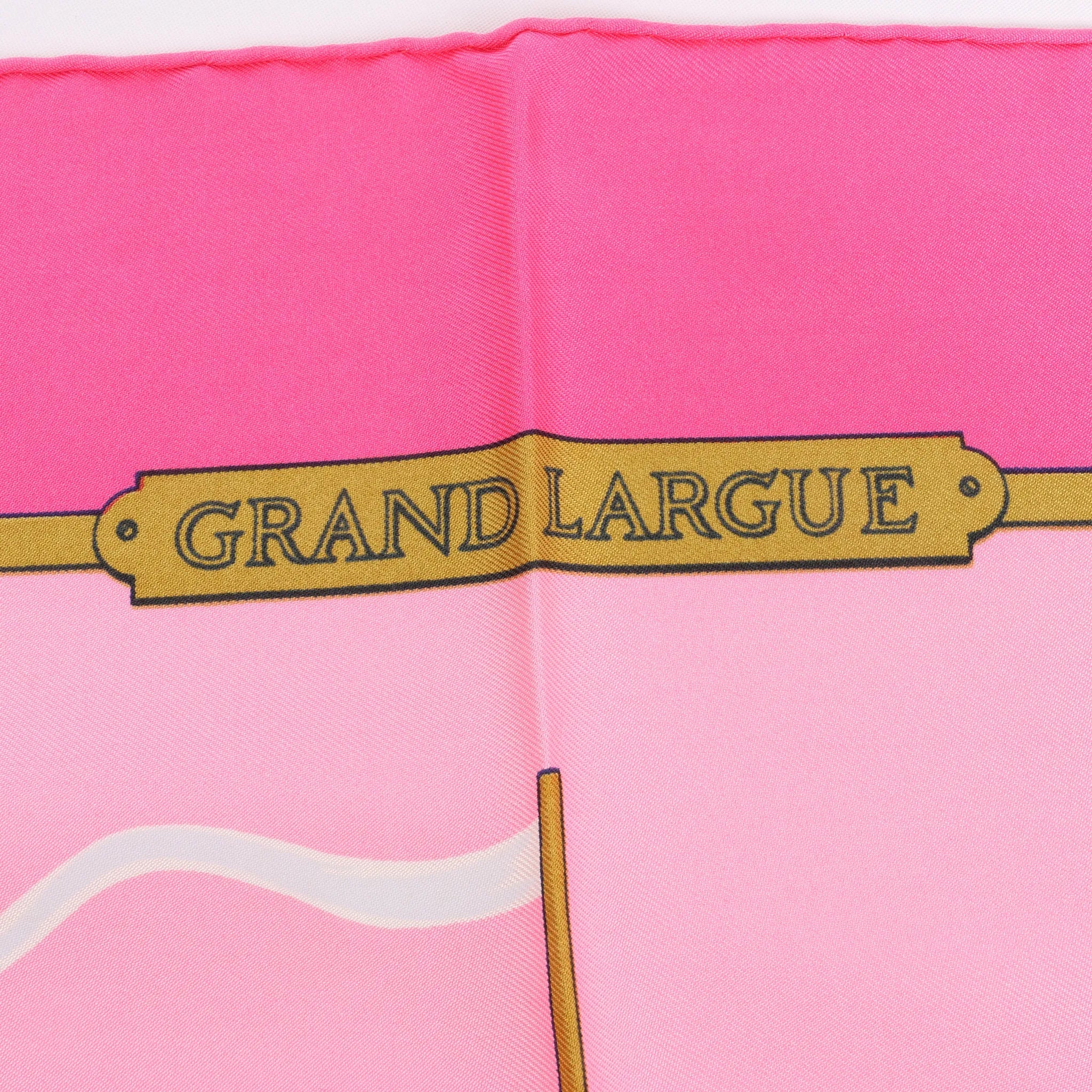 Set sail in style with the Hermès Carré 90 "GRAND LARGUE" silk handkerchief in pink. Crafted from luxurious silk, this nautical-themed scarf features vintage sailing ships and maritime details—perfect for collectors and fashion lovers alike.