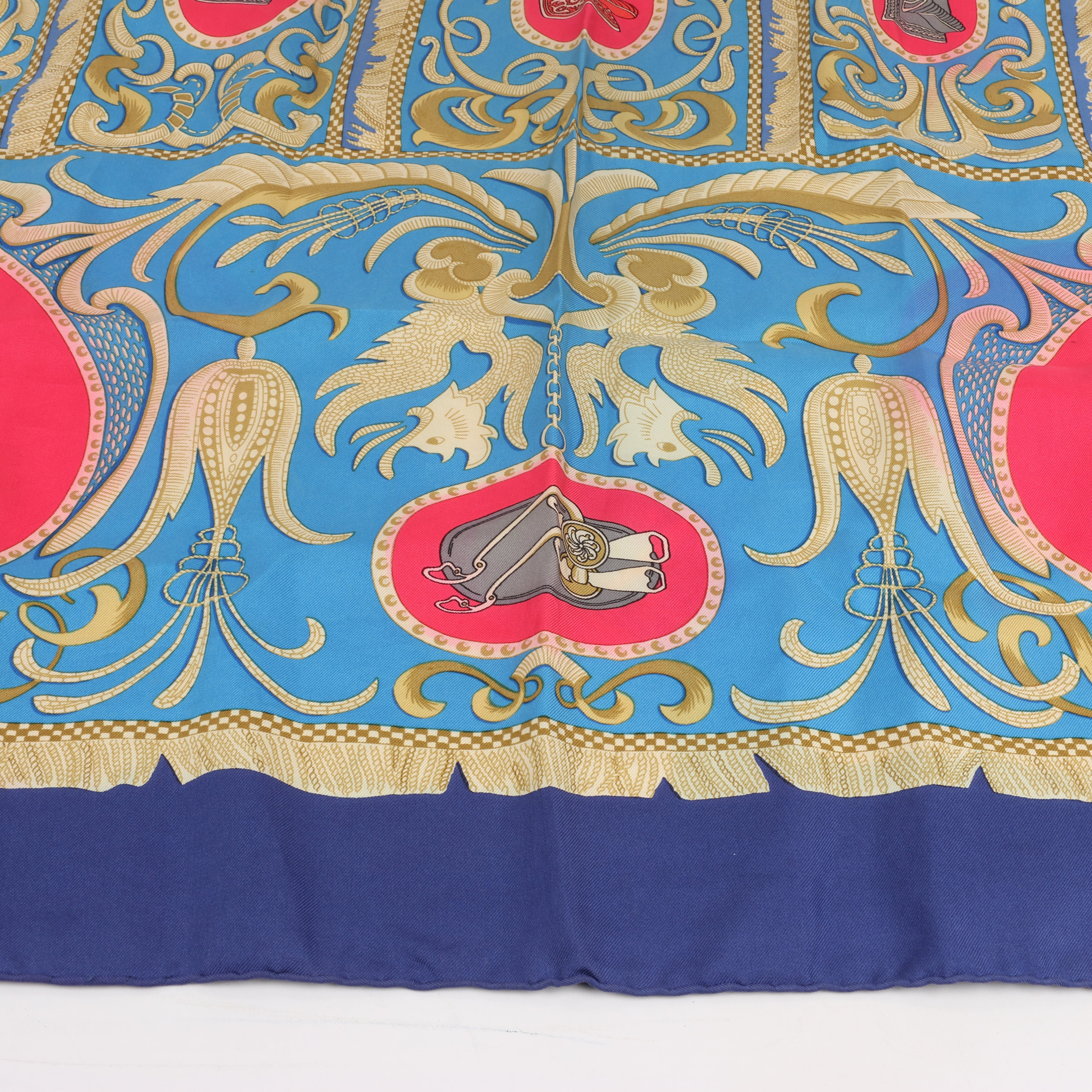 Add a touch of equestrian elegance with this Hermès Carré 90 "La Présentation" silk scarf. Featuring a regal design of horses, ornate flourishes, and rich gold detailing on a navy blue and pink backdrop, this 100% silk masterpiece is a timeless statement of luxury.