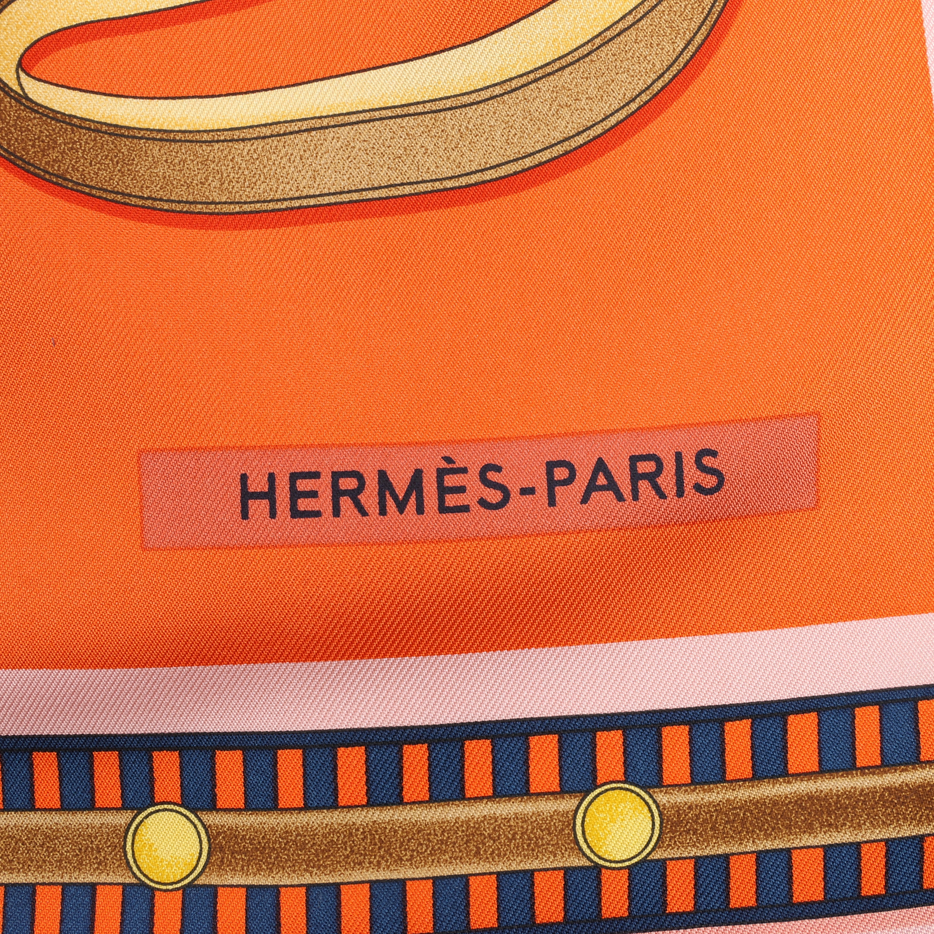 Hermès Carré 90 “Lettres Equestres” scarf in 100% silk, featuring bold equestrian-inspired lettering and tack details on a vibrant orange background. A playful yet refined piece that captures Hermès' equestrian heritage with striking color.