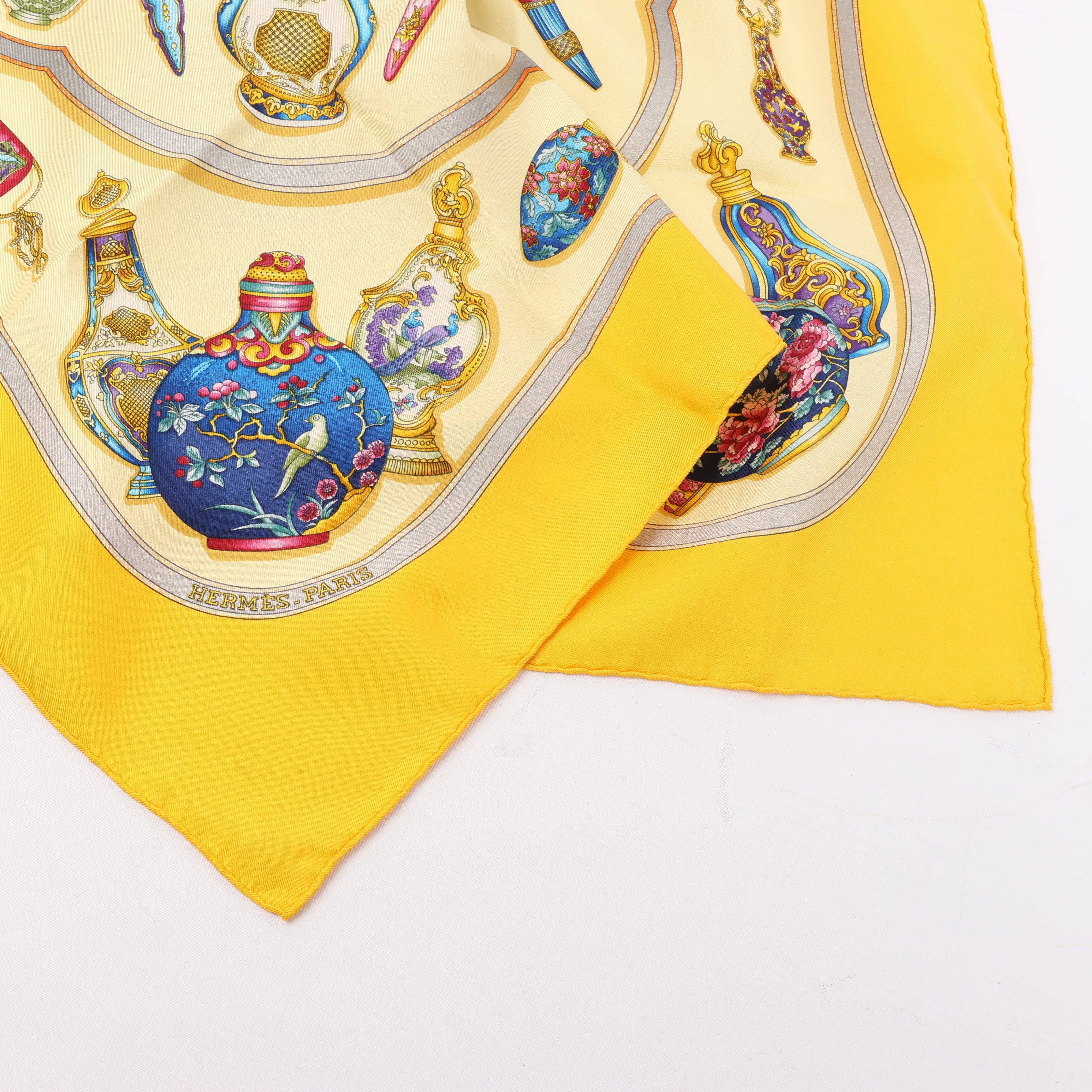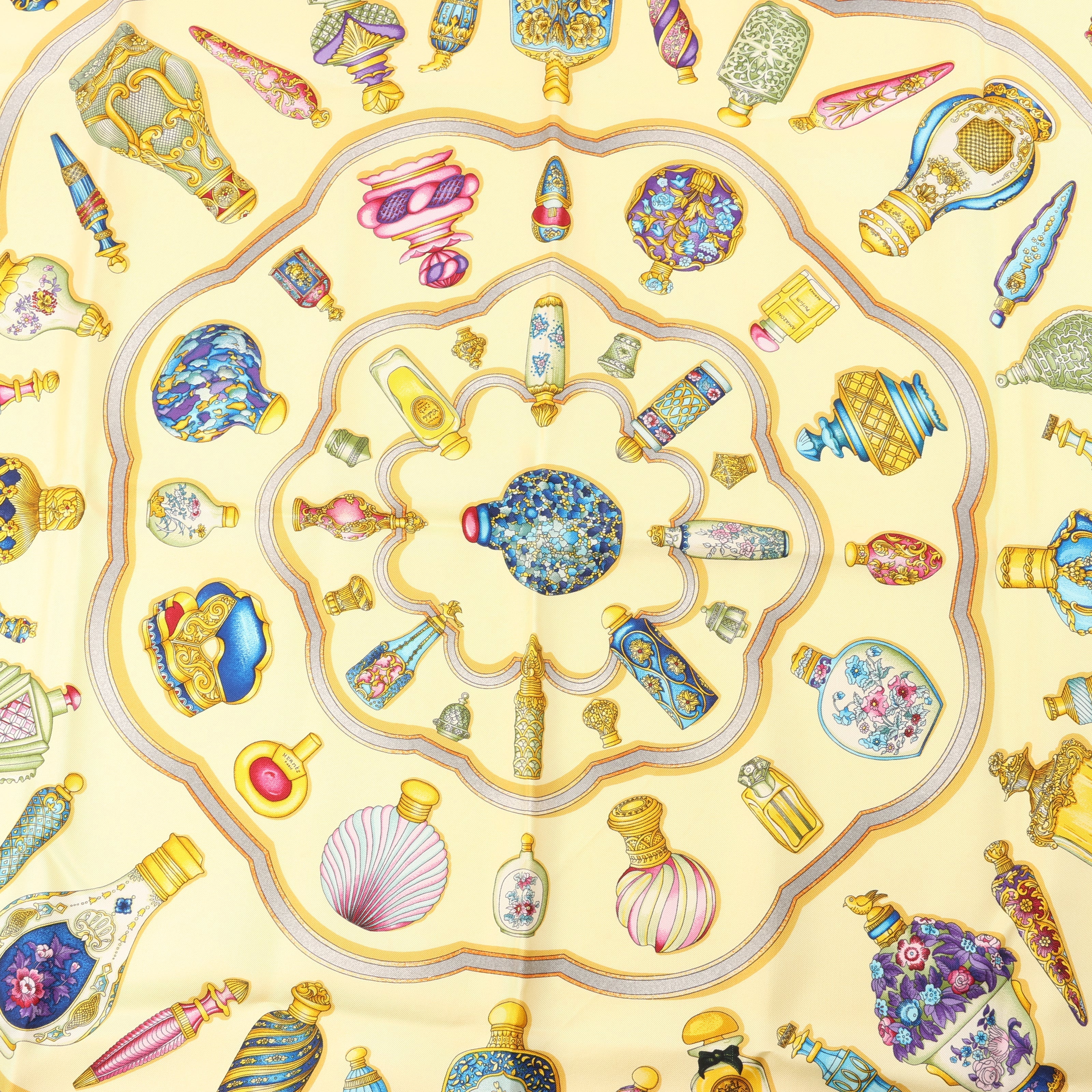 Hermès Carré 90 "Qu'importe le Flacon" silk scarf in vibrant yellow, adorned with ornate perfume bottles in radiant hues. A whimsical celebration of elegance and fragrance, perfect for adding a joyful, vintage-inspired flair to your ensemble.