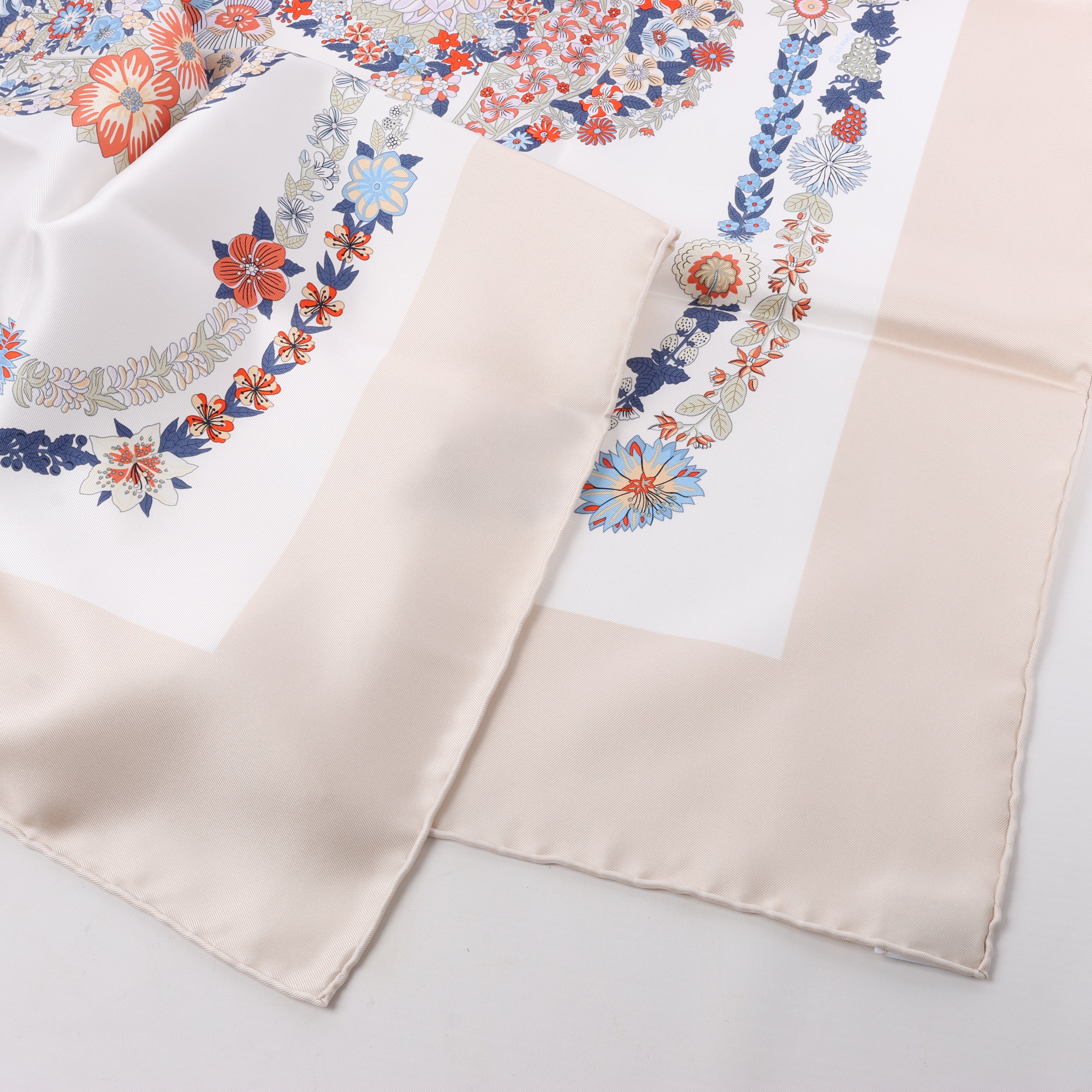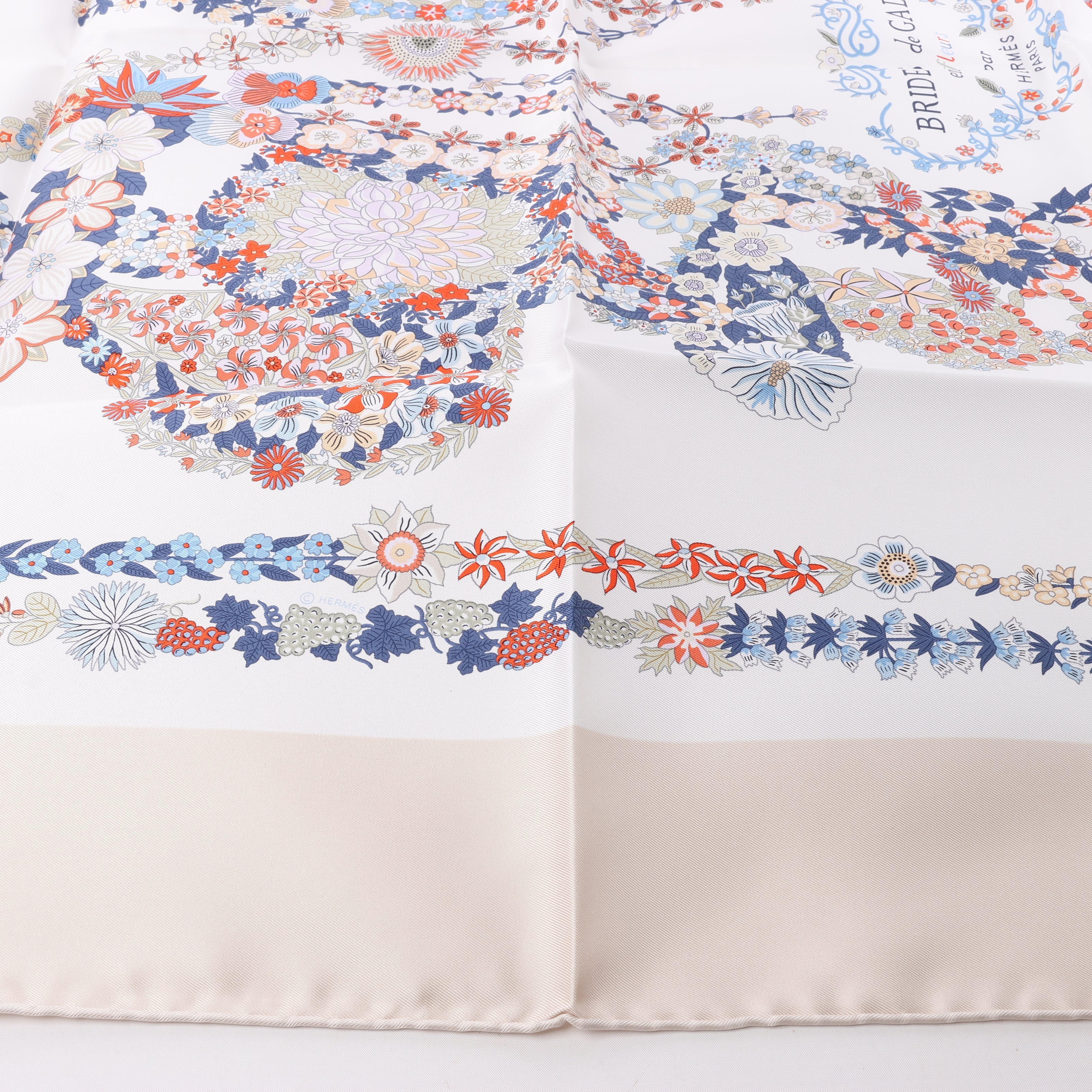 Hermes Hermès Carré 90 "RIDES DE GALA EN FLEURS" 100% Silk Scarf in Beige