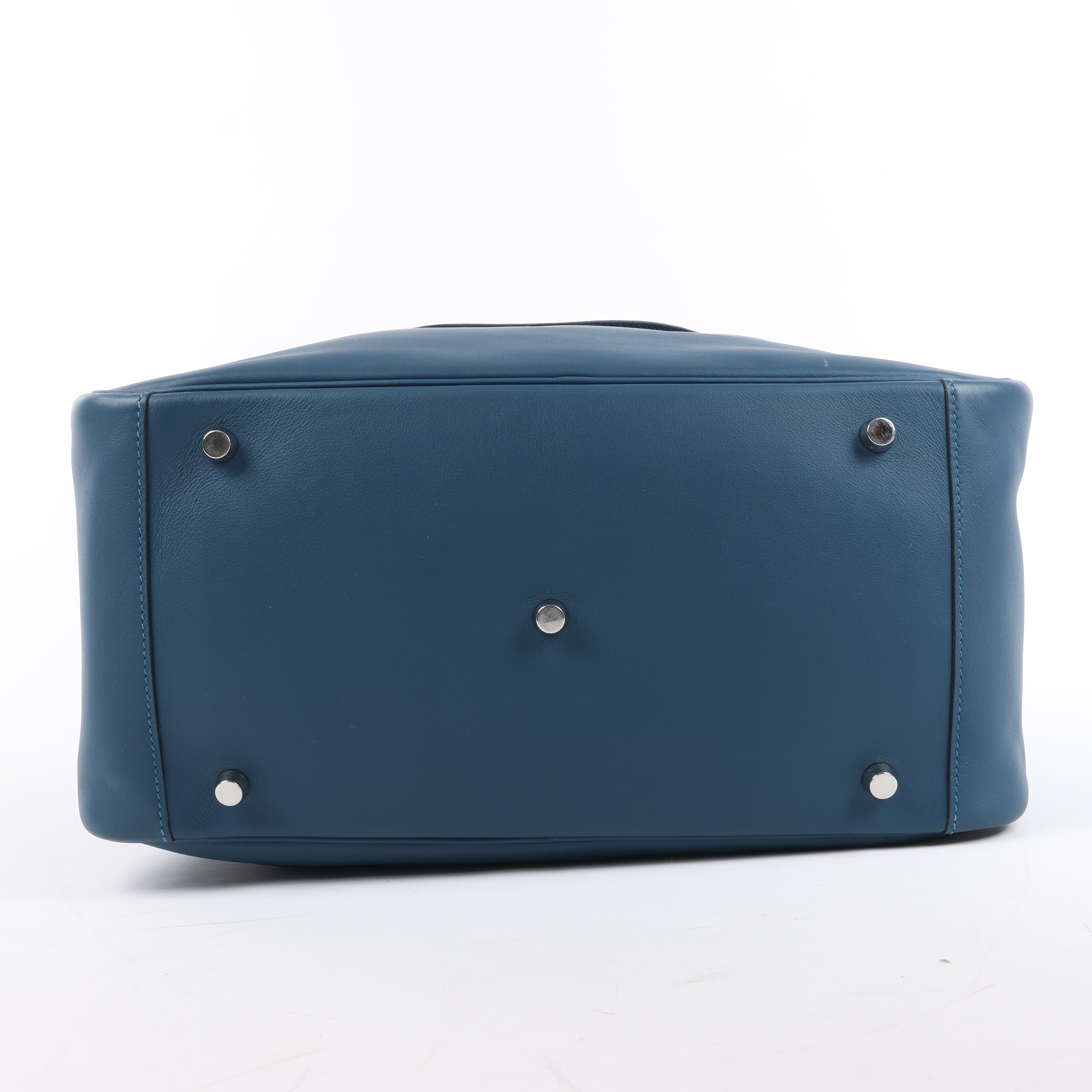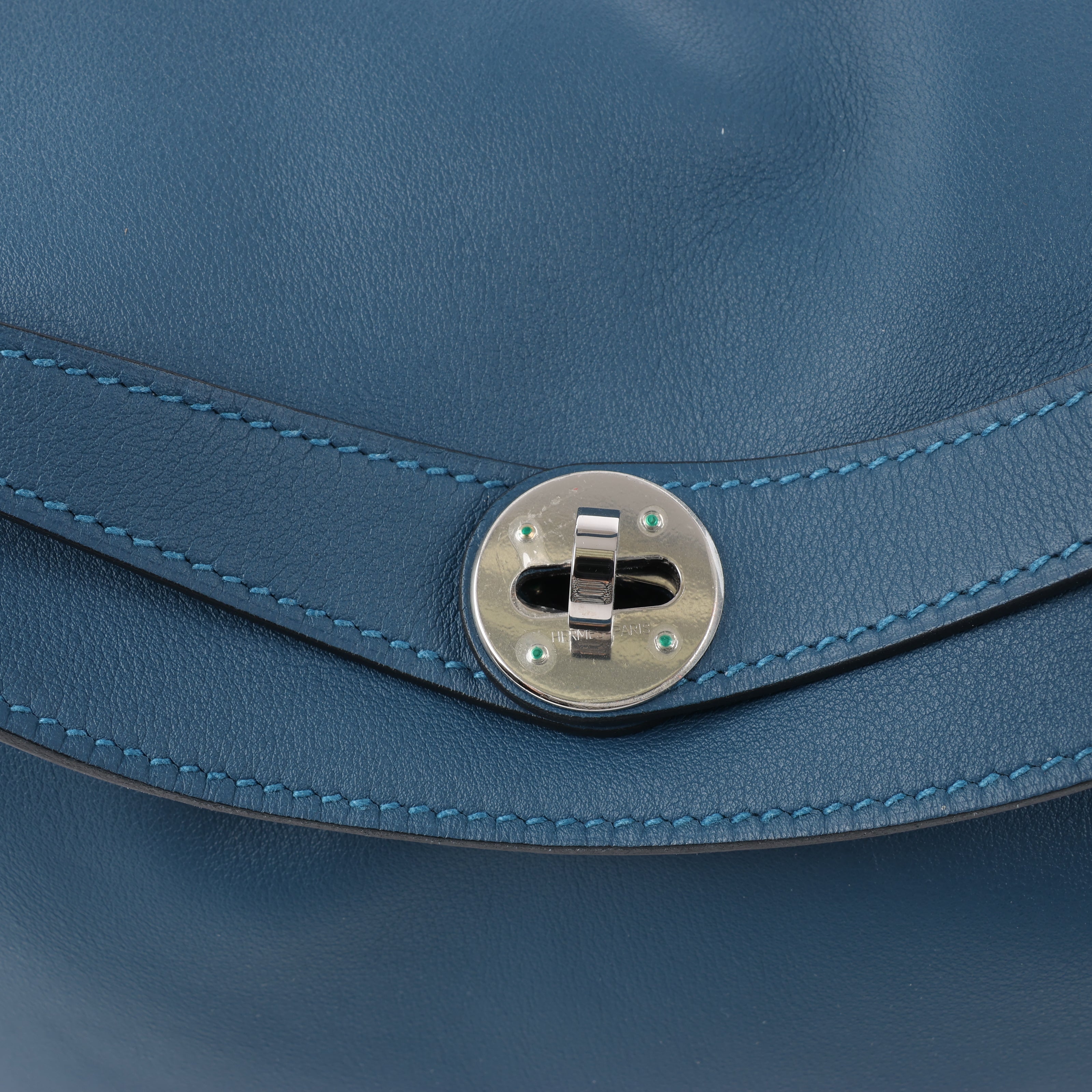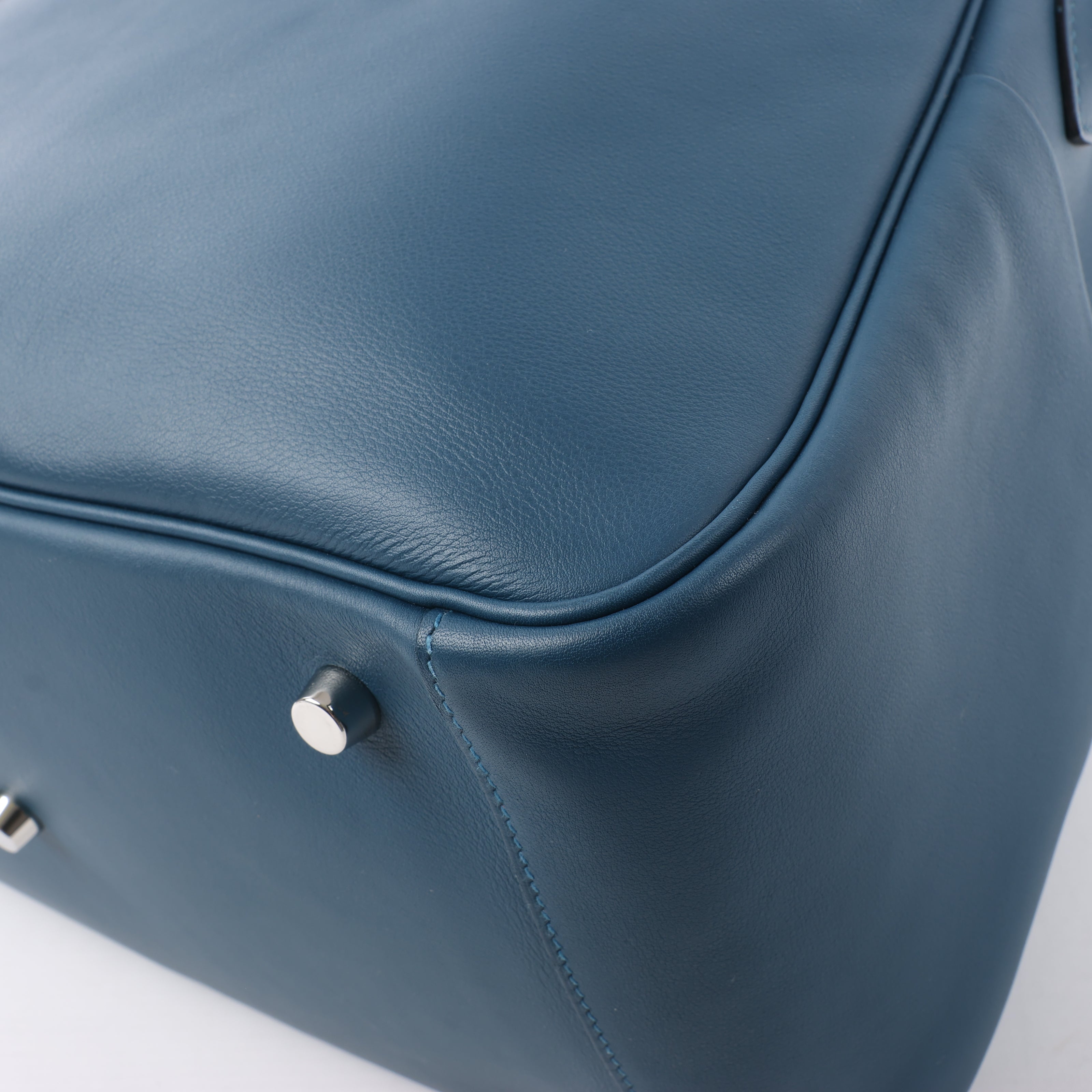 Hermès Lindy 34 in Blue de Galice Veau Swift leather exudes modern elegance with silver-tone hardware and a unique double-handle design. From 2014 (□R), this 2-way handbag is a refined blend of luxury and functionality.