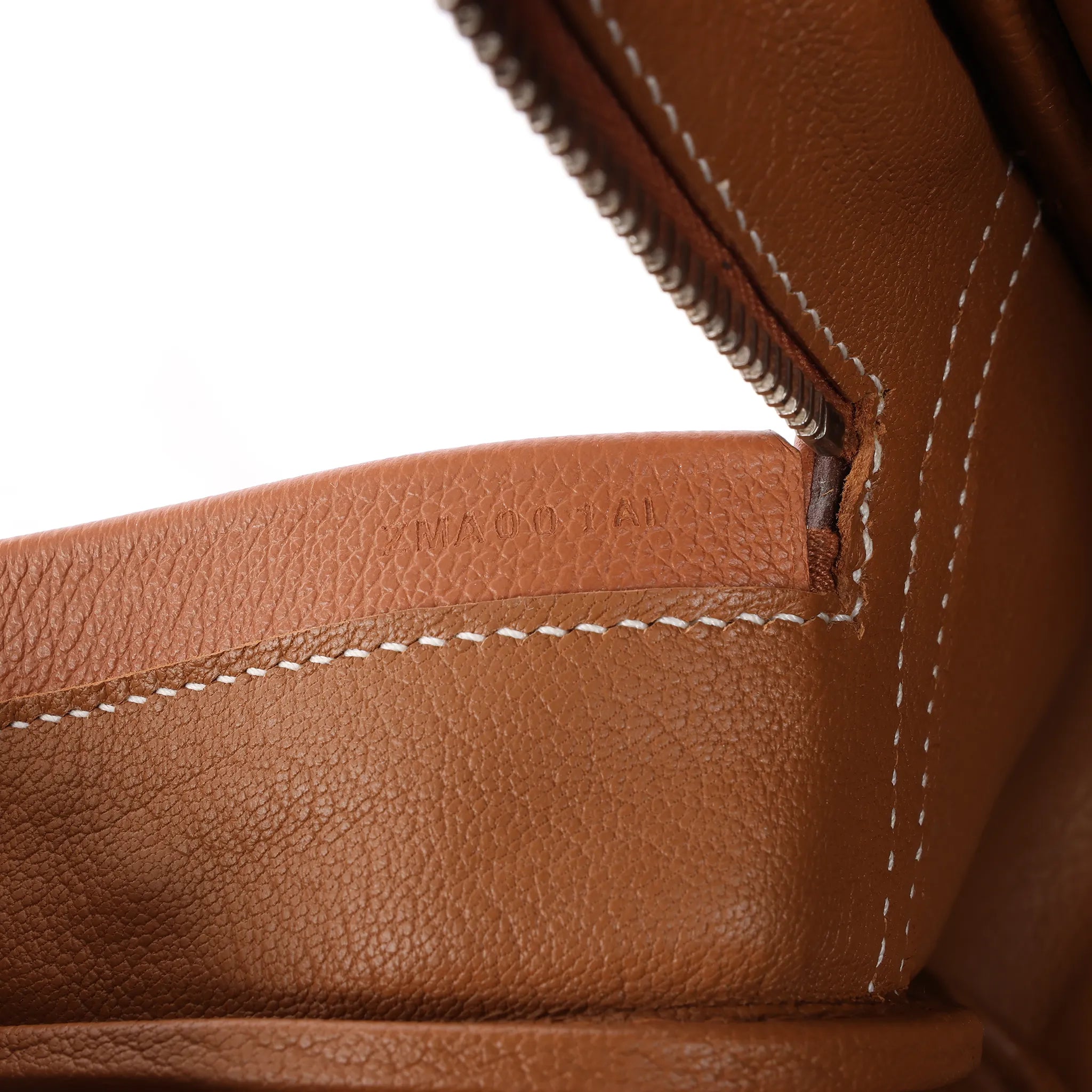 The HERMÈS Plume 40 Handbag in Gold Evercolor leather (Z: 2021) is a timeless piece of elegance. Featuring refined silver-tone hardware and precise white contrast stitching, it’s perfect for sophisticated daily use or travel in classic luxury.