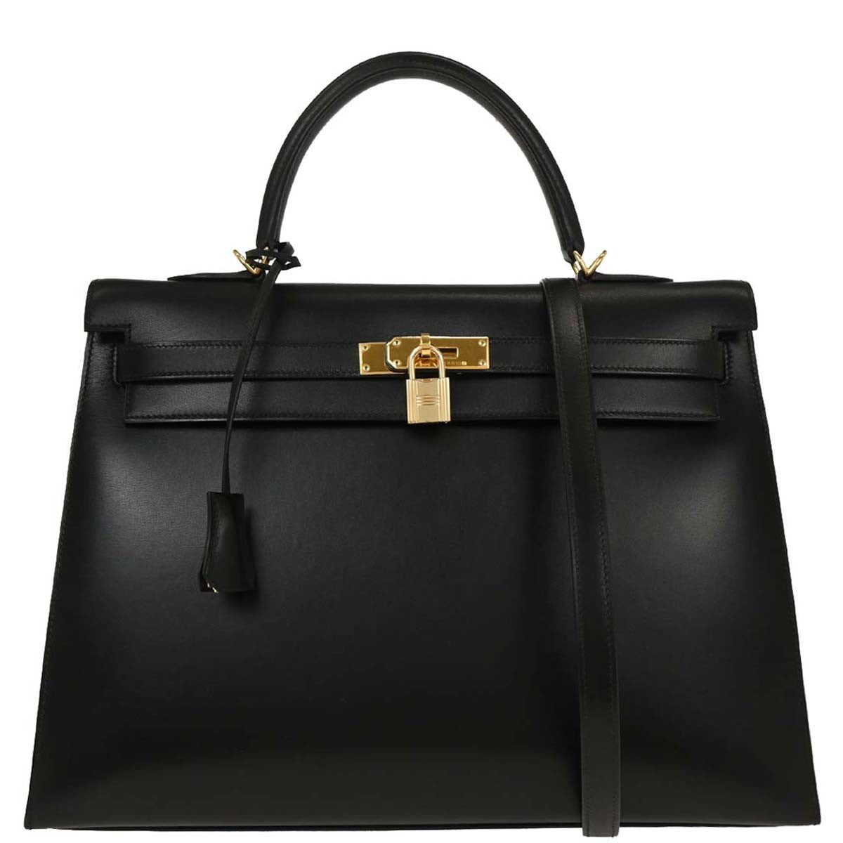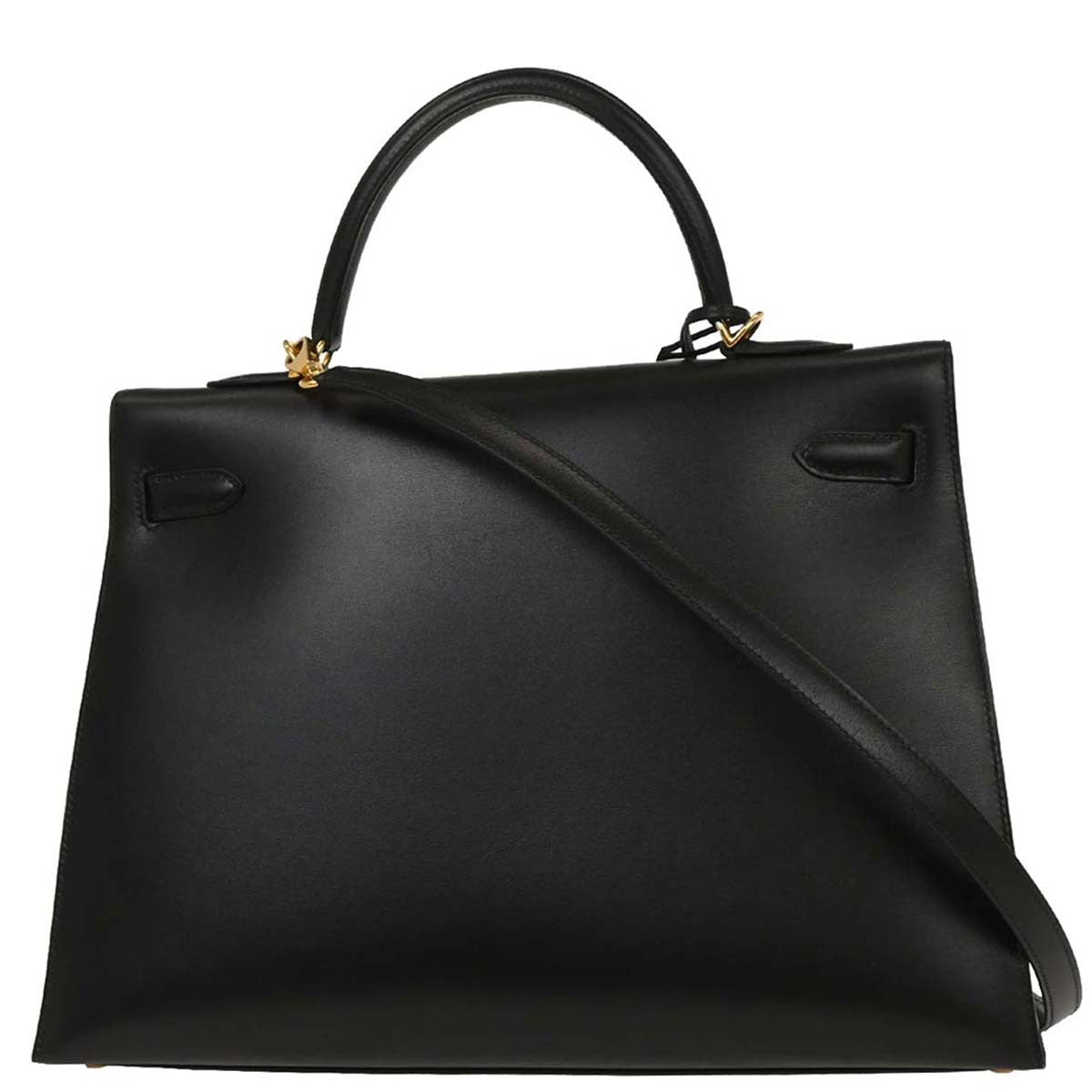 Brand : Hermes Model : Kelly Handbag Style : Black Box Calf with Gold Hardware Serial number : 65.S □E Inclusions : Shoulder strap, Padlock, Key x2, Key cover, Dust bag, Dust Bag for Shoulder Strap, Rain Cover, Box, Felt Protector, Boutique Card