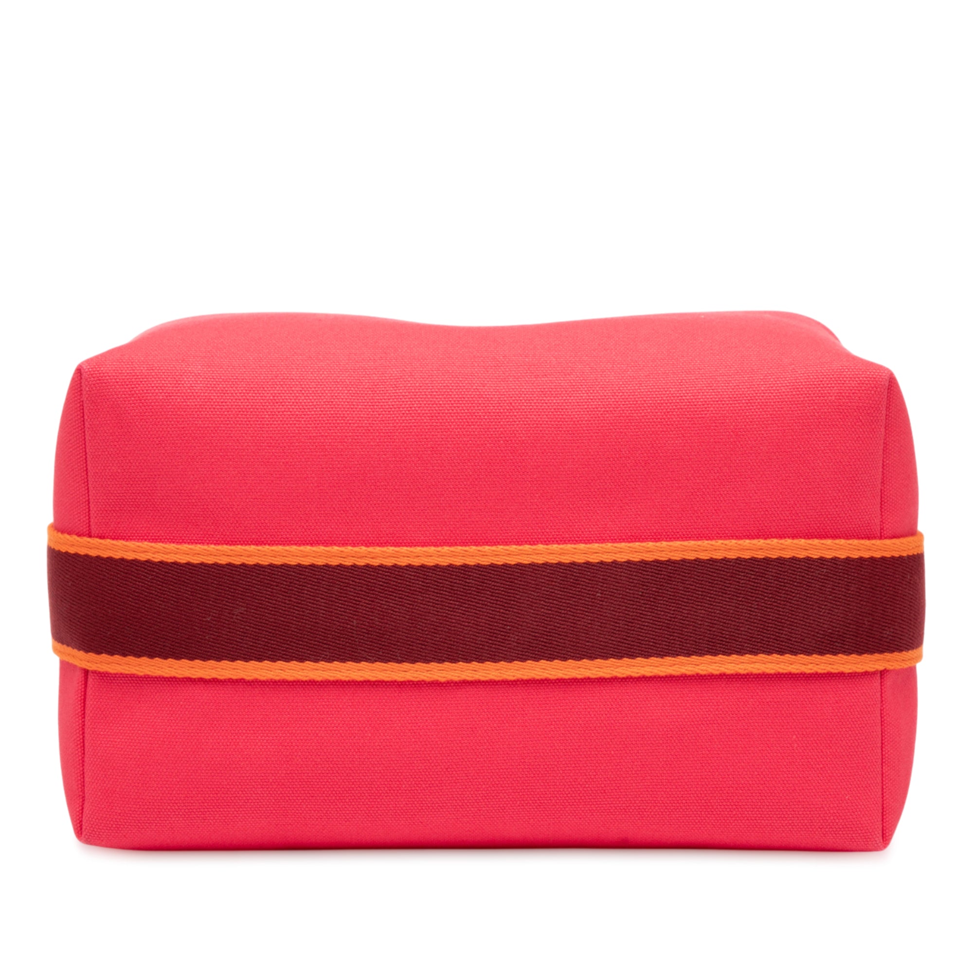 This vanity bag features a canvas body, a flat handle, a top zip closure, and interior slip pockets. Retail Price: 2900.00