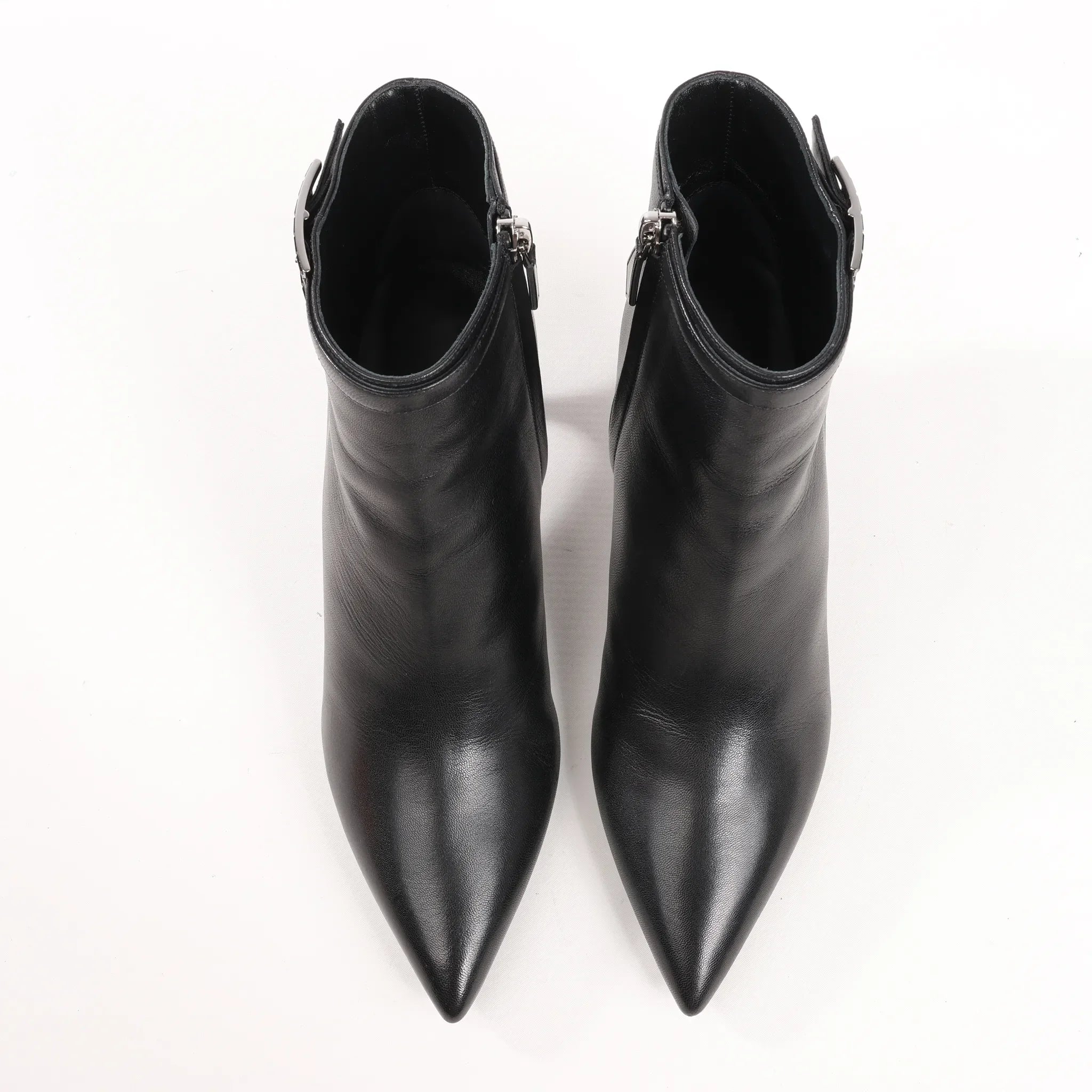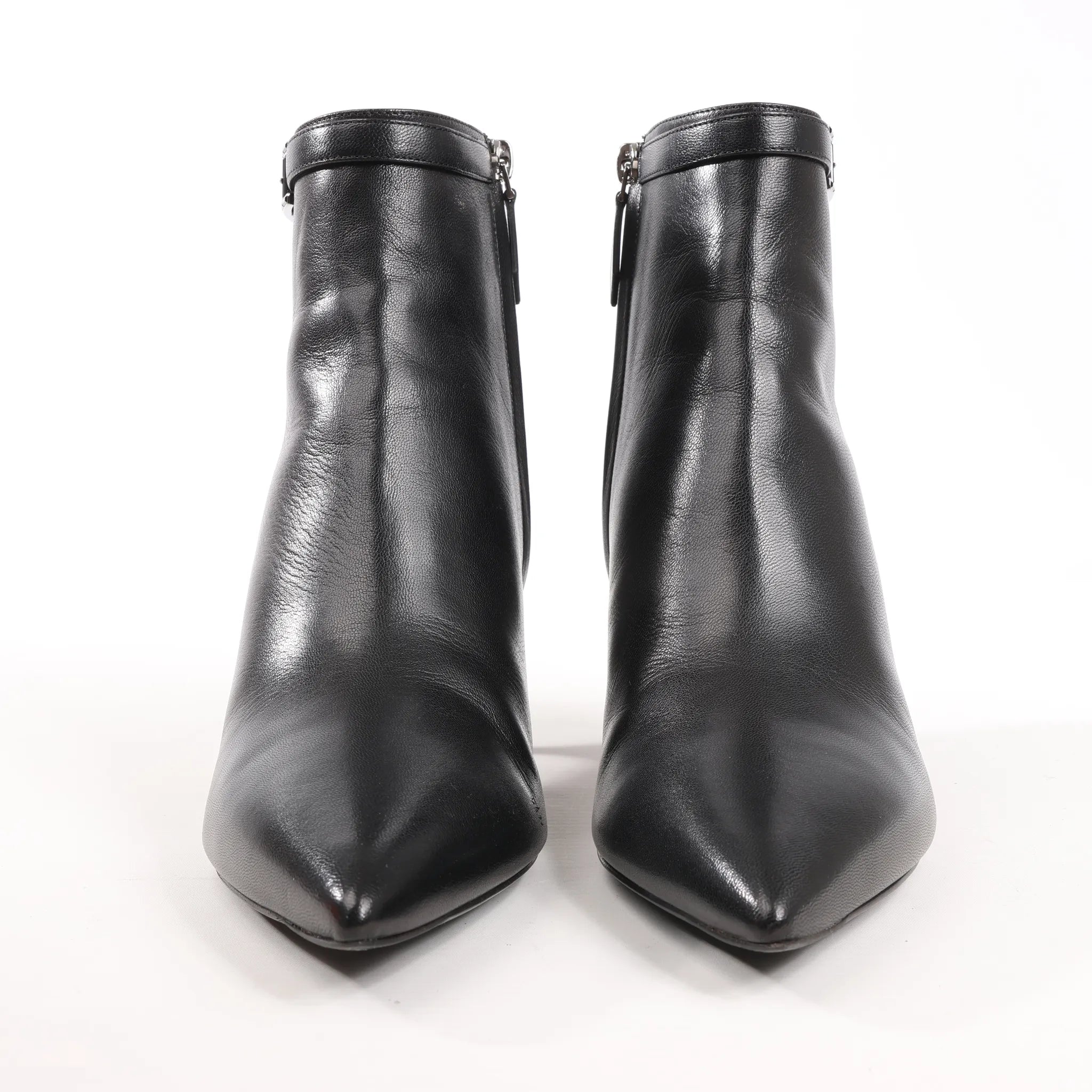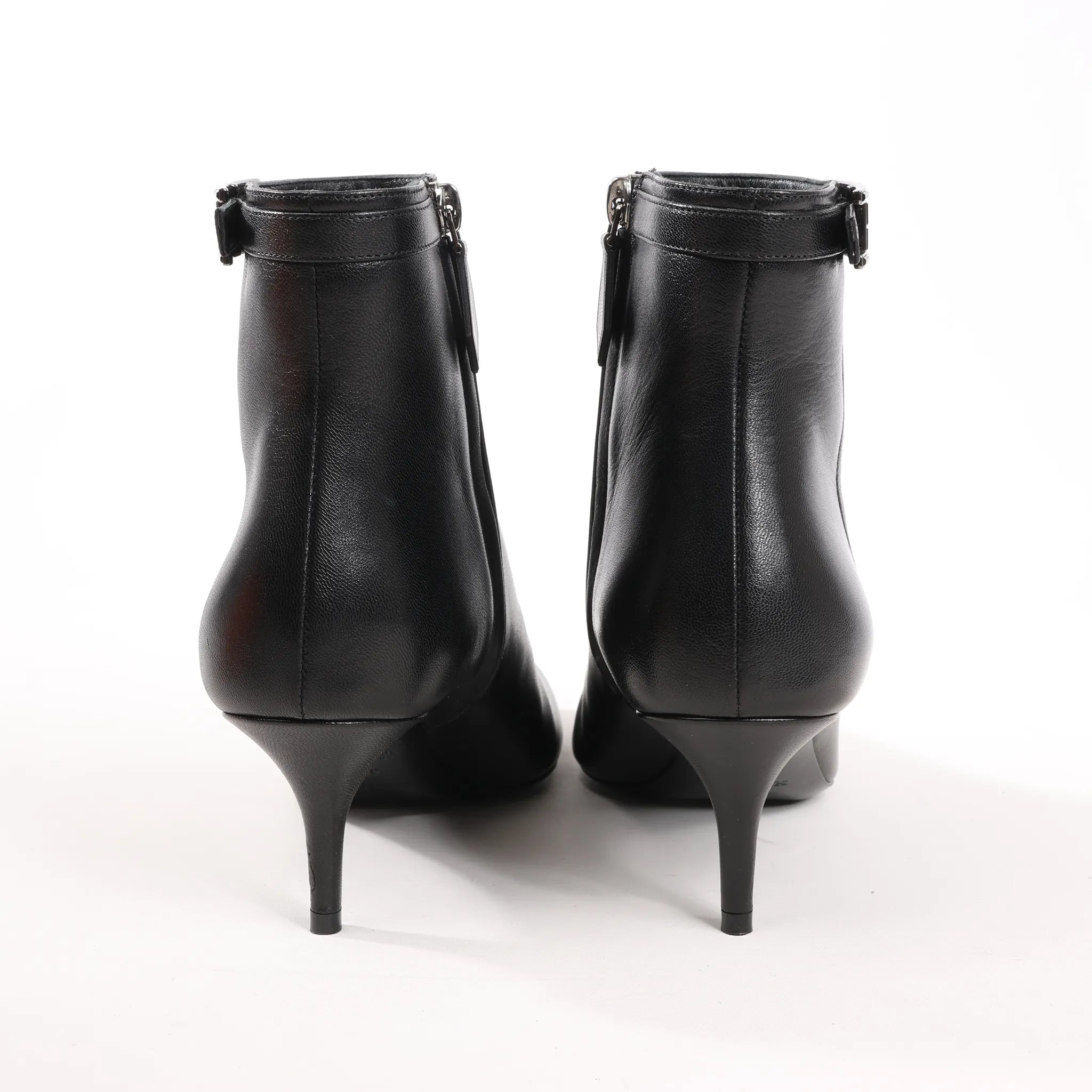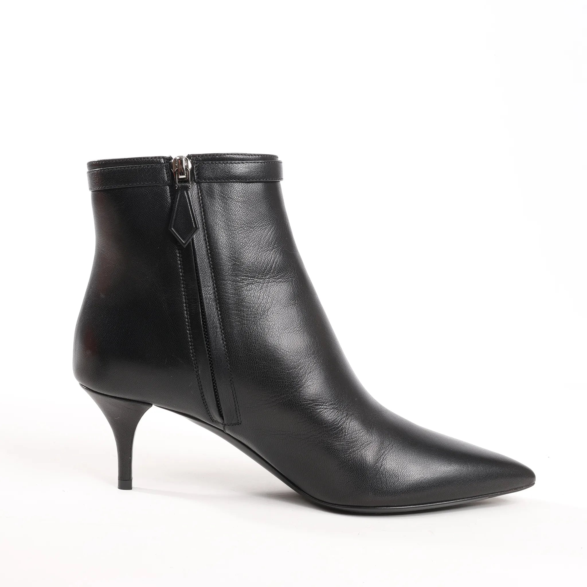 Sleek and sophisticated, these Hermès Black Leather Ankle Boots in size 38.5 EU feature a refined silhouette with a pointed toe, low stiletto heel, and signature H buckle detail - perfect for elegant, everyday style.