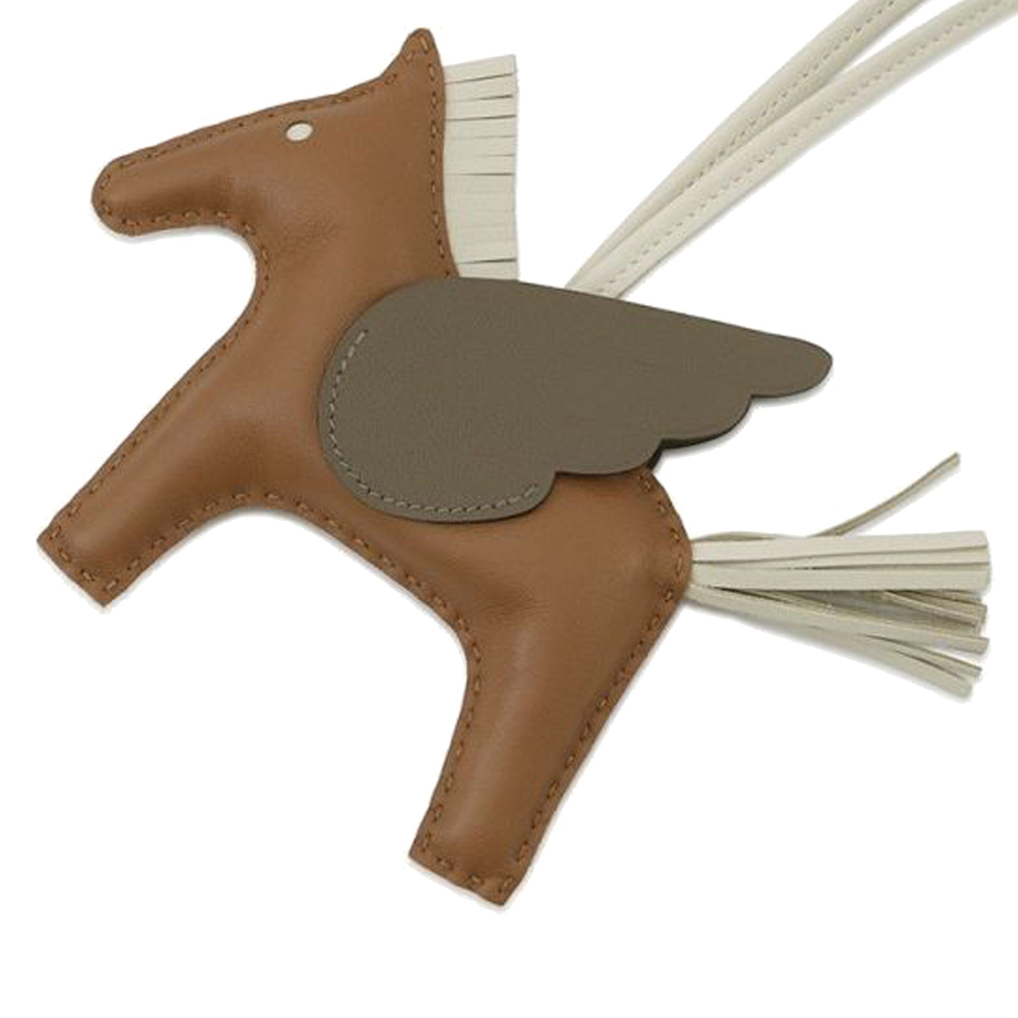 The Rodeo Pegase bag charm features a lambskin and calf leather body in Gold, Etoupe, and Craie colors, and a flat leather strap. Retail Price: 1125.00