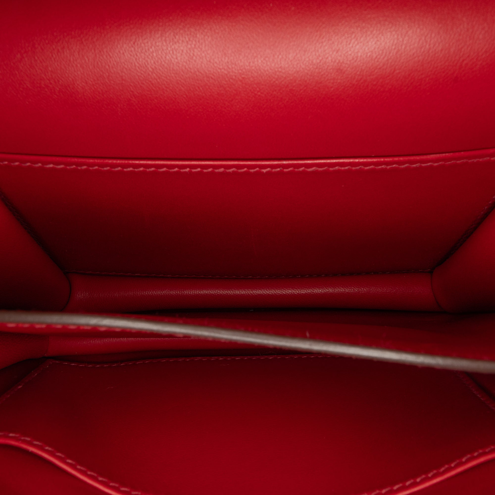 The Mini Constance features an Evercolor leather body in Rouge Casaque color, an adjustable flat leather shoulder strap, a front flap with clasp closure, and interior slip pockets. Retail Price: 18000.00