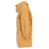 Mustard yellow Hermès parka-style 90 coat with embroideries. Stand-up collar with drawstring and hood, front fastening with double slider and leather pullers, internal drawstring at the waist, front welt pockets with zip, raglan sleeves and buttoned cuffs. Lightly padded.