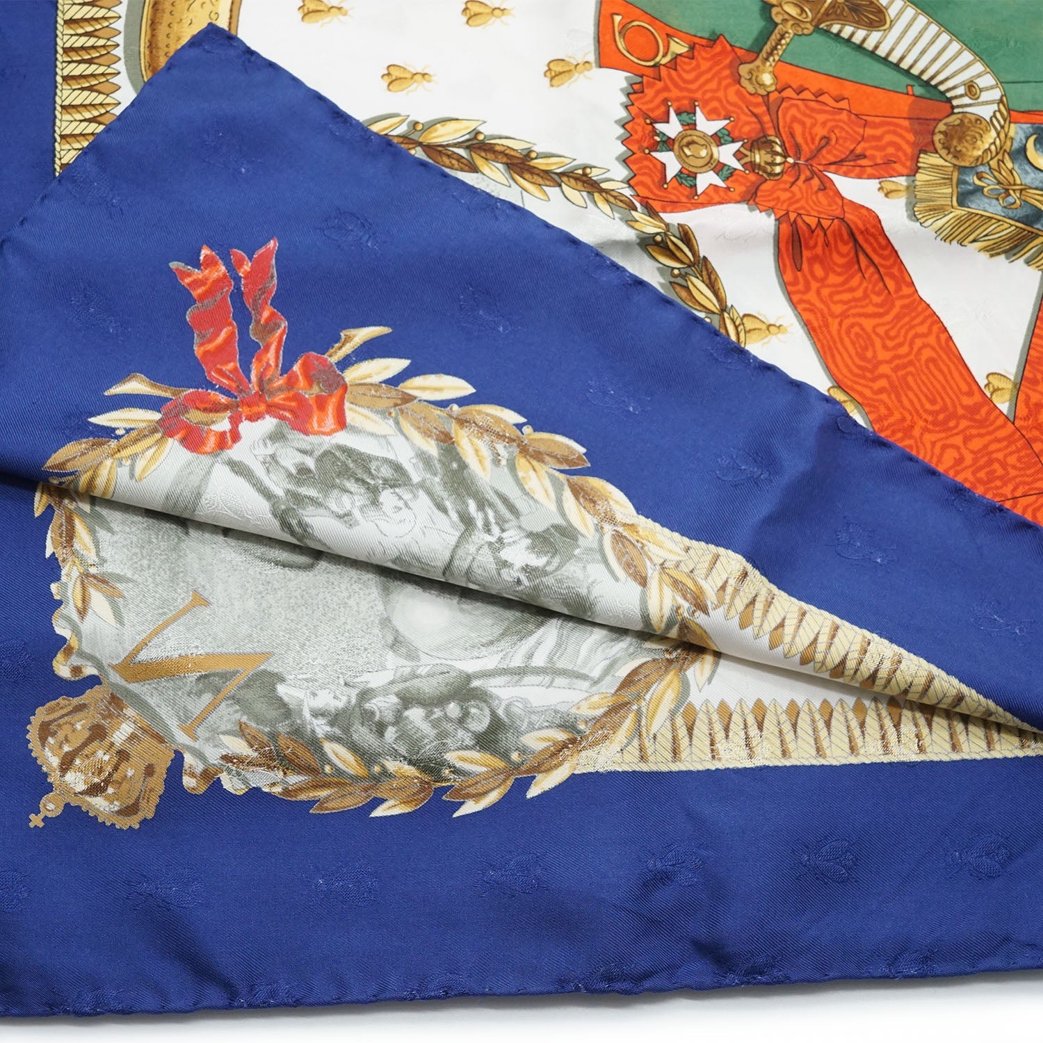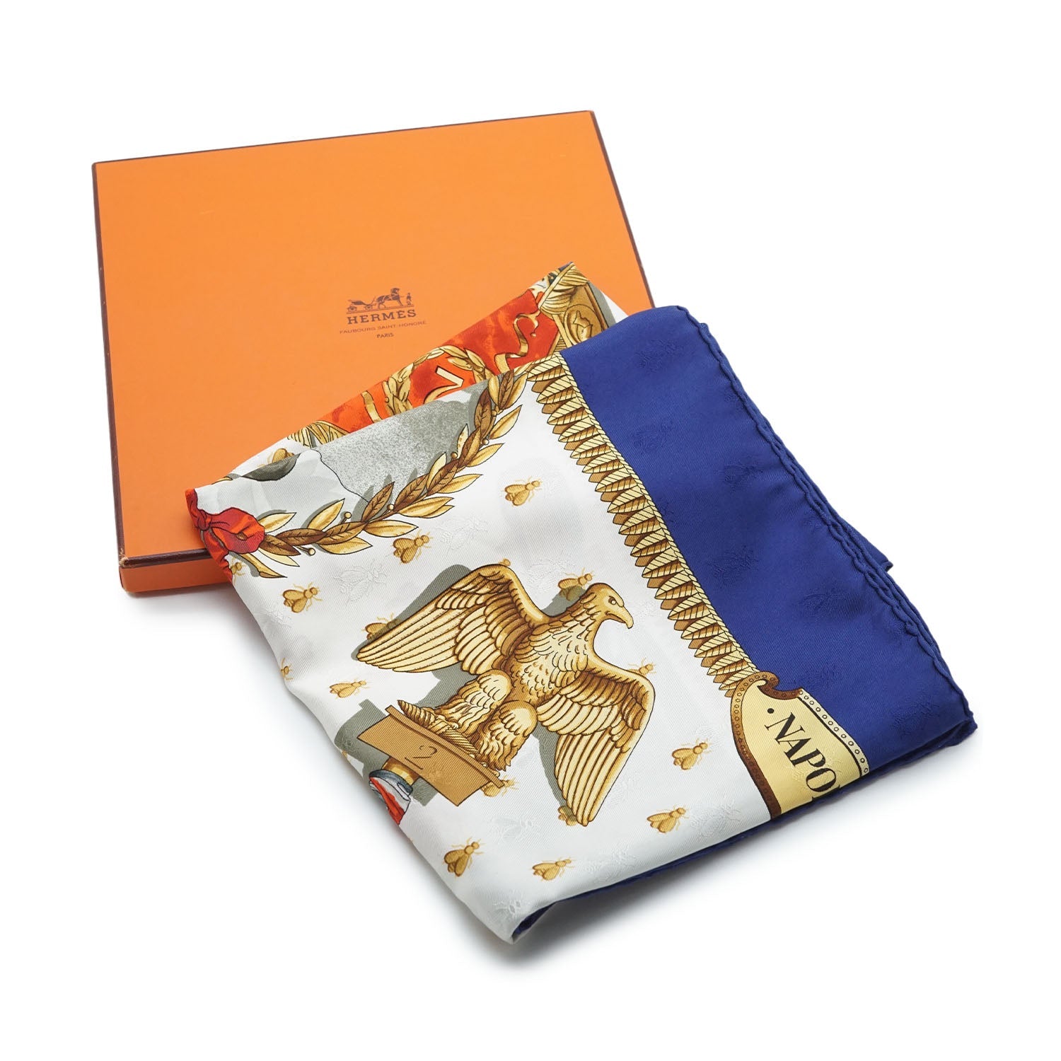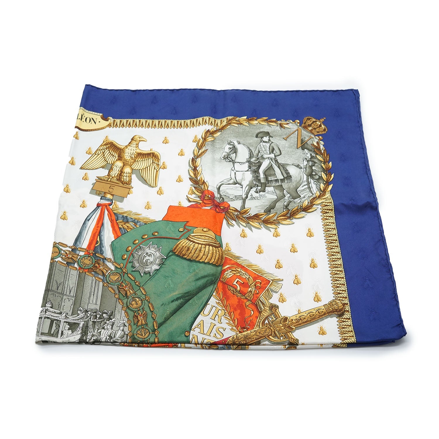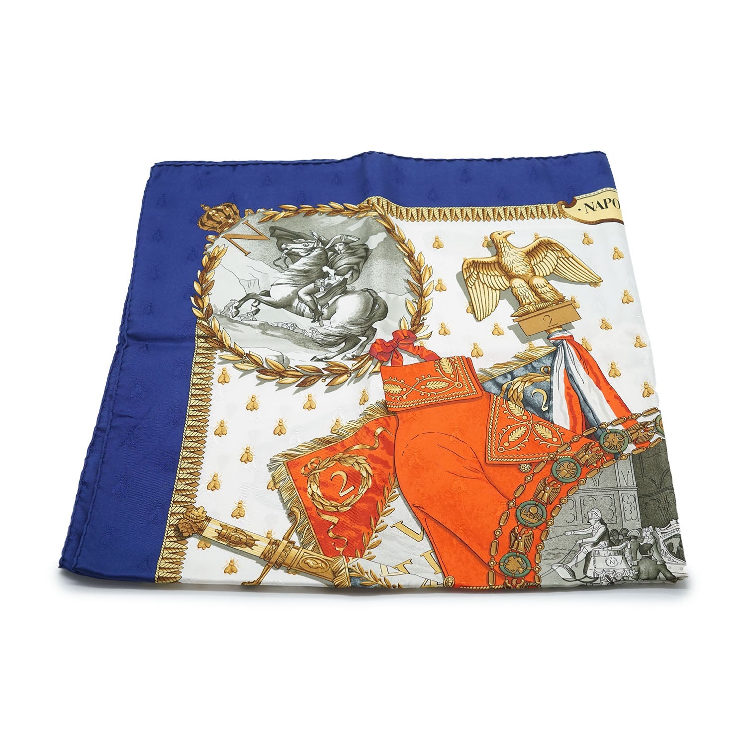 Napoleon Silk Carre 90 Blue SilkHeight: 88cmWidth: 88cmStain: Stain/discoloration mark on the front print (green section)Include: Box