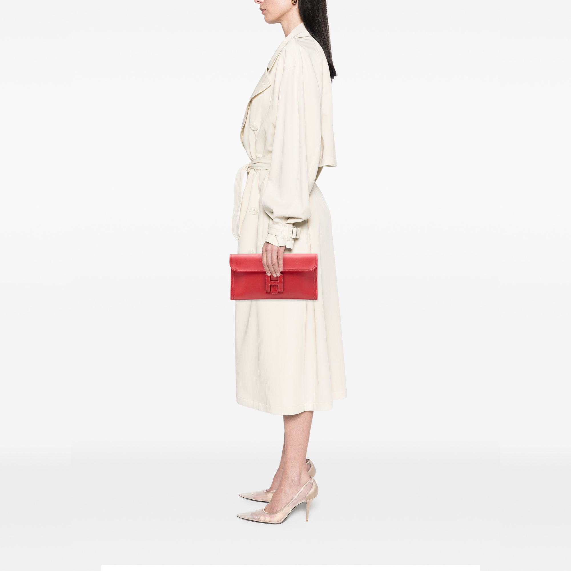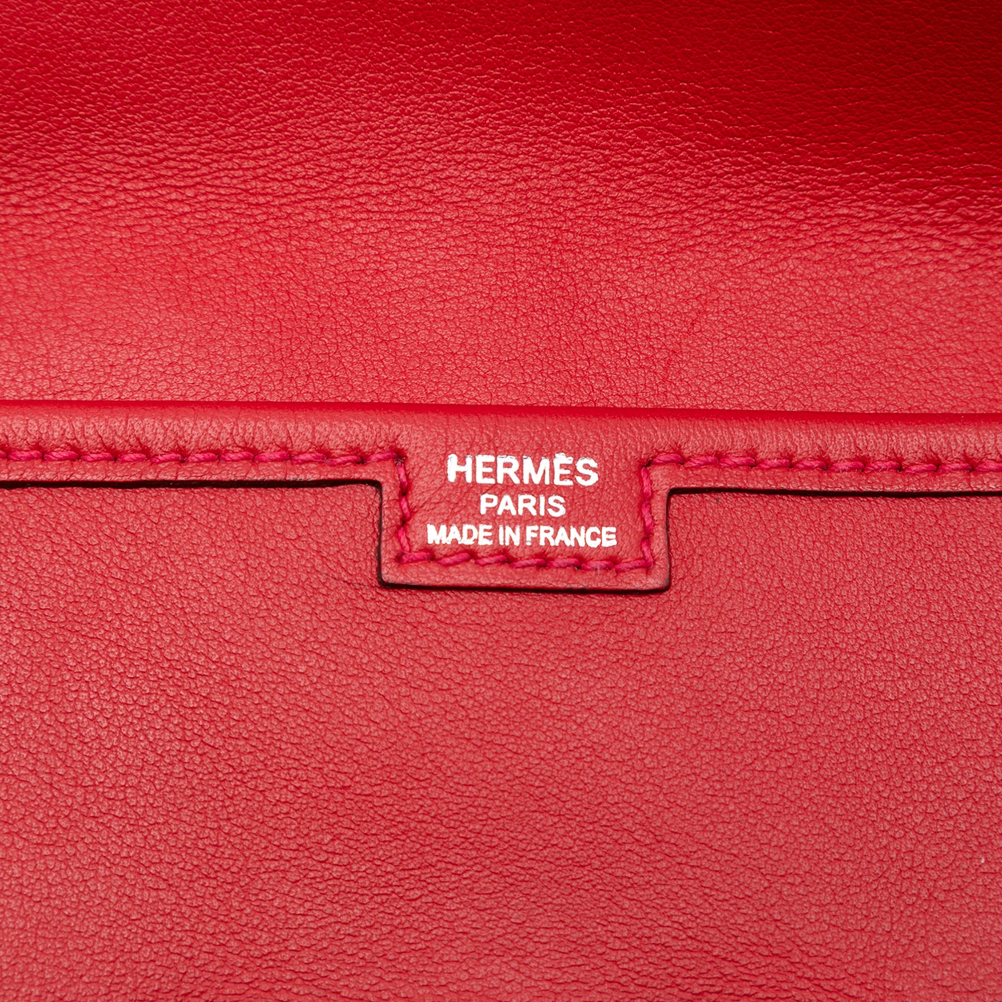 This Jige Elan features a Swift leather body in Rouge Casaque color and a front flap with a pull-through closure. Retail Price: 3875.00