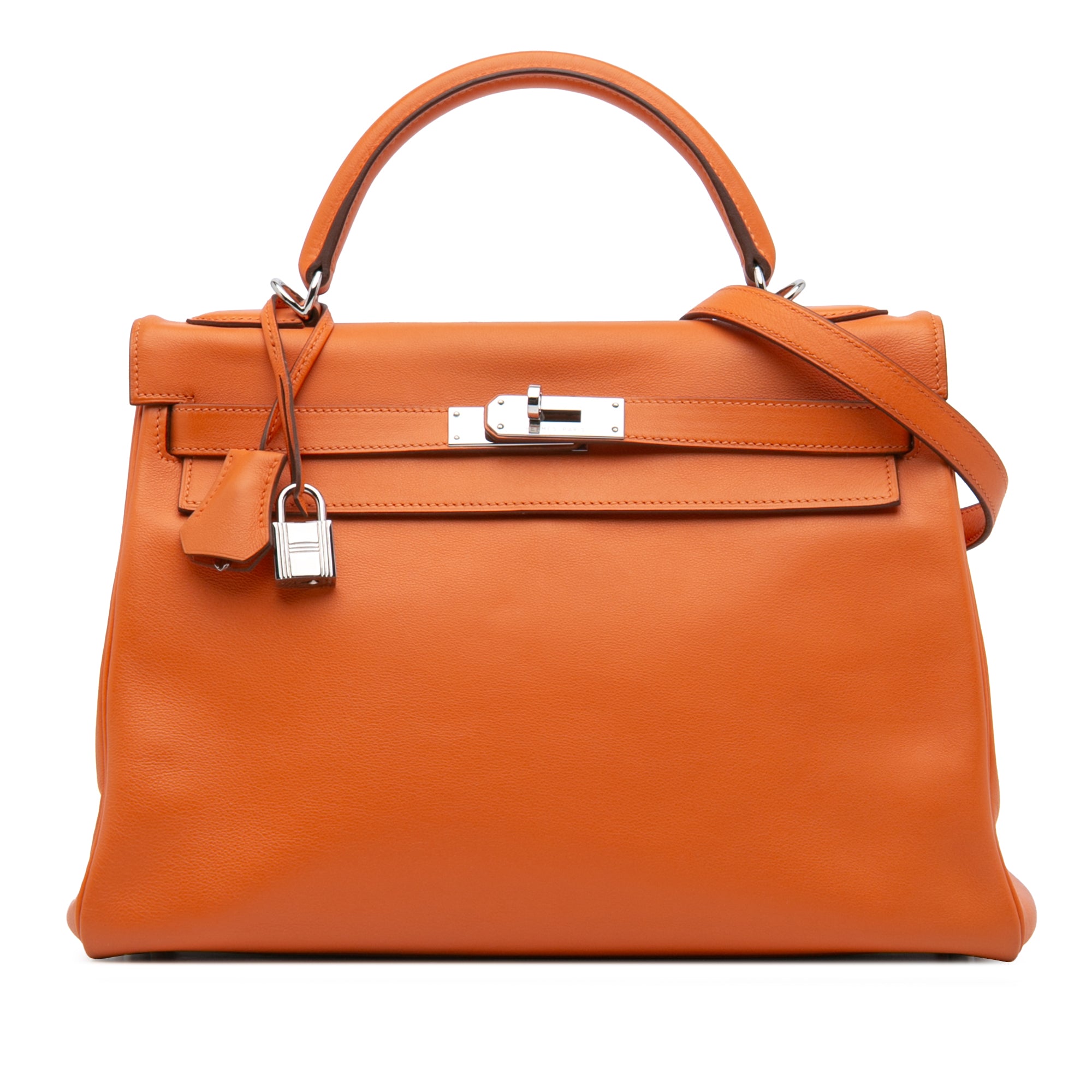 The Kelly 32 features a Swift leather body in Feu color, a flat leather top handle, a detachable flat leather shoulder strap, a front flap with twist lock closure, and interior zip and slip pockets. Retail Price: 20550.00