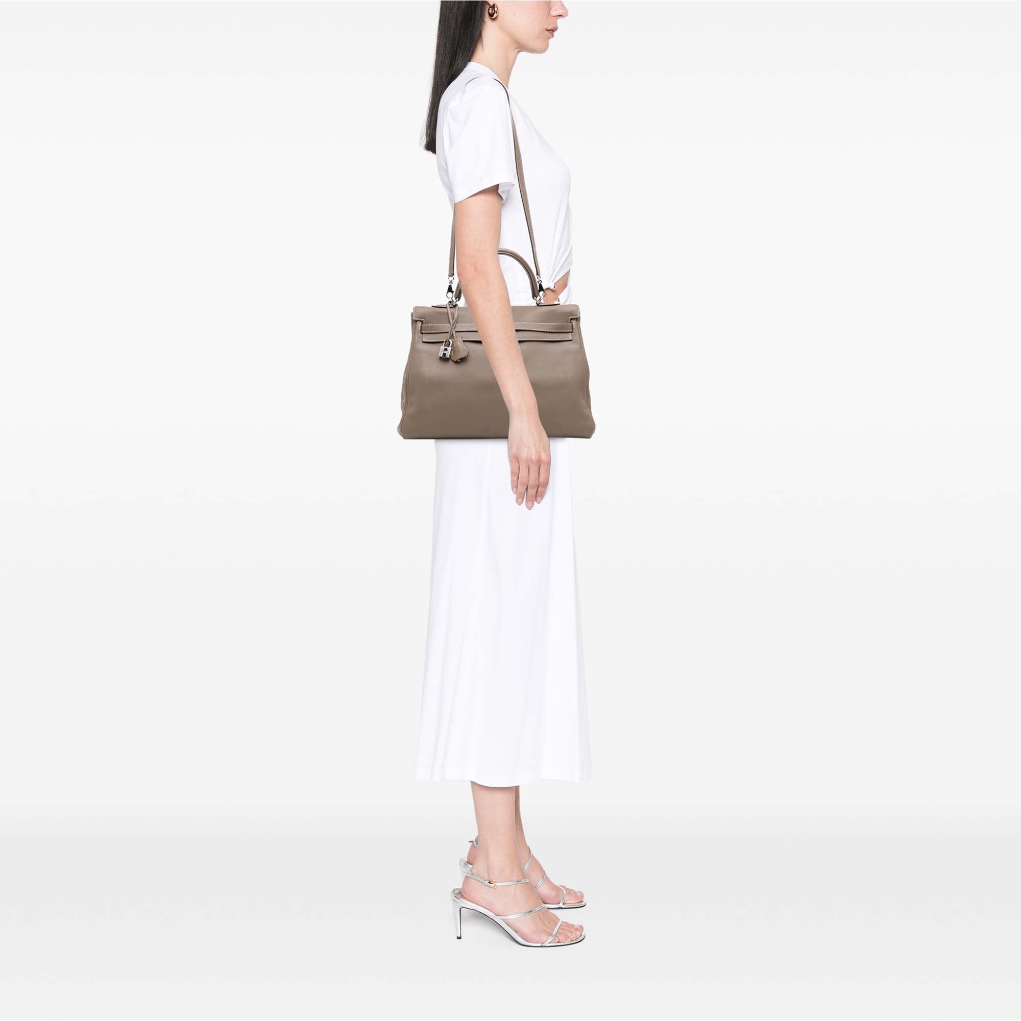This Kelly 35 features a Swift leather body in Etoupe color, a flat leather top handle, a detachable flat leather shoulder strap, a front flap with twist lock closure, and interior zip and slip pockets. Retail Price: 12000.00