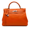This Kelly II 35 features a Swift leather body in Orange color, a flat leather top handle, a detachable flat leather shoulder strap, a front flap with twist lock closure, and interior zip and slip pockets. Inclusion: Dust bag. Retail Price: 12000.00