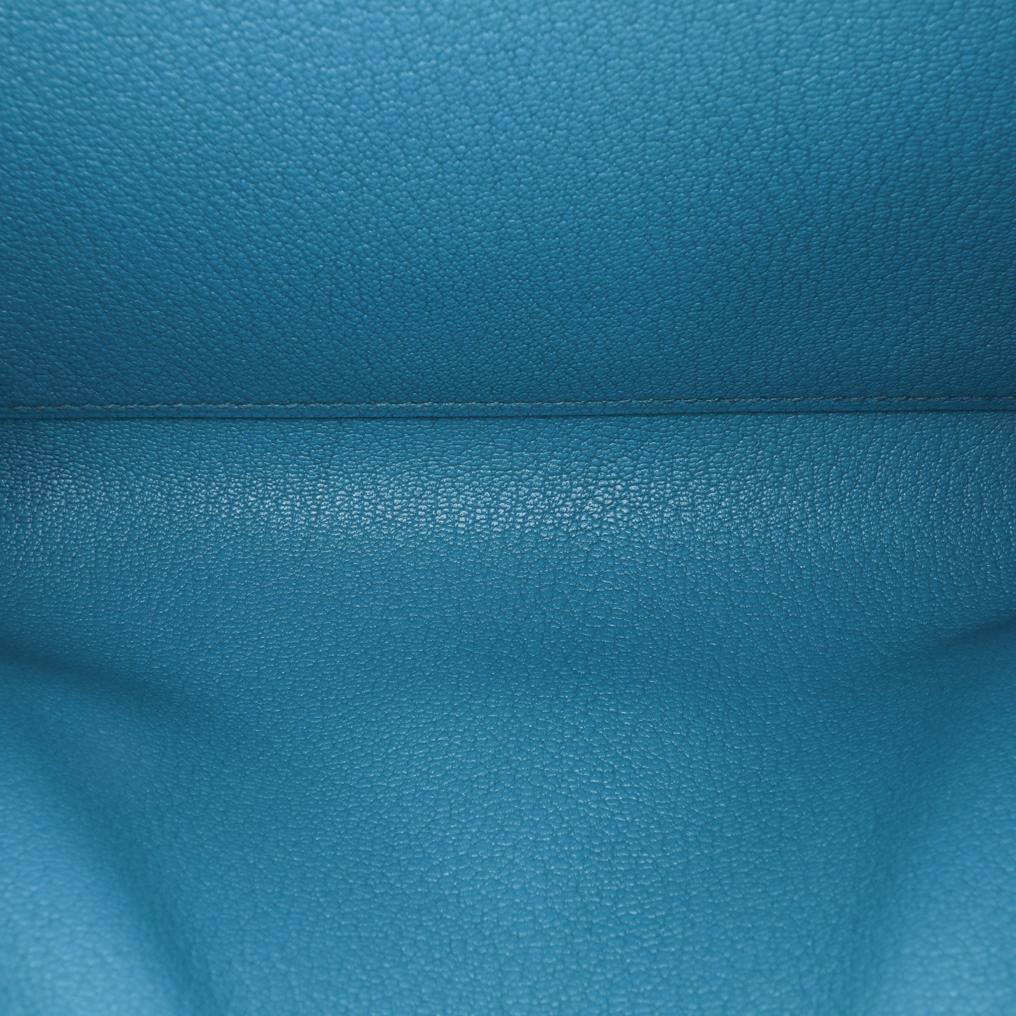 This clutch bag features a leather body in Blue Izmir color, a front flap closure, and an interior slip pocket. Retail Price: 11000.00