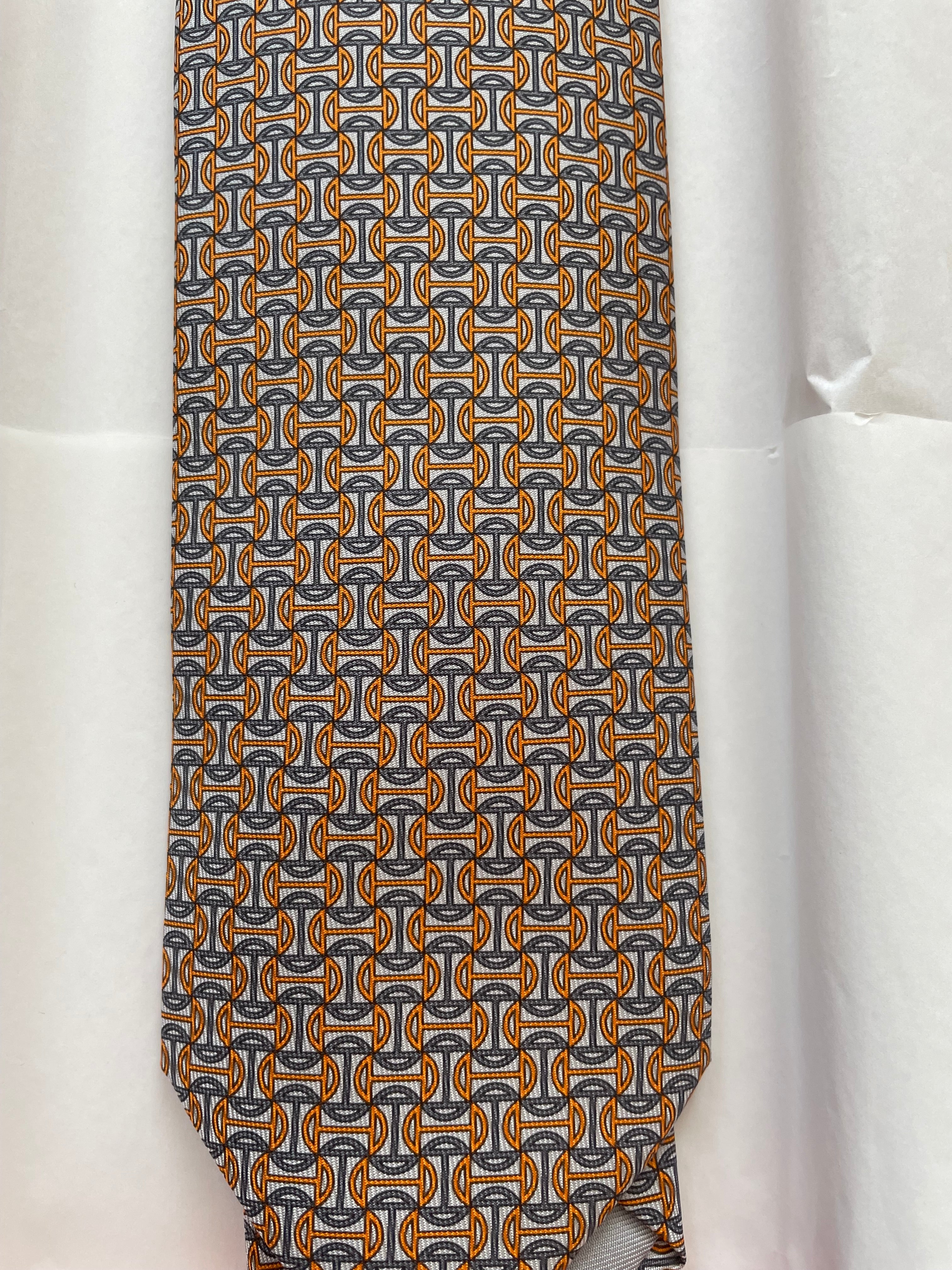 Hermès silk tie with orange and gray patterns. Never worn. Measures approximately 7.5cm wide at the widest point. Sold with box and tissue paper. Shop value €245